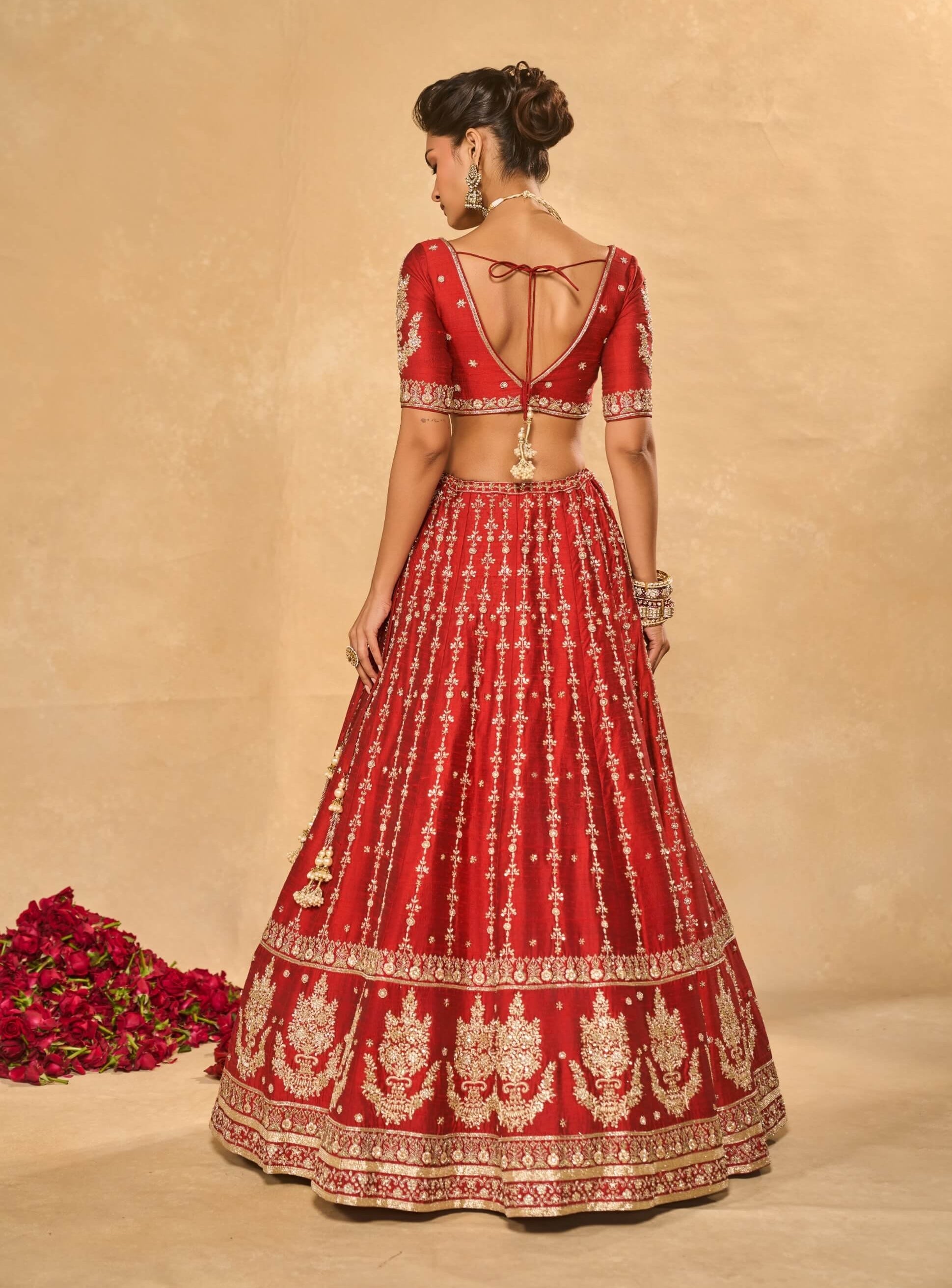 Opulent and classic, this red raw silk lehenga and blouse are richly embroidered with zardozi, sequins, and glass beads. Paired with a banarasi dupatta, each piece carries unique handcrafted character. Designed for traditional grandeur. Ideal for wedding ceremonies and festive celebrations.