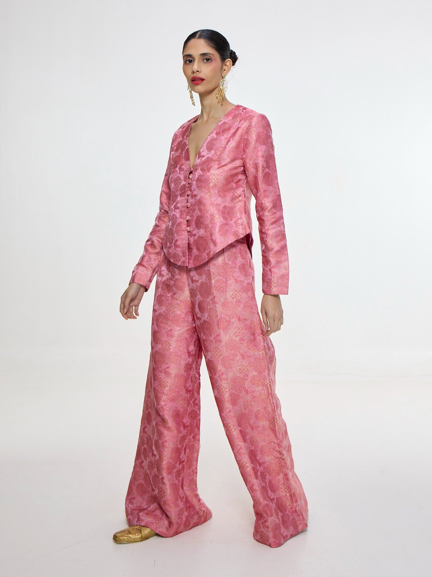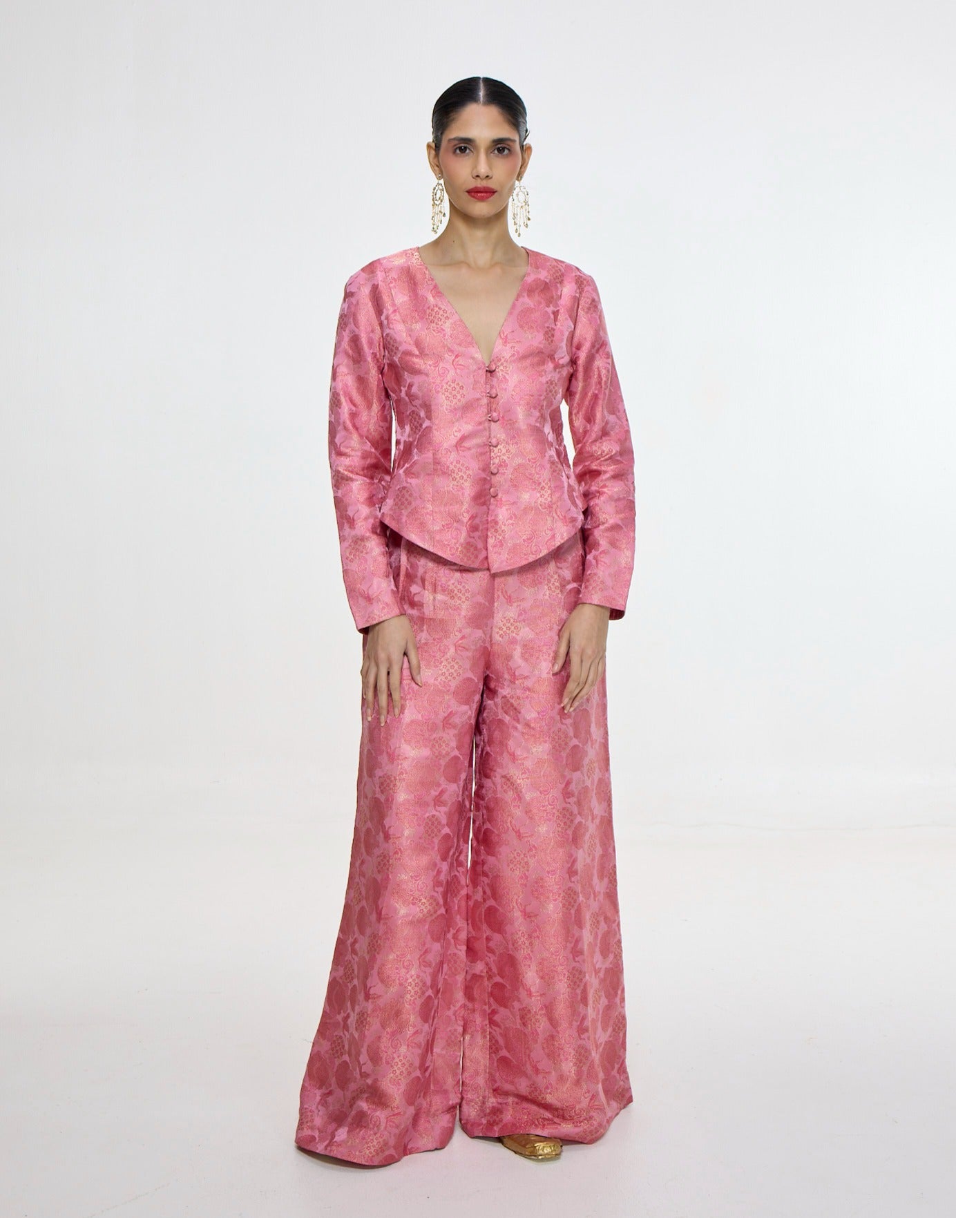 Soft, sophisticated, and crafted in Banarasi Tanchoi satin silk, this blush-pink jacket set offers a perfect fusion of structure and sheen. The full-sleeve button-down jacket and coordinated pants make for an exceptional festive ensemble, ideal for mehendi afternoons and destination weddings when dressed up with pearls, bold earrings, and a refined potli.