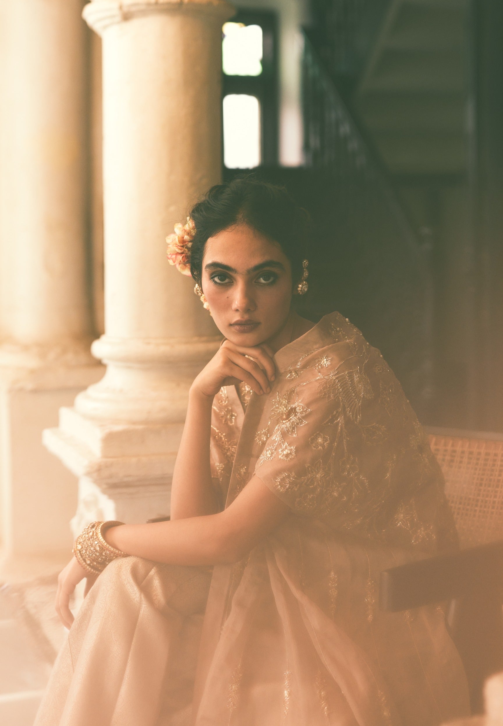 Layered with sophistication, this ensemble features a hand-embroidered organza cape worn over a richly detailed jamavar blouse and matching palazzos.