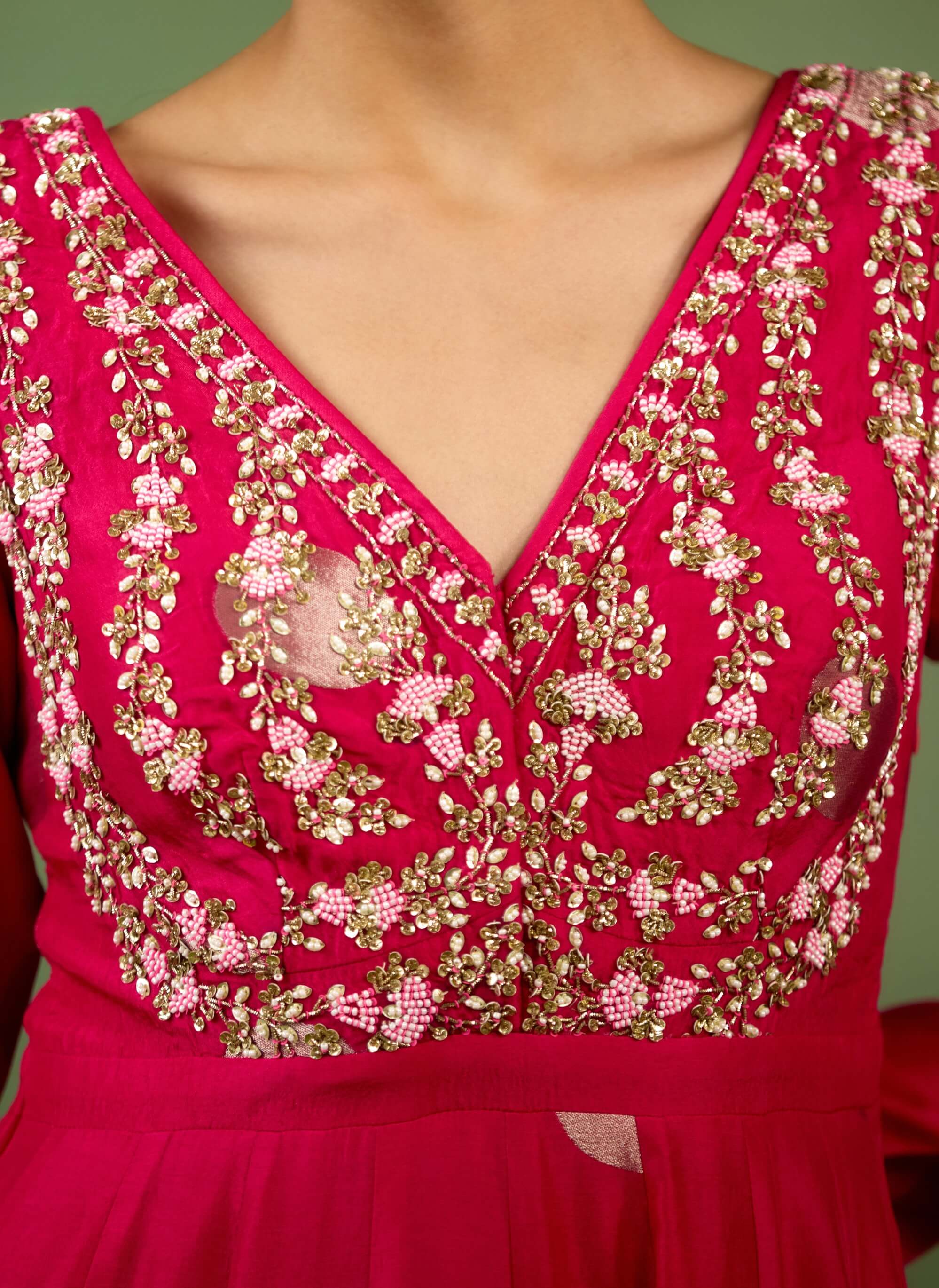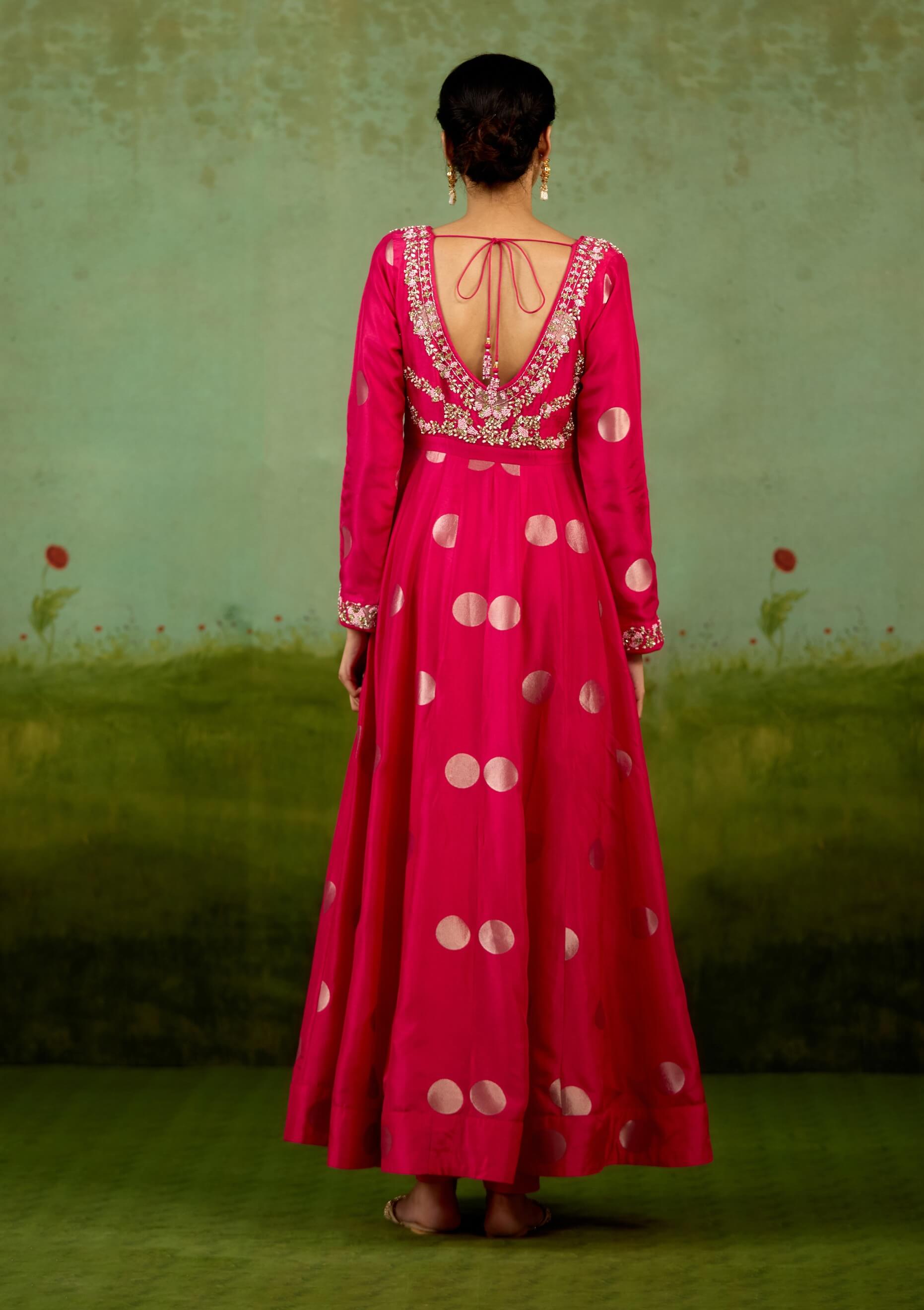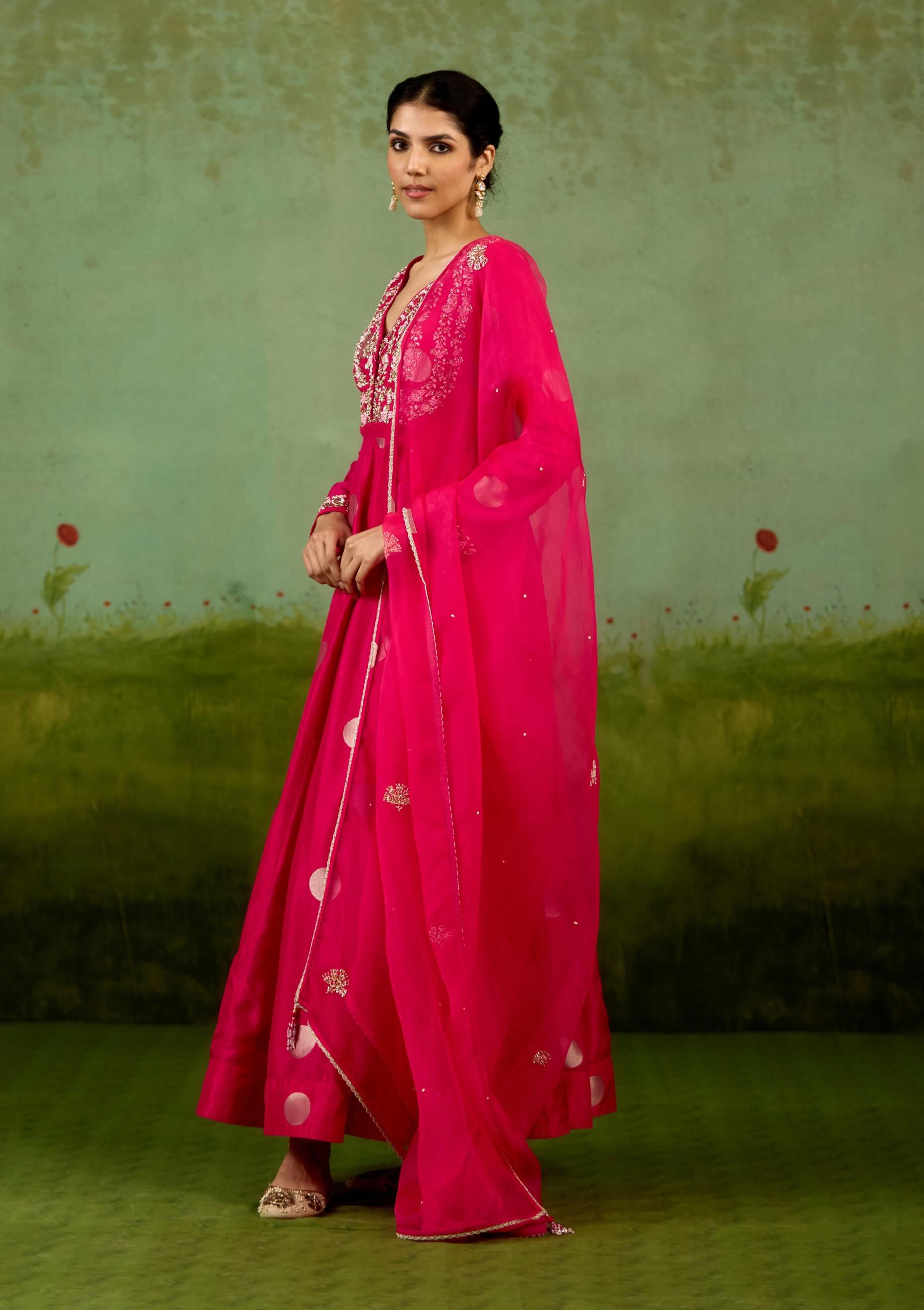 A radiant symphony in fuchsia. Zardozi embroidery graces the silk brocade fabric, illuminating this anarkali set with traditional charm. Accompanied by an organza dupatta, it’s perfect for sangeet nights, weddings, or joyous festive gatherings.