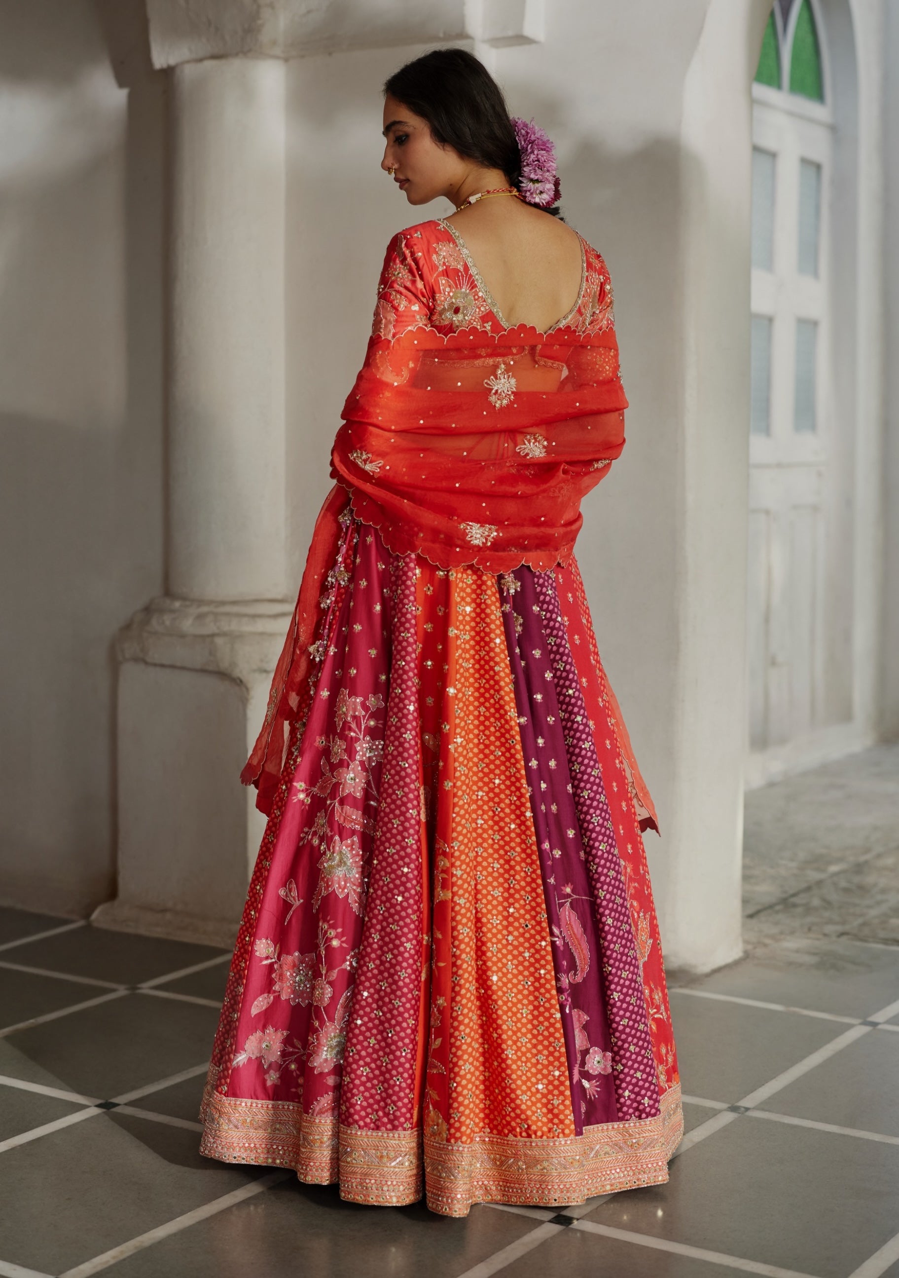 A vibrant lehenga set drenched in striking, festive hues, crafted from an exquisite blend of butis and floral prints. The lehenga features rich hand-embellishment with sequins, cutdana, zari, and resham work,capturing the spirit of grandeur. It is paired with a signature-cut statement blouse adorned with delicate hand embroidery, and completed with a scallop-edged net dupatta embellished with scattered buttis.