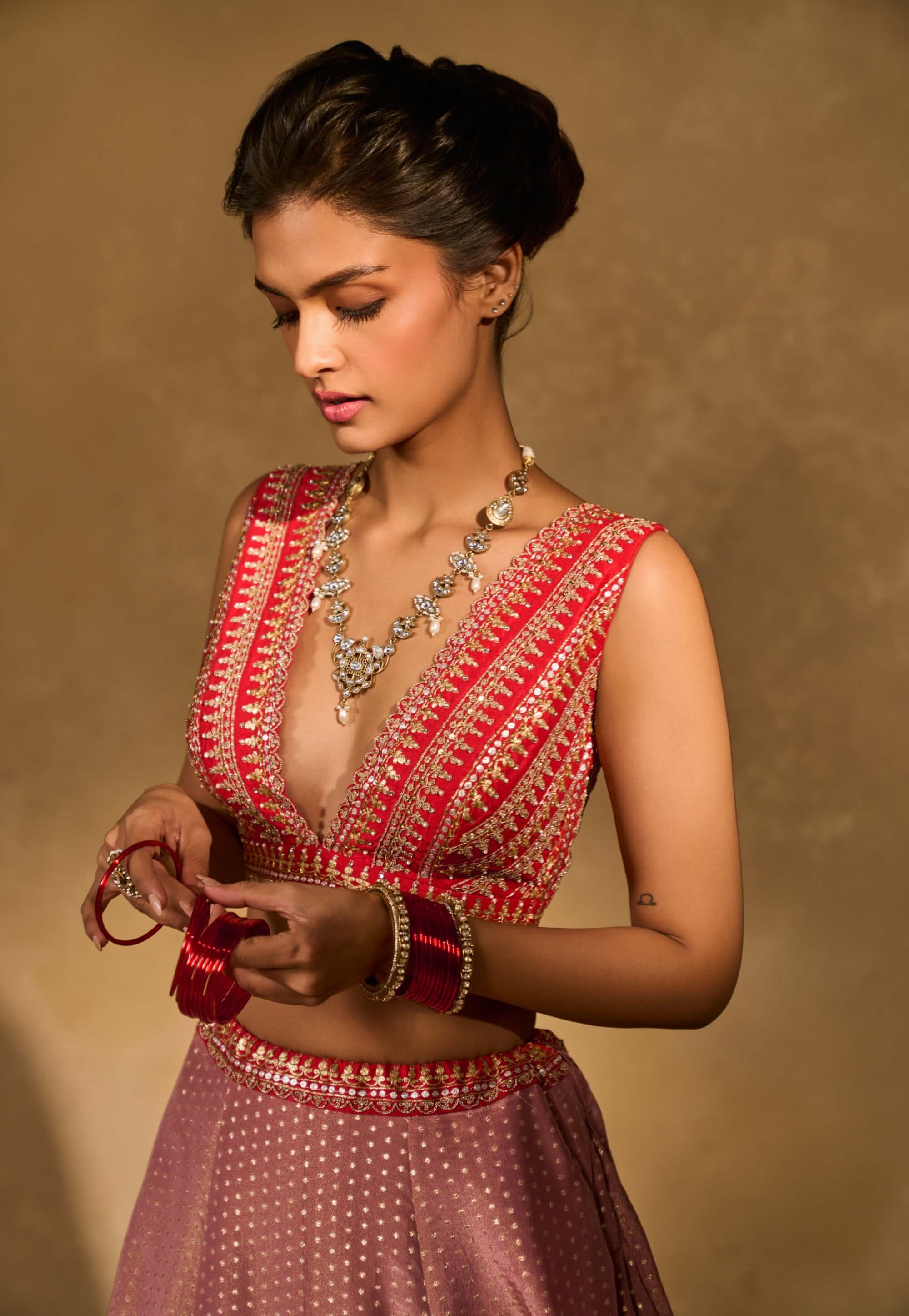 Striking in contrast, this tissue jamewar lehenga features pita and zari embroidery along a bold red hem. The plunging neck blouse showcases geometric embroidery. A pink organza dupatta adds softness. Designed for festive drama. Perfect for wedding celebrations.