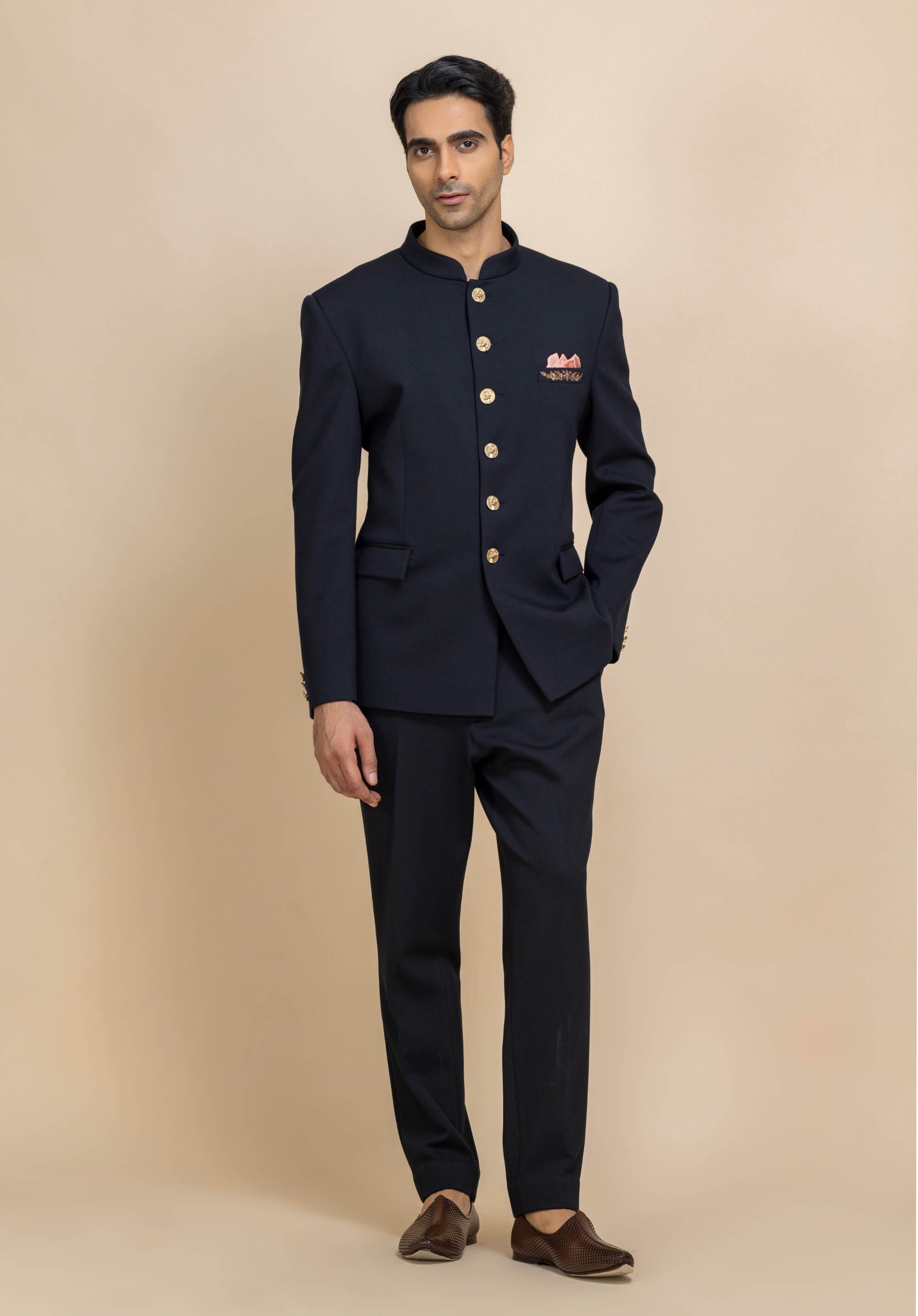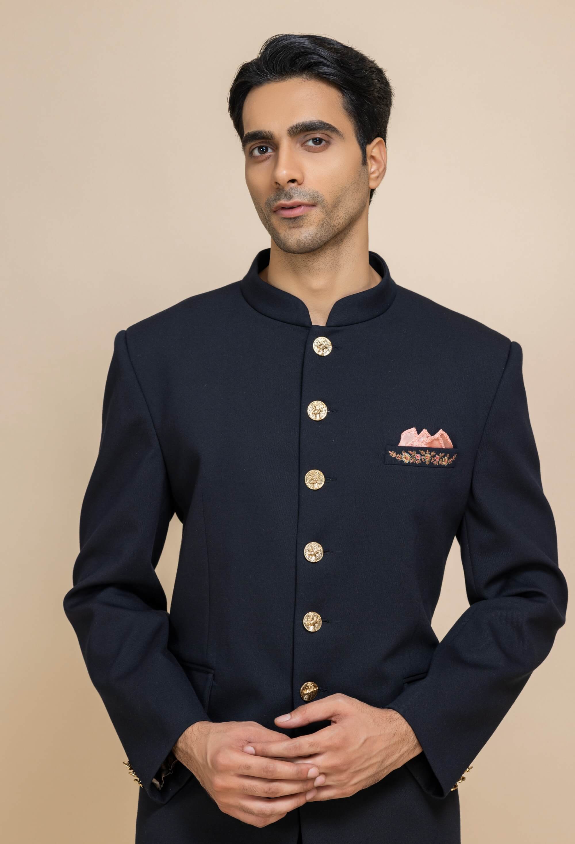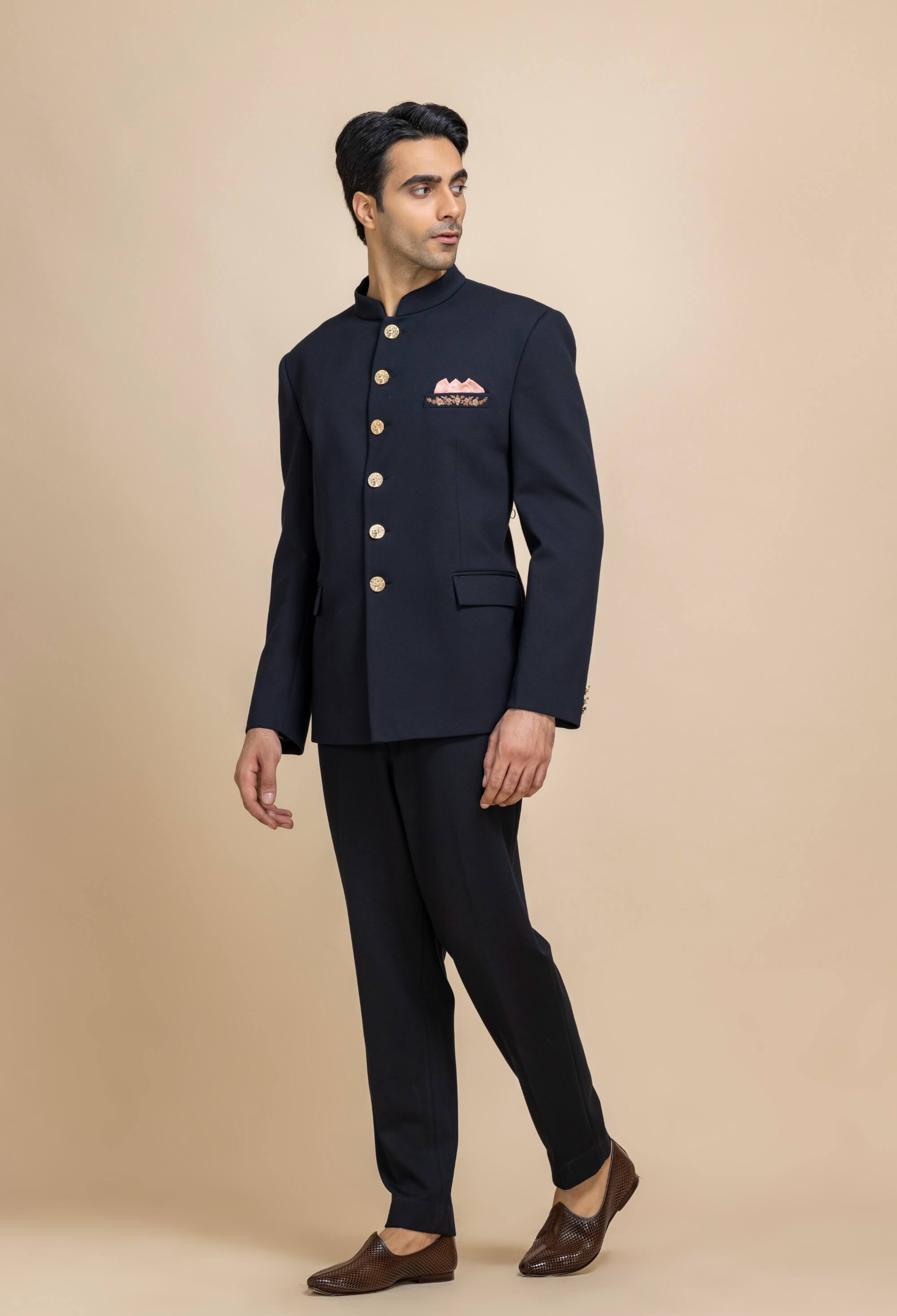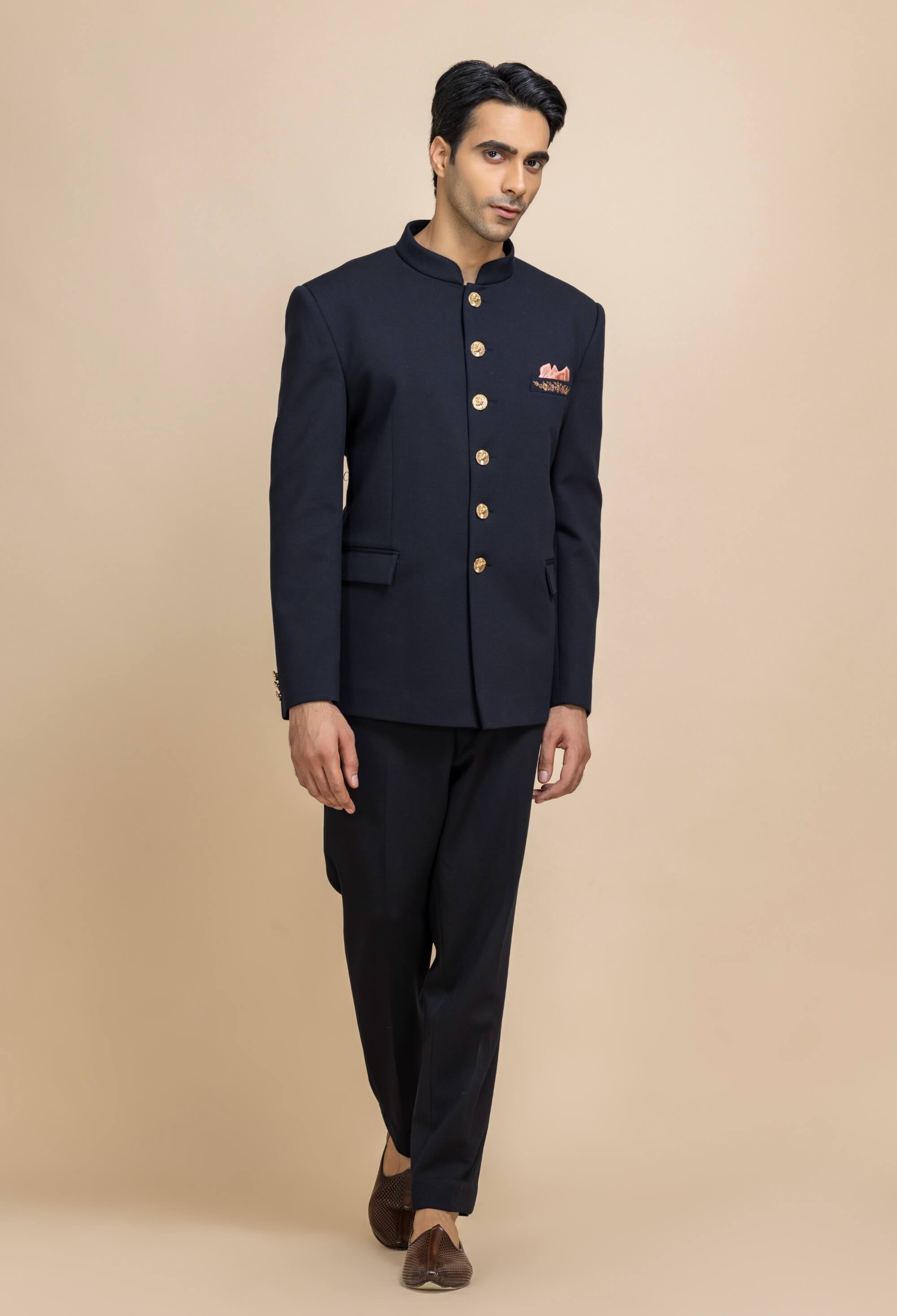Crafted for moments that demand distinction, this deep navy bandhgala redefines classic elegance. Sharp tailoring is complemented by statement gold buttons and a subtle pocket square detail. Its clean lines and commanding silhouette make it effortlessly refined. An impeccable choice for weddings, formal evenings, and grand celebrations.