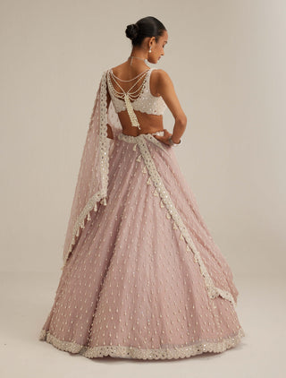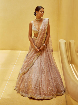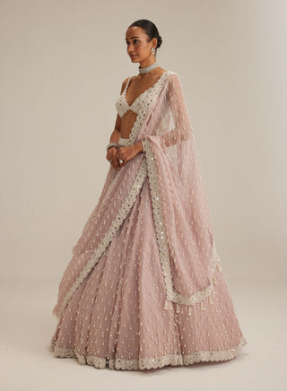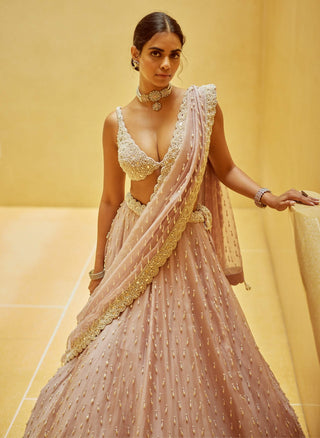 Exuding ethereal charm, this ash pink organza lehenga shines with pearl drop embroidery. The V-neck blouse and flowing dupatta heighten its elegance, making it perfect for weddings and festive evenings. Lightweight fabric ensures graceful movement, while embellishments bring regal allure. A pastel masterpiece for modern celebrations.