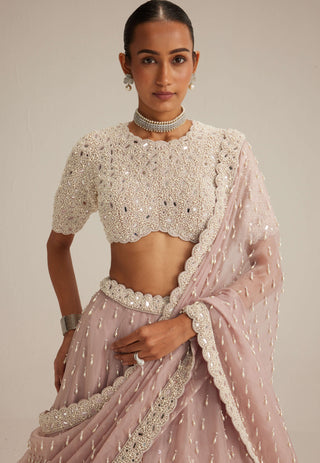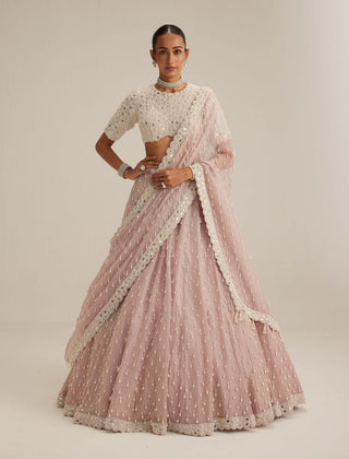 Timelessly refined, this ash pink organza lehenga is adorned with pearl drop embroidery. Paired with a richly embroidered high-neck blouse and dupatta, it delivers classic sophistication. Perfect for weddings steeped in tradition, it combines soft hues with intricate detailing. A regal choice in pastel luxury.