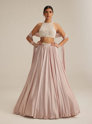Polished and sleek, this ash pink satin skirt set pairs with a racer-back embroidered blouse. A stole completes the ensemble, adding balance to its bold cuts. Perfect for cocktail nights and evening receptions, it offers modern elegance. A celebration of satin luxury and striking details.