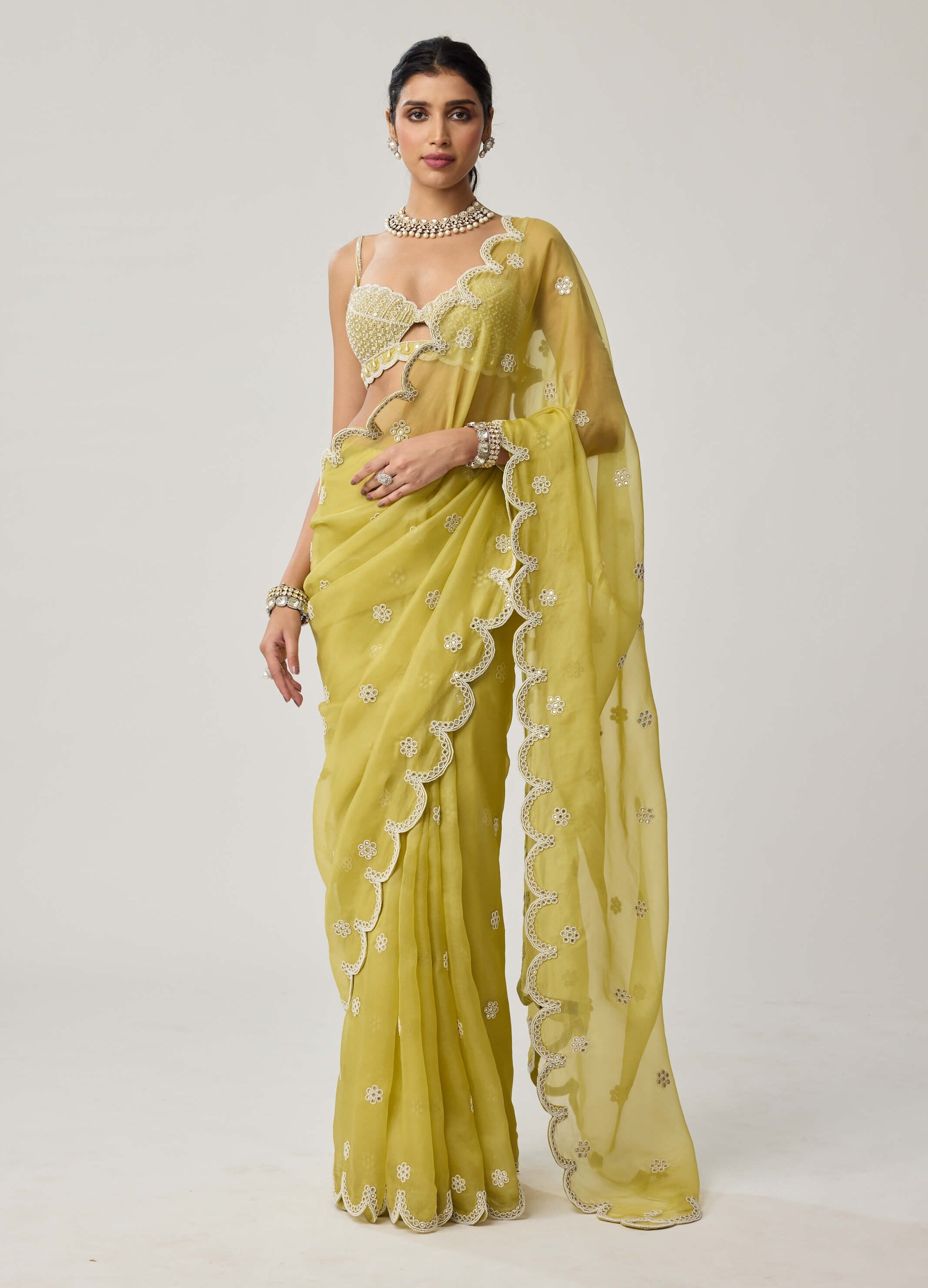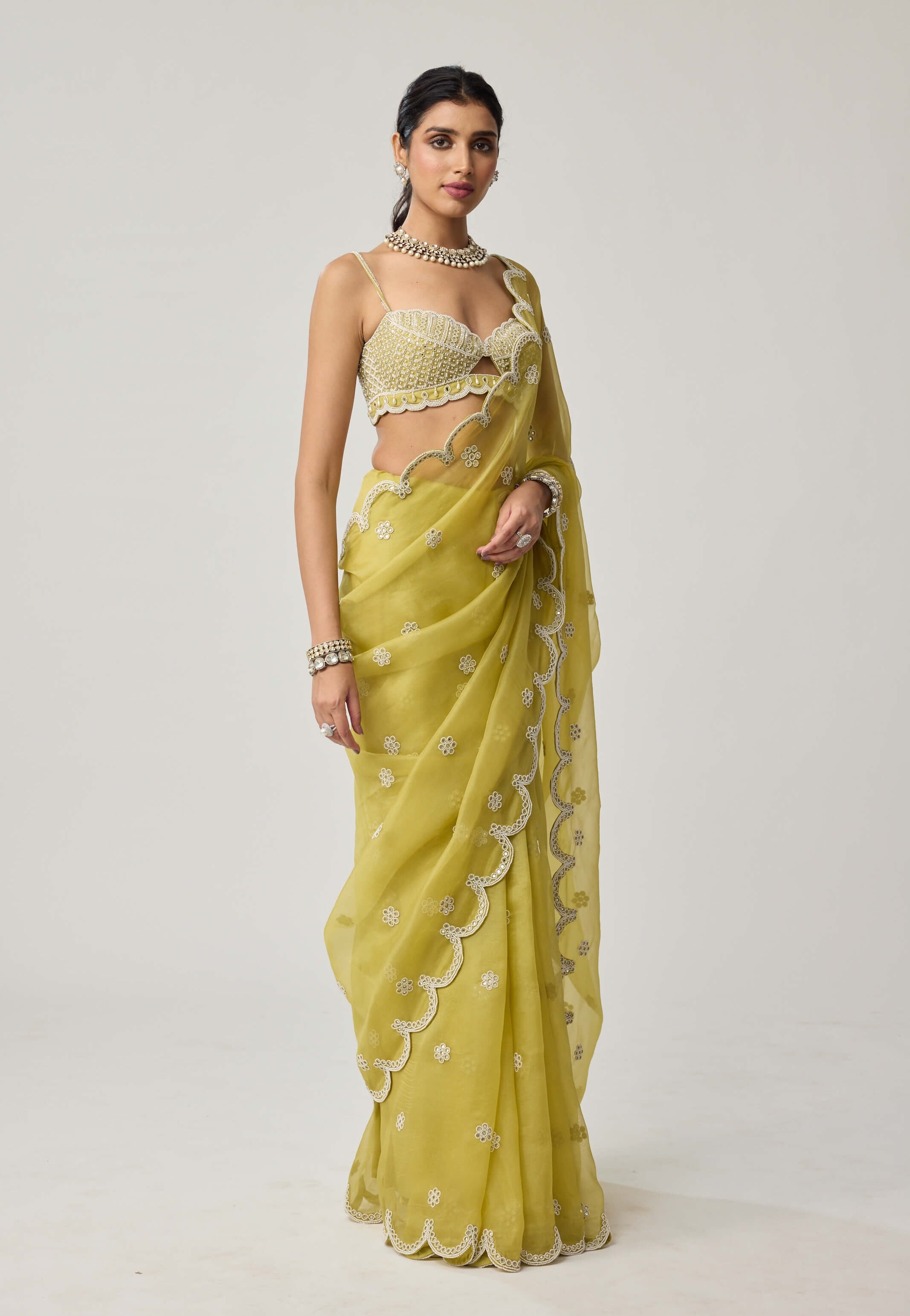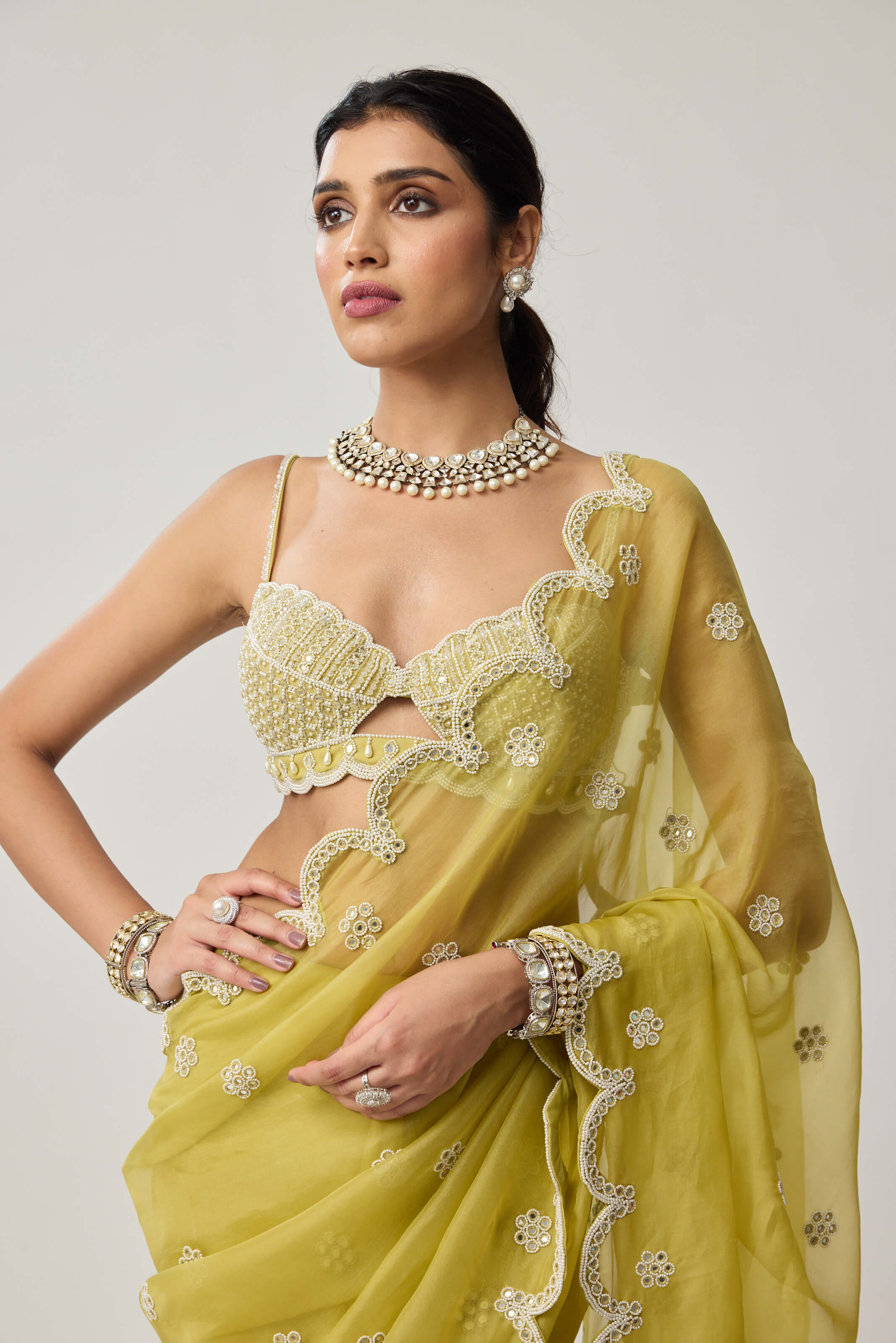 An ode to nature’s elegance, this fern green organza sari glows with mirror and pearl detailing. The hand-embroidered blouse adds refined dimension, perfect for daytime festivities, outdoor weddings, or celebrations wrapped in serenity.