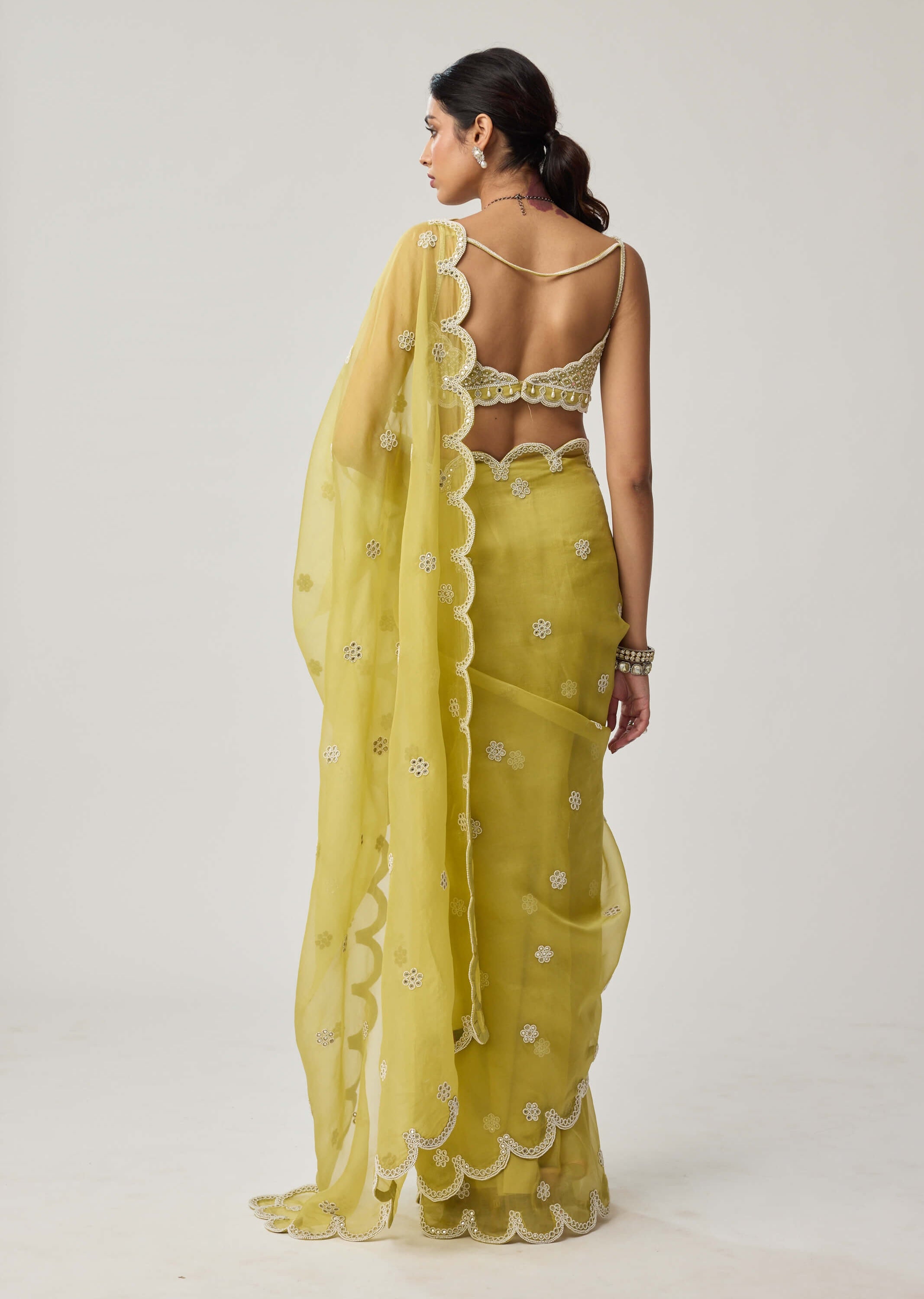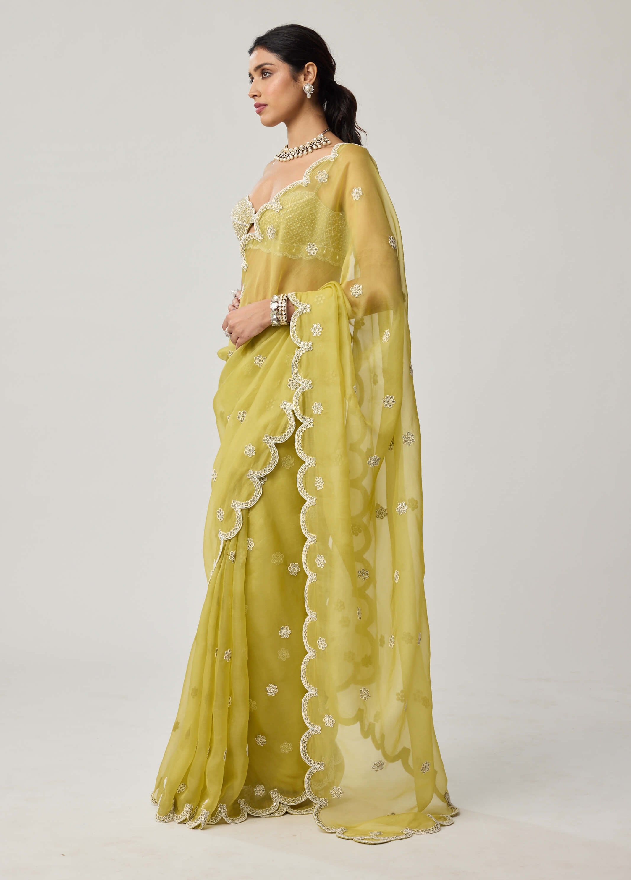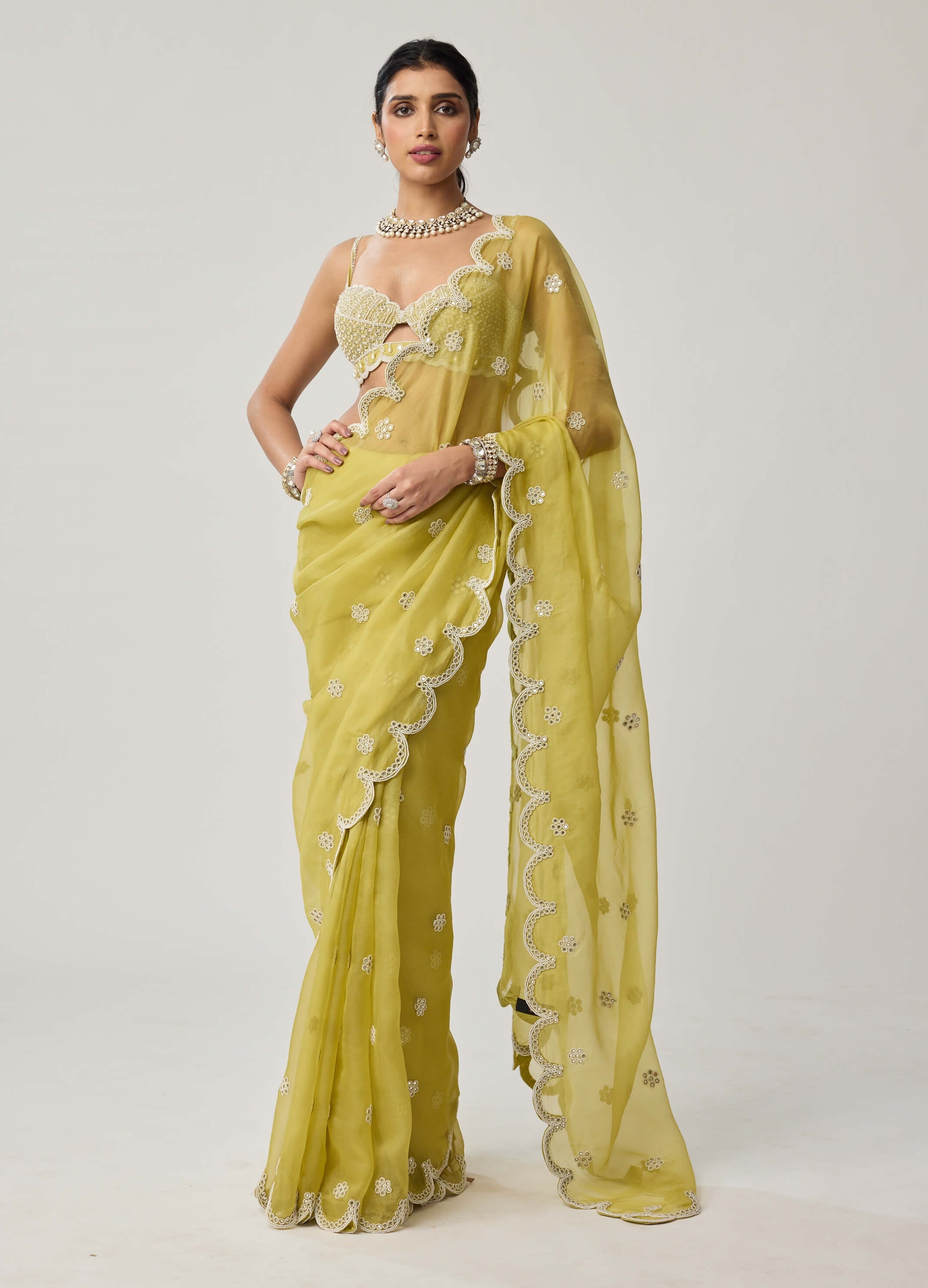 An ode to nature’s elegance, this fern green organza sari glows with mirror and pearl detailing. The hand-embroidered blouse adds refined dimension, perfect for daytime festivities, outdoor weddings, or celebrations wrapped in serenity.