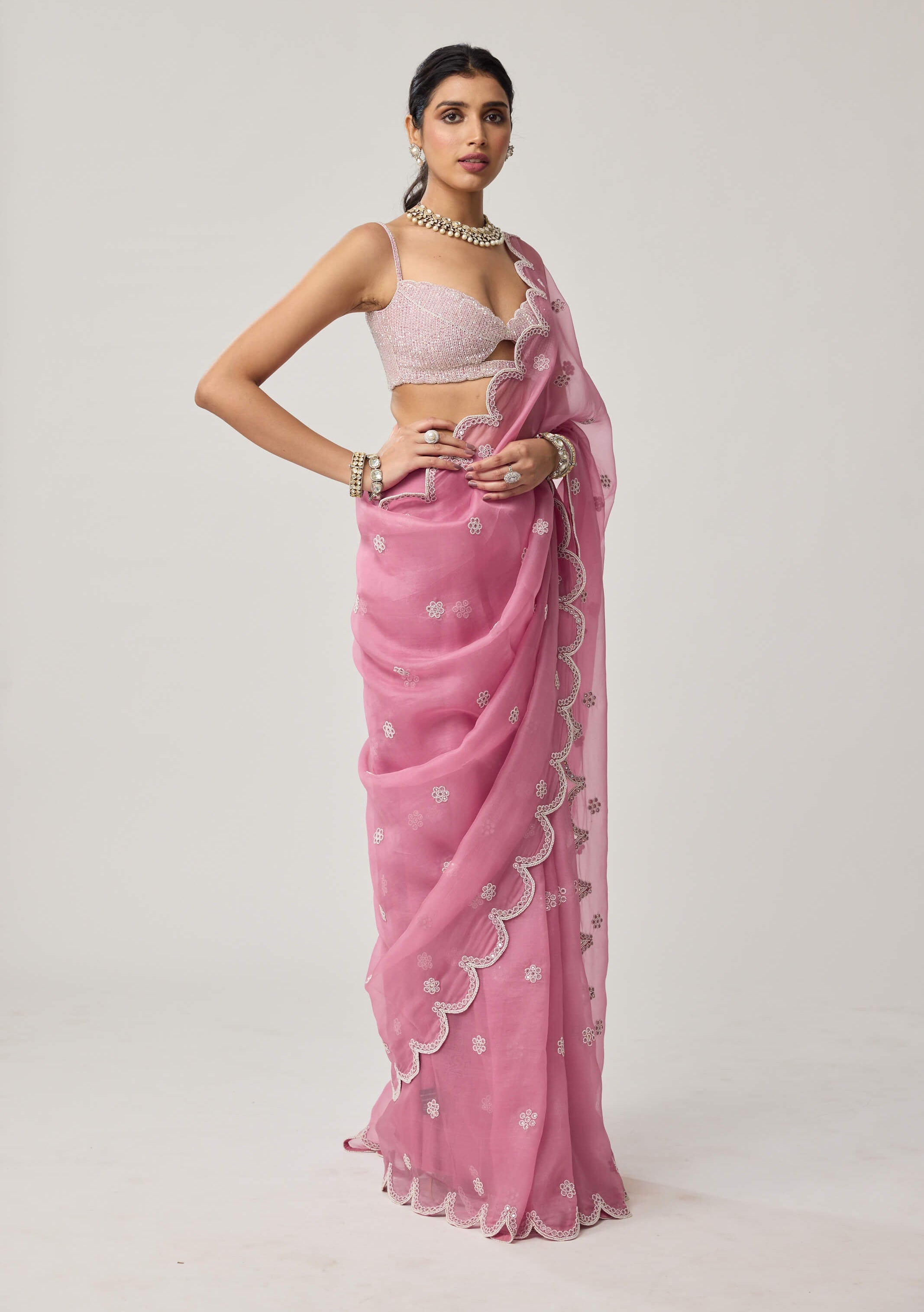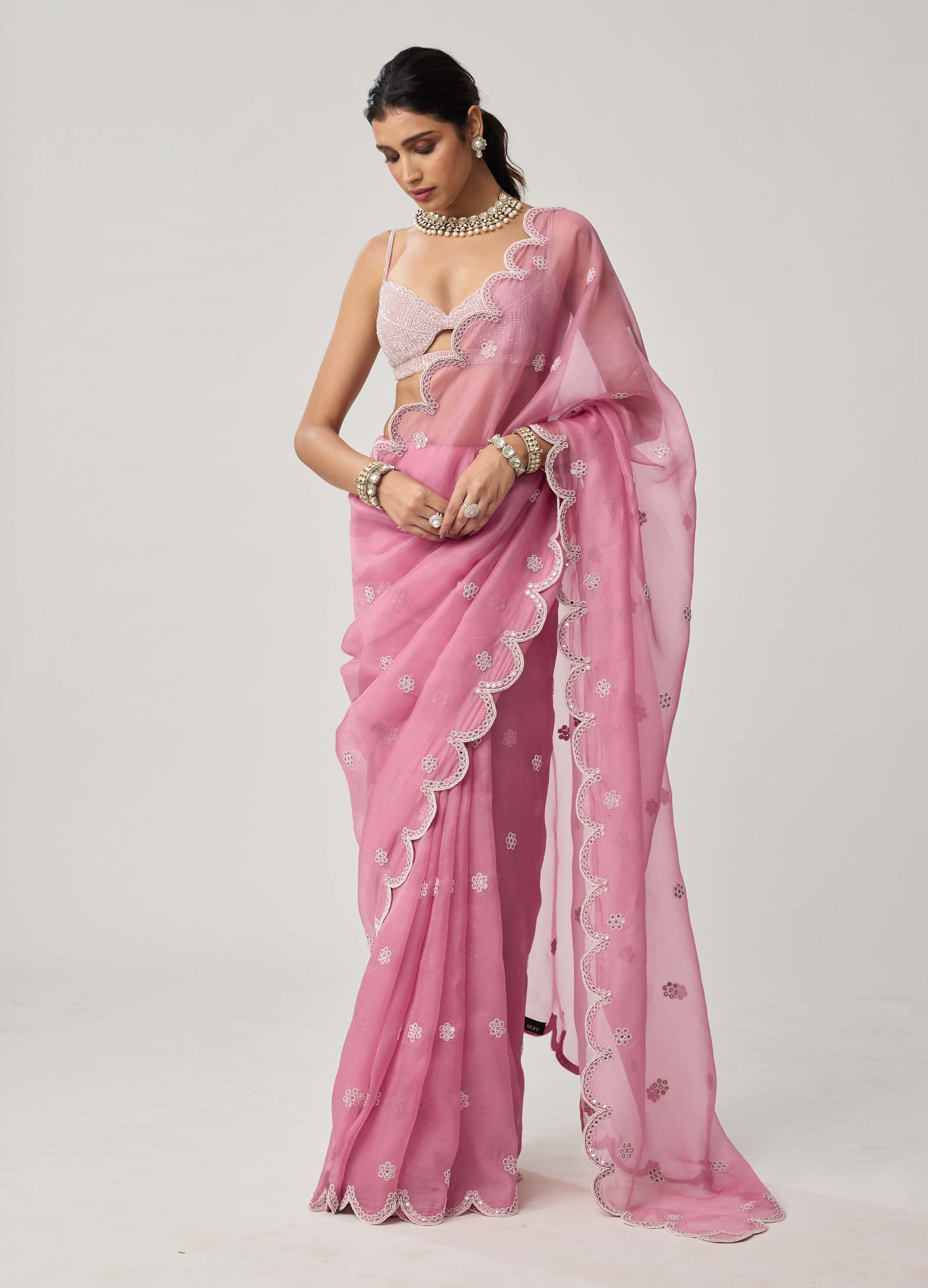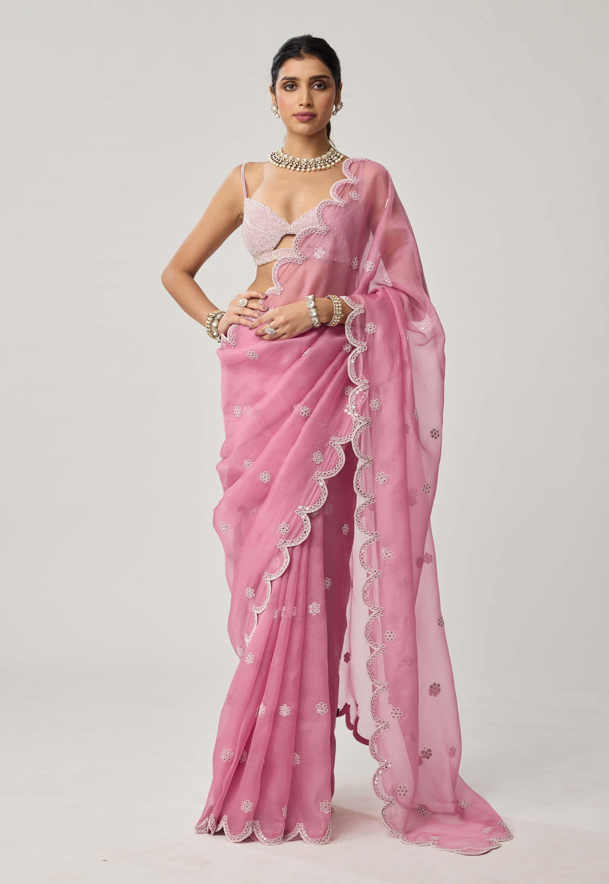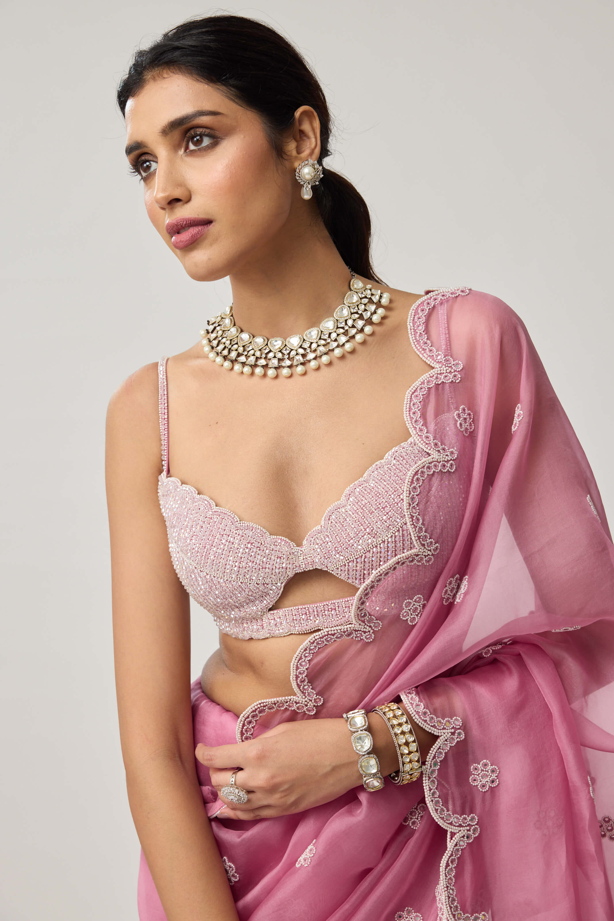 Softly romantic and luminously detailed, this onion pink organza sari radiates feminine grace. The mirror and pearl embroidery lend a subtle shimmer, while the embellished blouse completes the ensemble. Ideal for engagement luncheons or daytime wedding festivities.