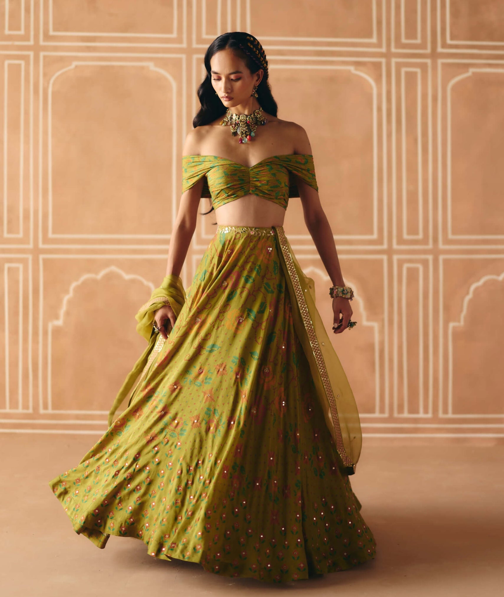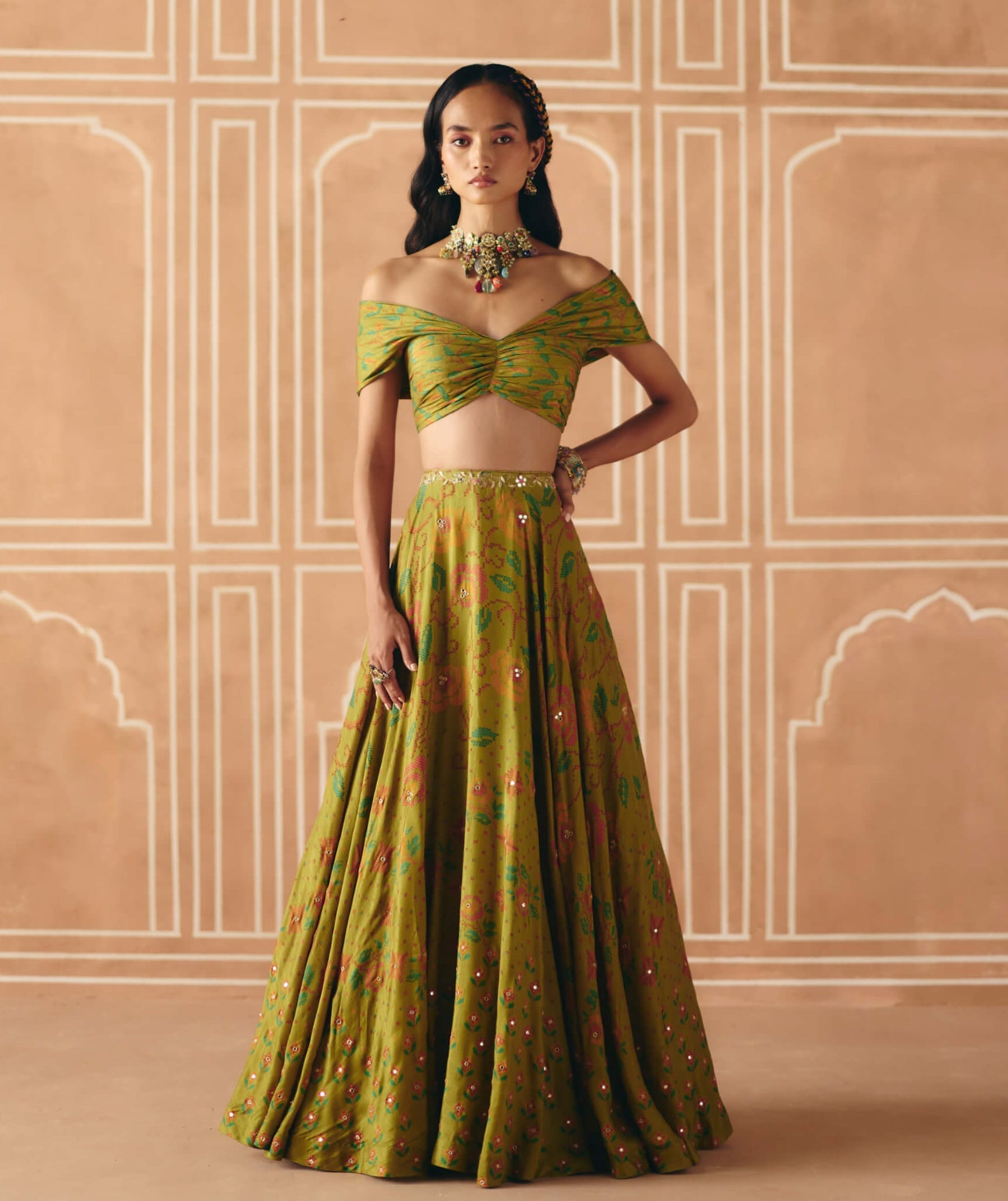 Vibrant and artistic, this printed lehenga is embroidered to perfection and paired with a pleated off-shoulder blouse and organza dupatta. The parrot green shade makes it ideal for sangeet, weddings, or destination festivities.