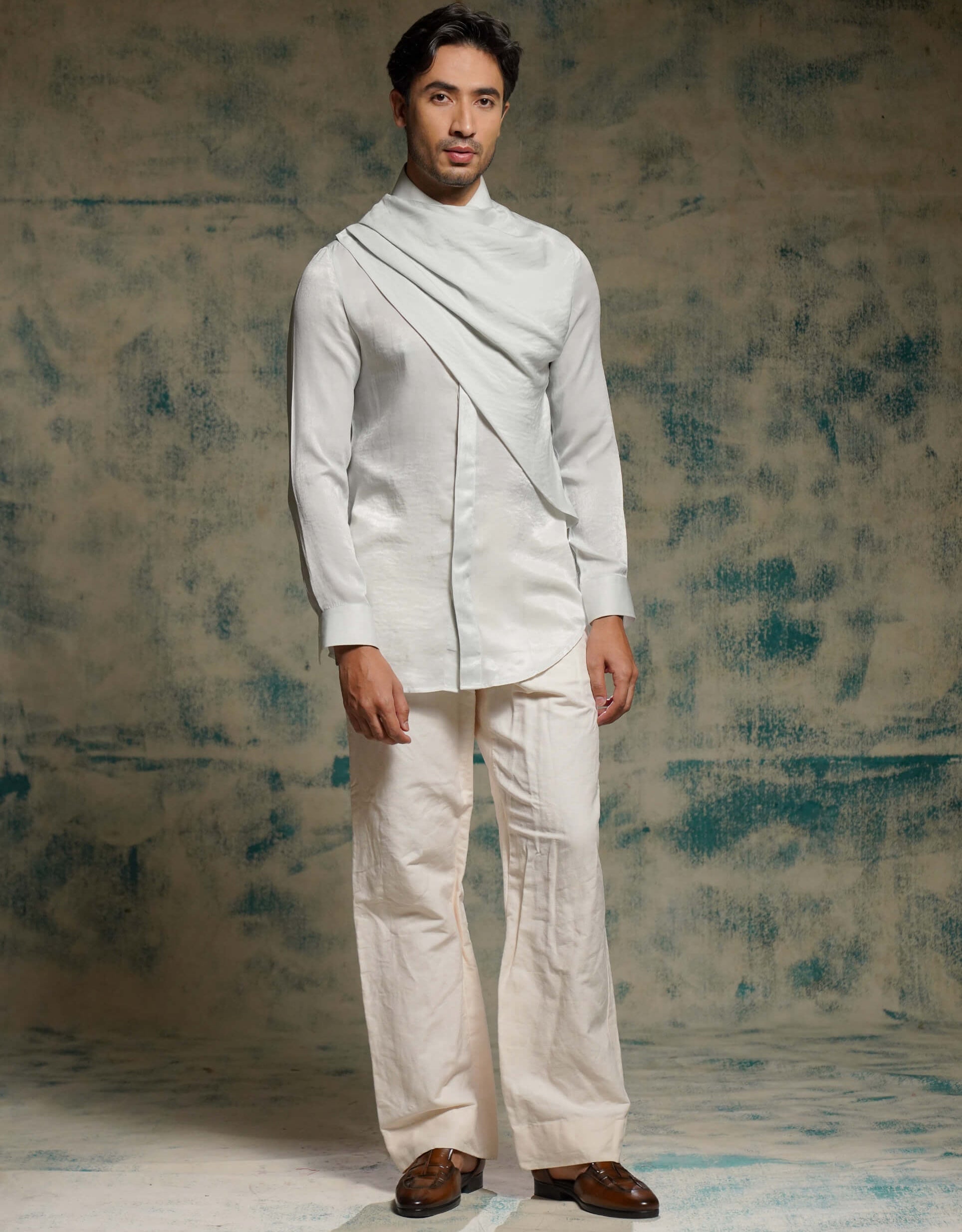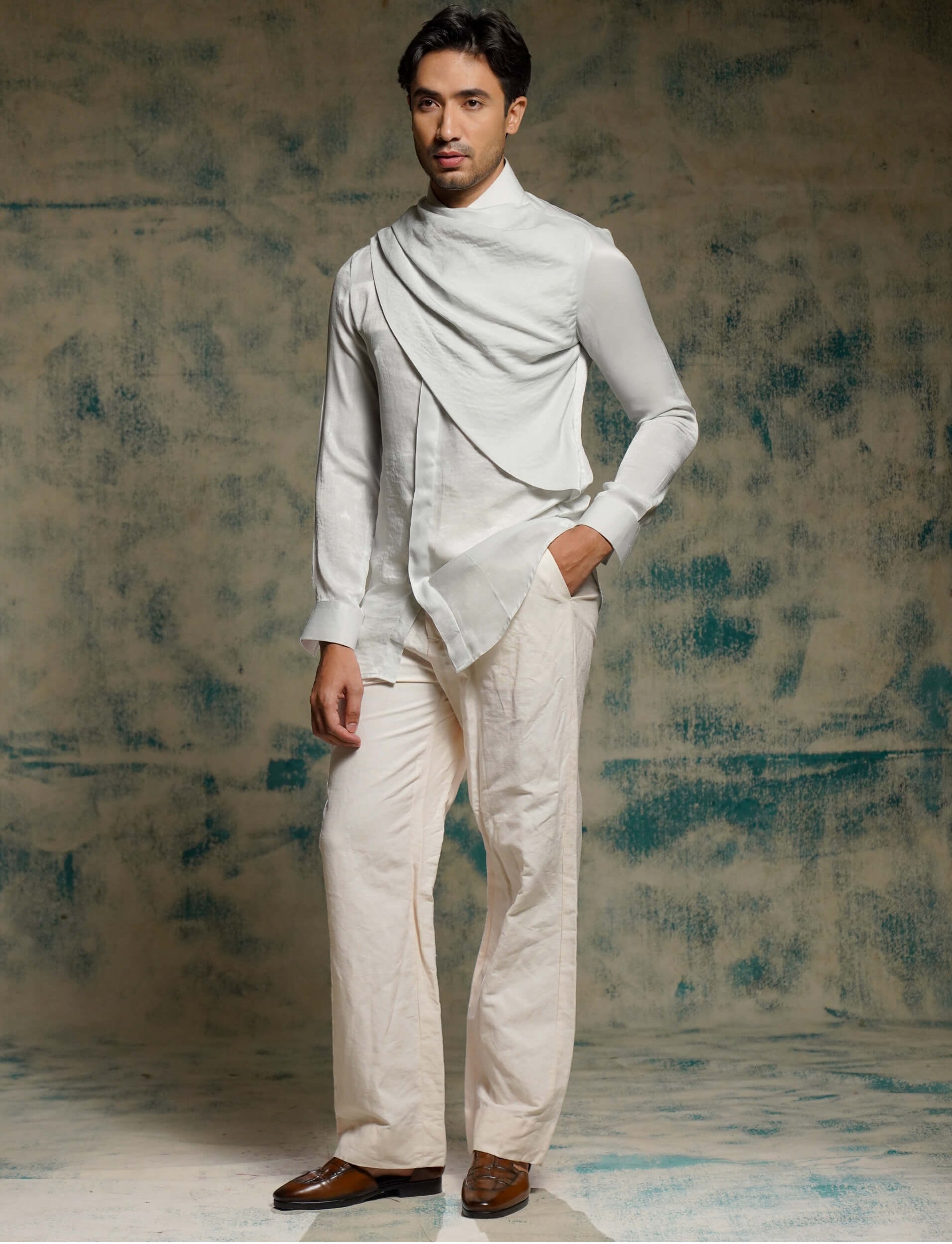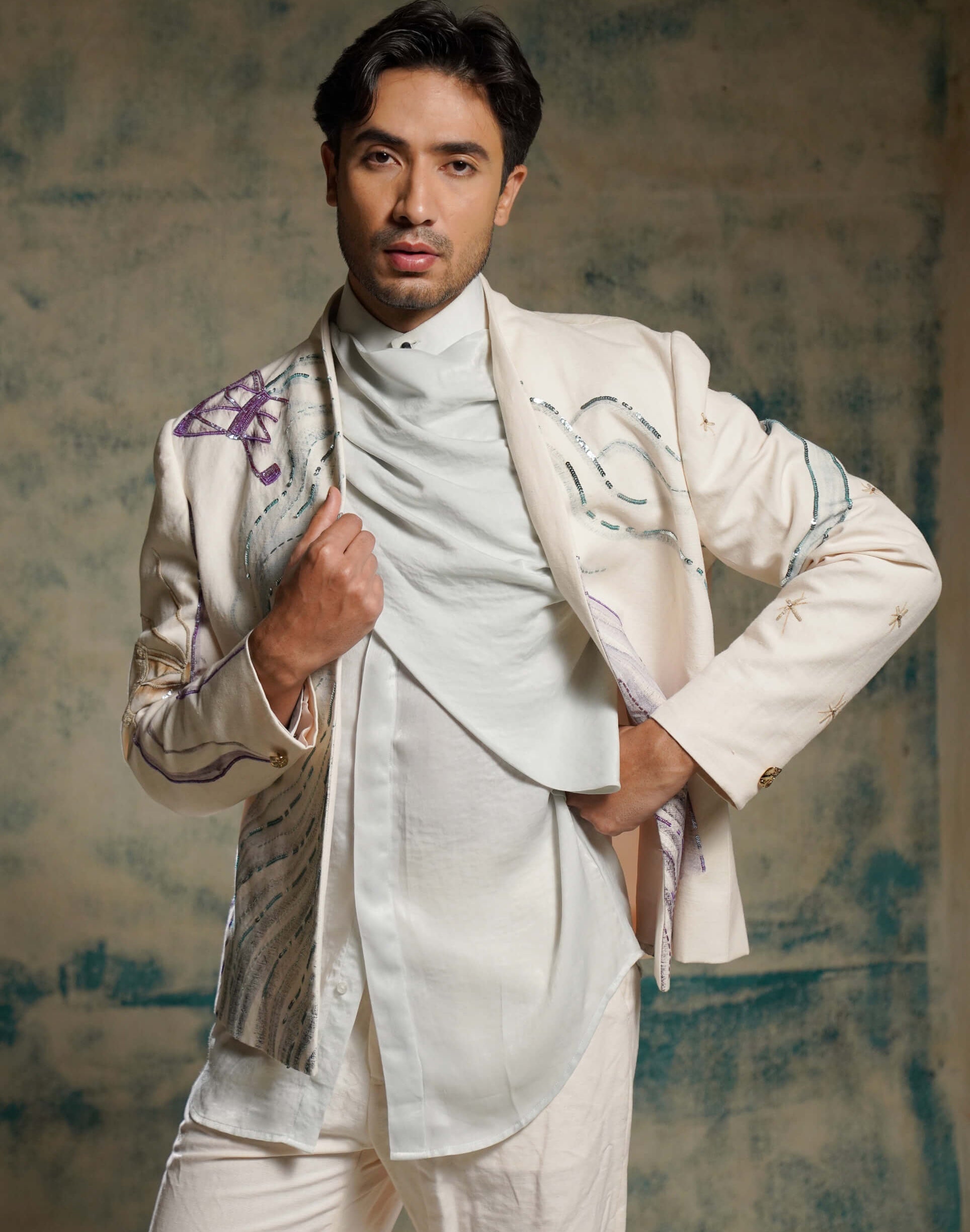 A refined shawl-collar blazer inspired by shiva as adiyogi, the eternal yogi of meditation. Sequins add a radiant touch, capturing serenity and positive energy. Paired with straight trousers, this ensemble offers a balance of craftsmanship and symbolism. Ideal for cocktail evenings, destination receptions, or contemporary wedding festivities.