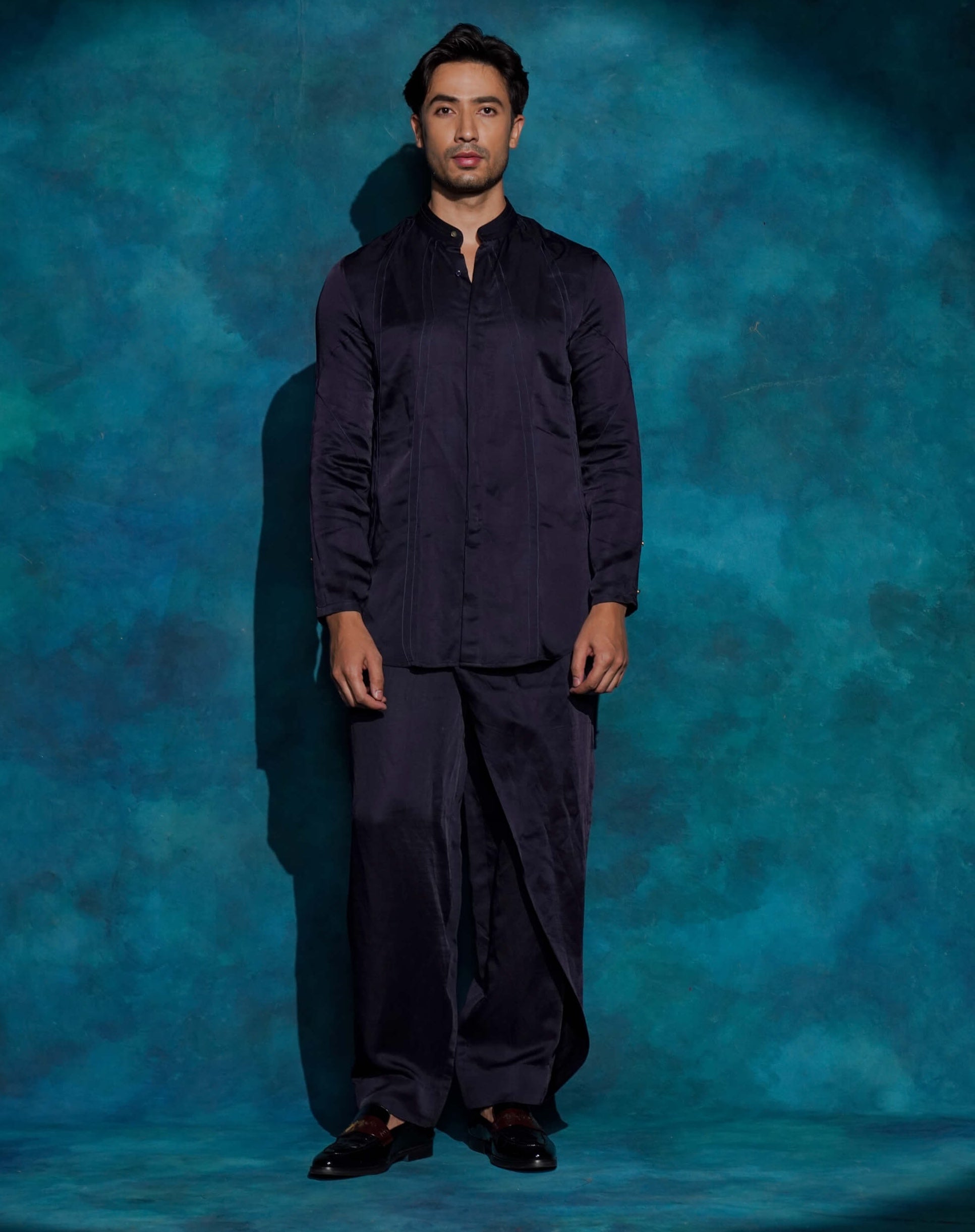 Meticulously embroidered in organza, resham, and net, this midnight blue jacket brings shiva’s trident, damru, and serpent to life. Layered over a shirt, kurta, and kamarbandh, it is a striking ensemble that blends heritage with contemporary finesse. Perfect for luxury weddings, mehendi evenings, or festive celebrations of devotion.
