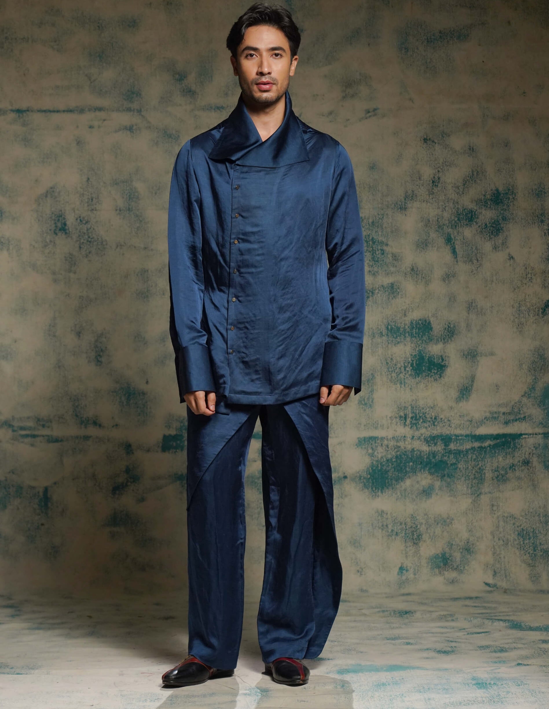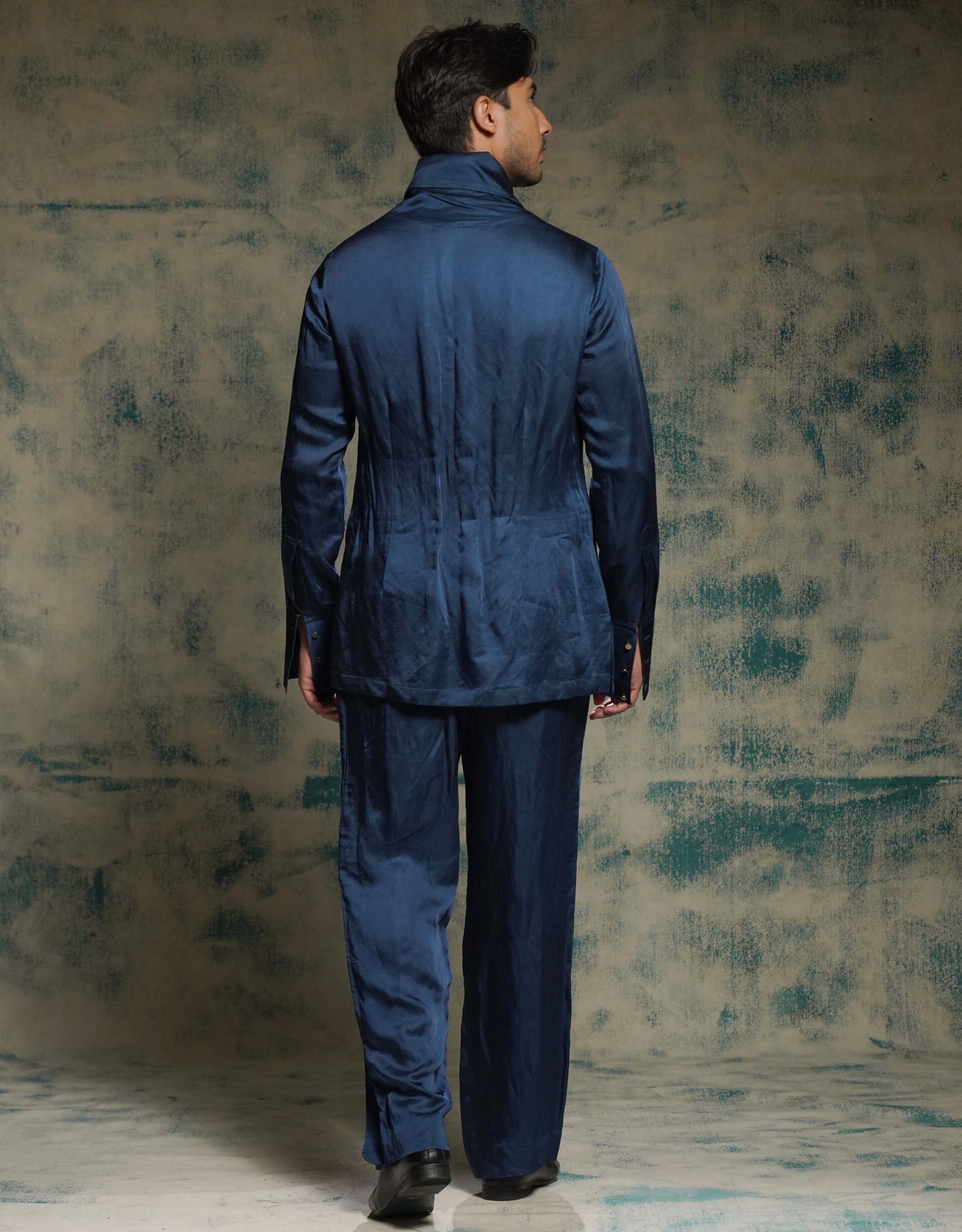 In a poetic shade of tealstone, this short jacket celebrates the divine union of shiv and sati. Embroidered with abstract motifs in aari and zardozi, it reflects waves of motion and energies transcending into oneness. Paired with a kurta and trousers, this look is perfect for engagements, sangeet celebrations, or spiritual-inspired soirées, blending balance and artistry.