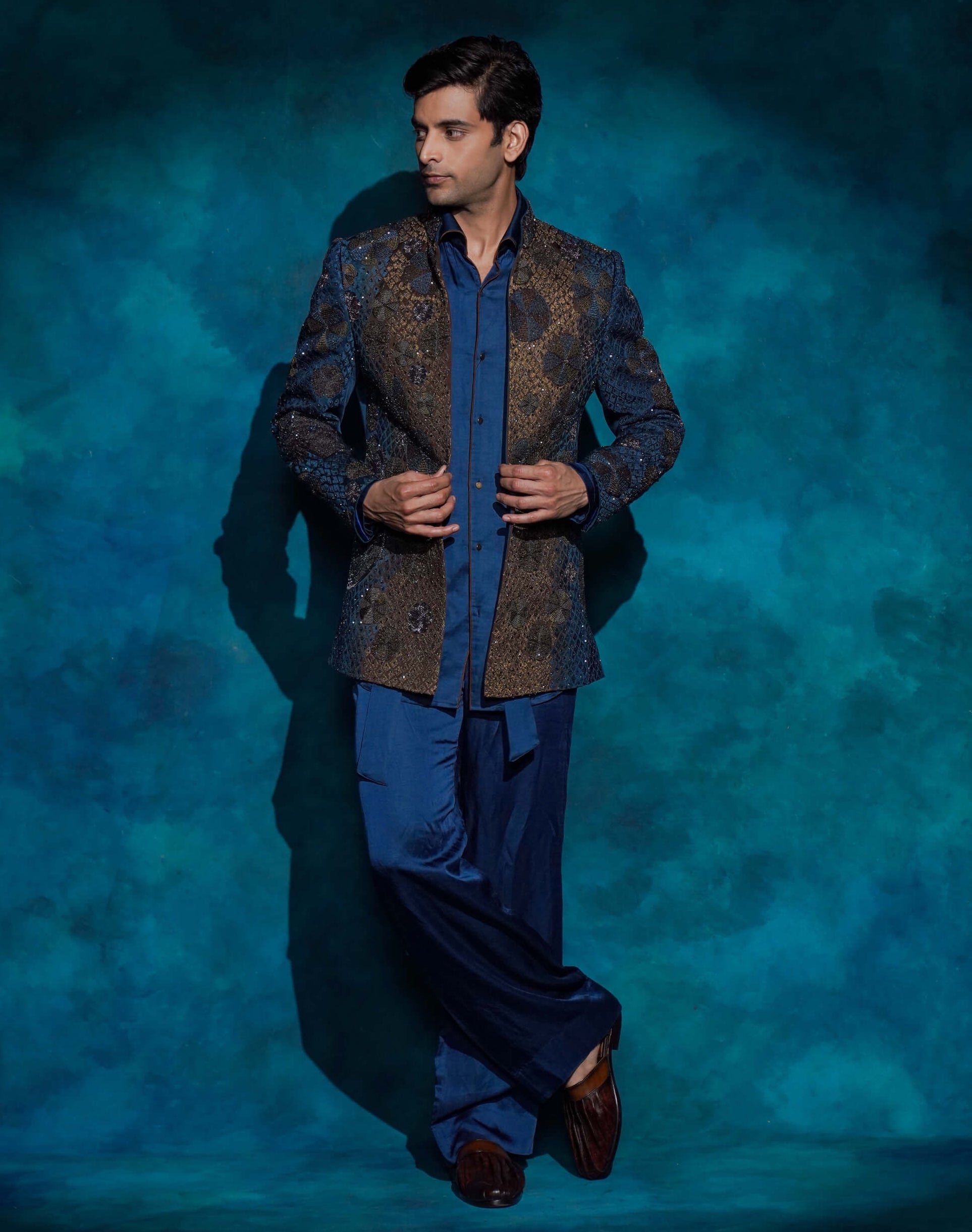 This teal and brown ombre jacket pays tribute to shiva’s cosmic dualities, with motifs of vasuki, rudraksha, and ardhanarishvara. Embroidered with resham, zari, cutdana, and dabka, it radiates celestial elegance. Paired with piped shirt and trousers, it is suited for modern weddings, cocktail nights, and festive soirees.