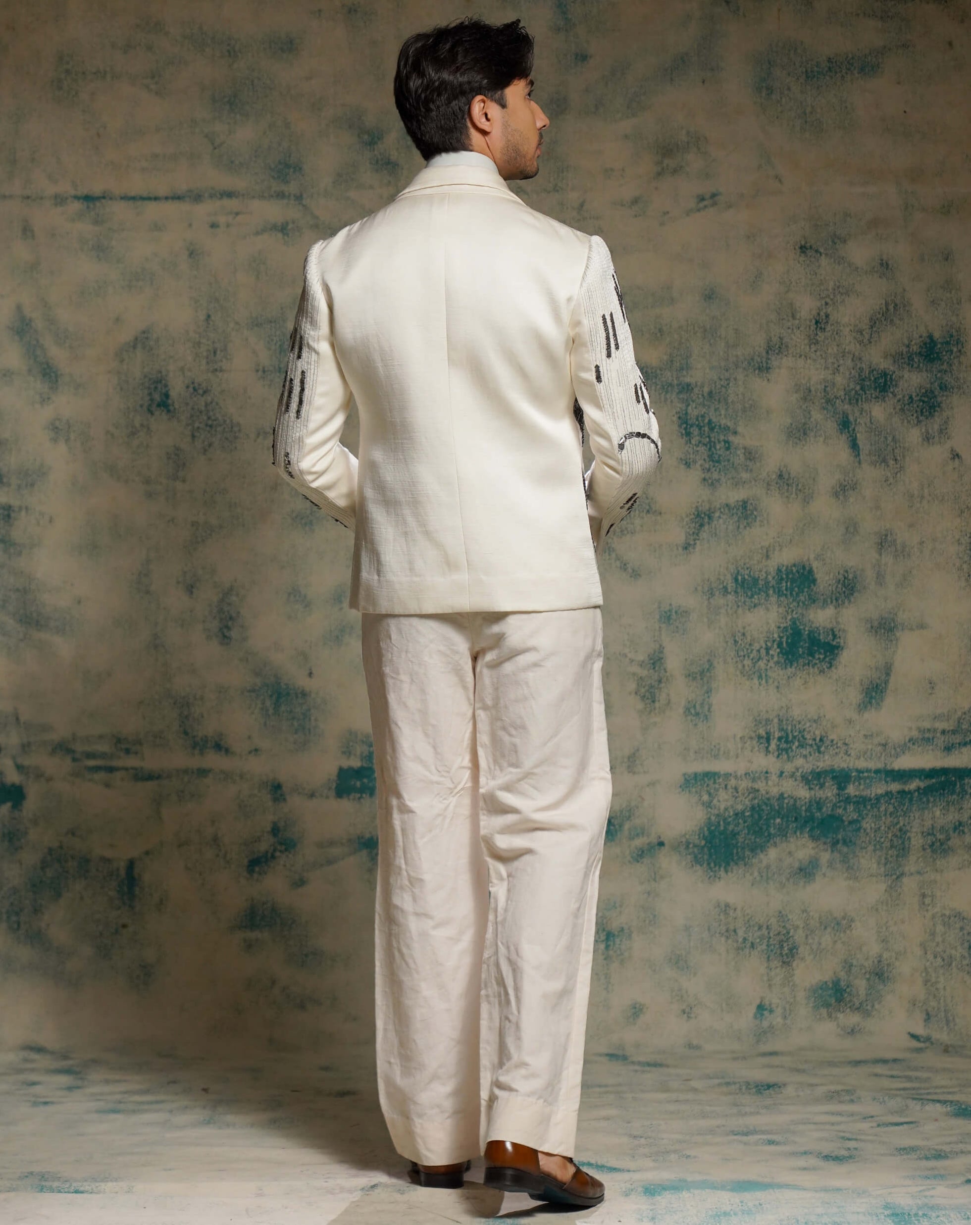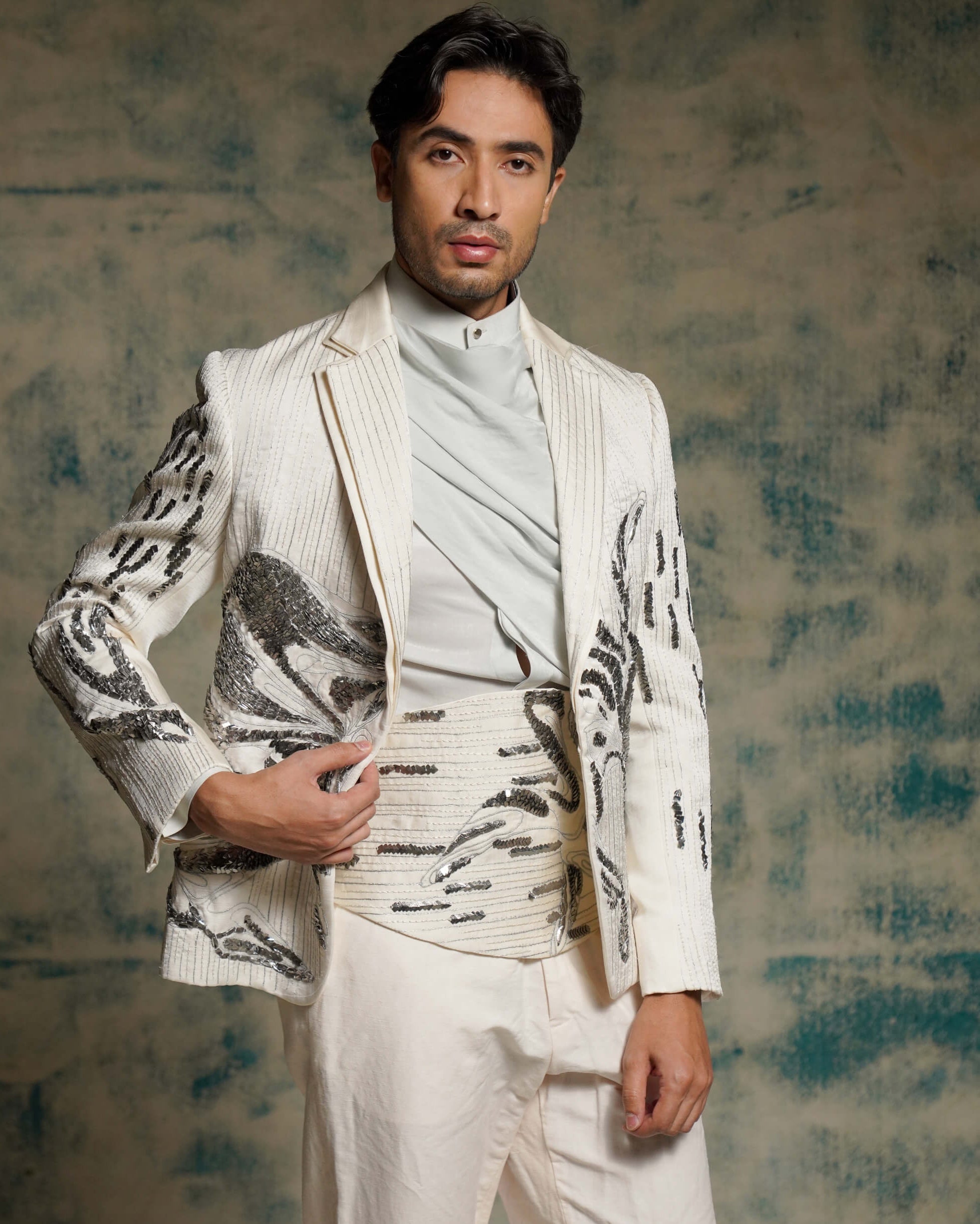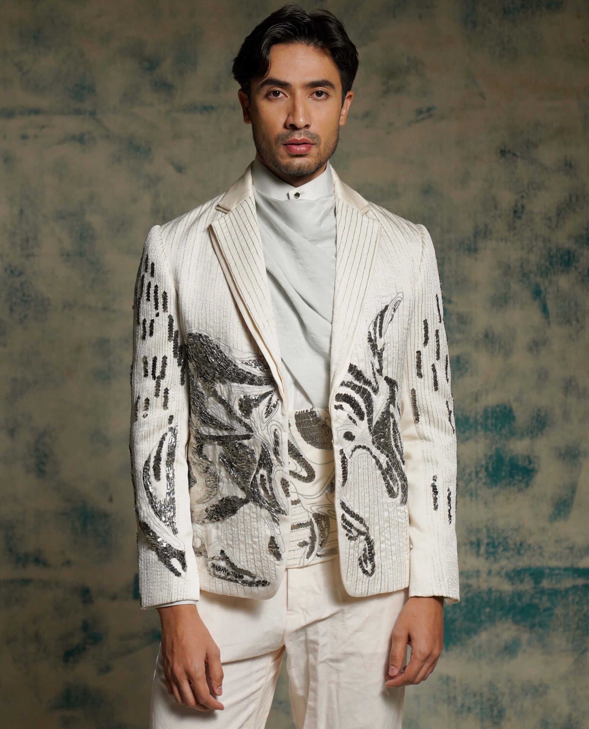 Embodying loyalty and strength, this tusk-hued blazer is inspired by nandi, shiva’s devoted companion. Embroidered with resham and silver zardozi, the design tells a story of love, trust, and surrender. Styled with a draped shirt and pleated trousers, it bridges spirituality with modern tailoring. Perfect for receptions, formal gatherings, or artistic celebrations.