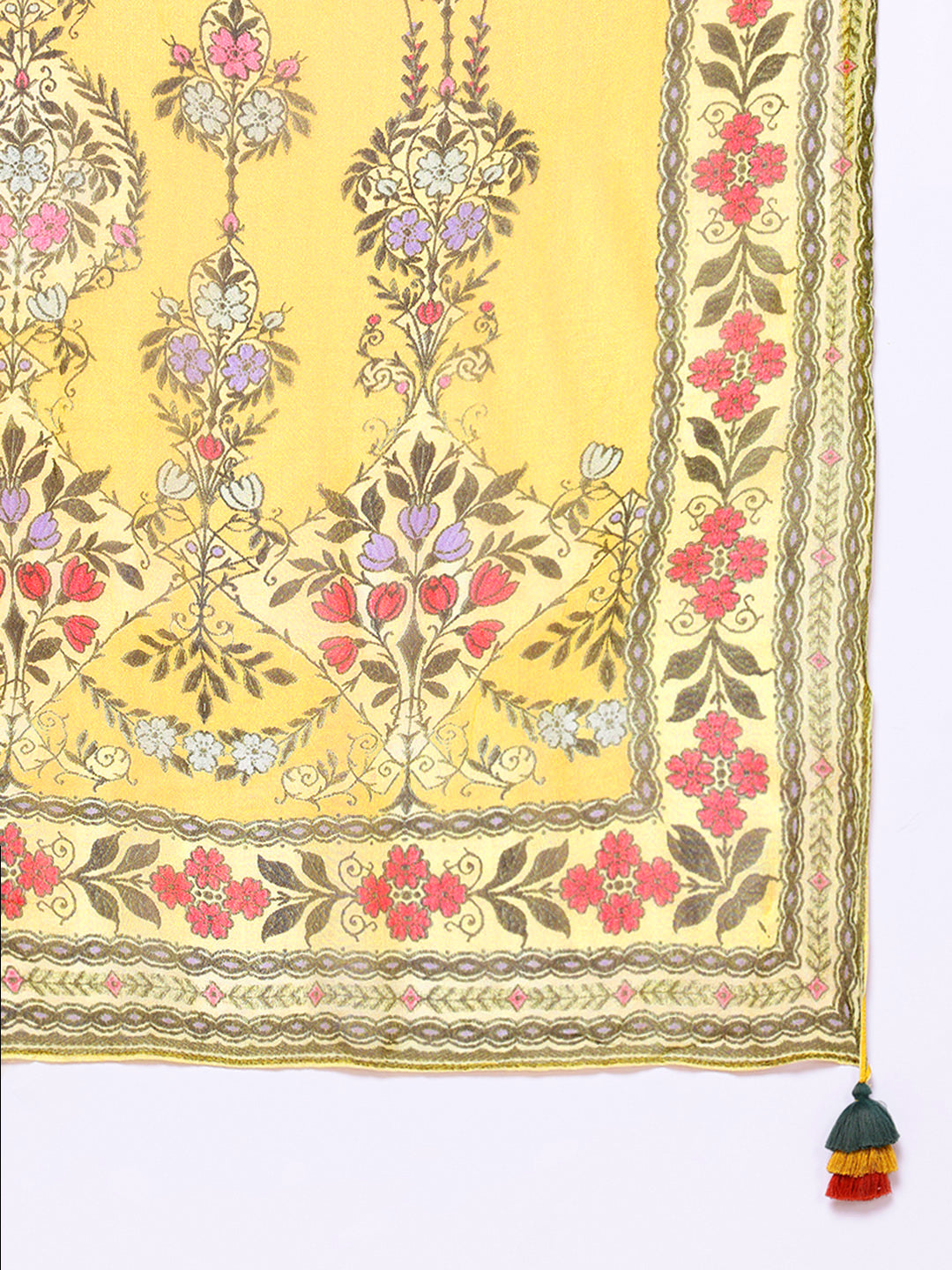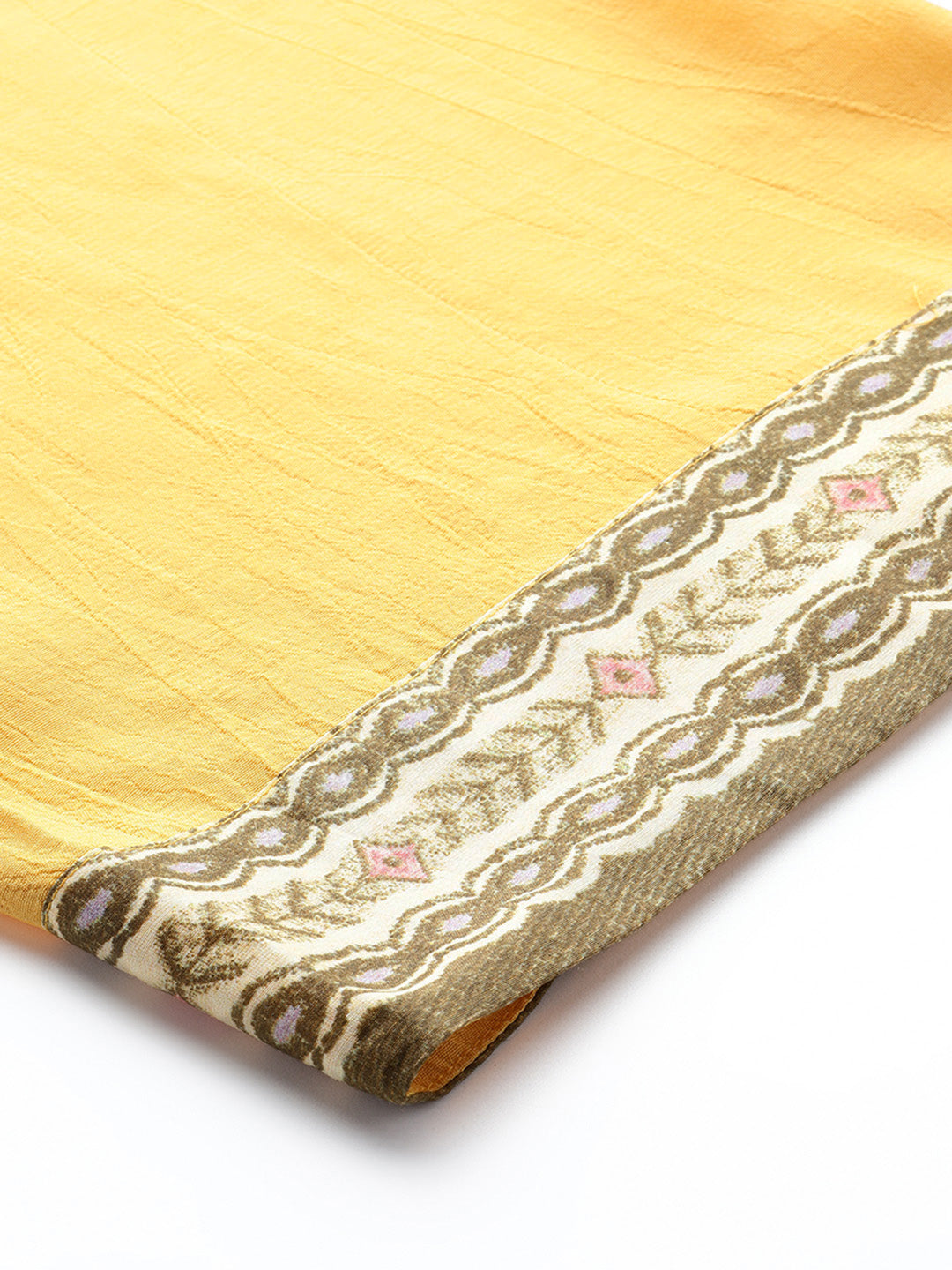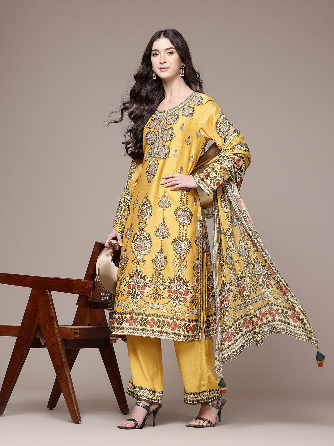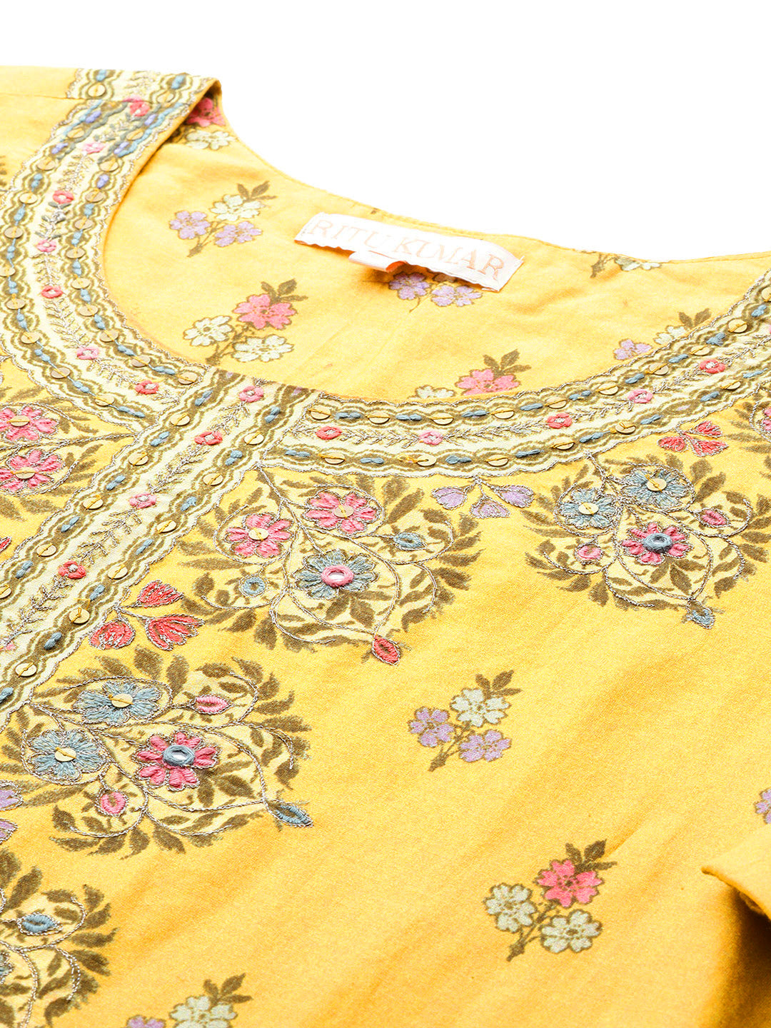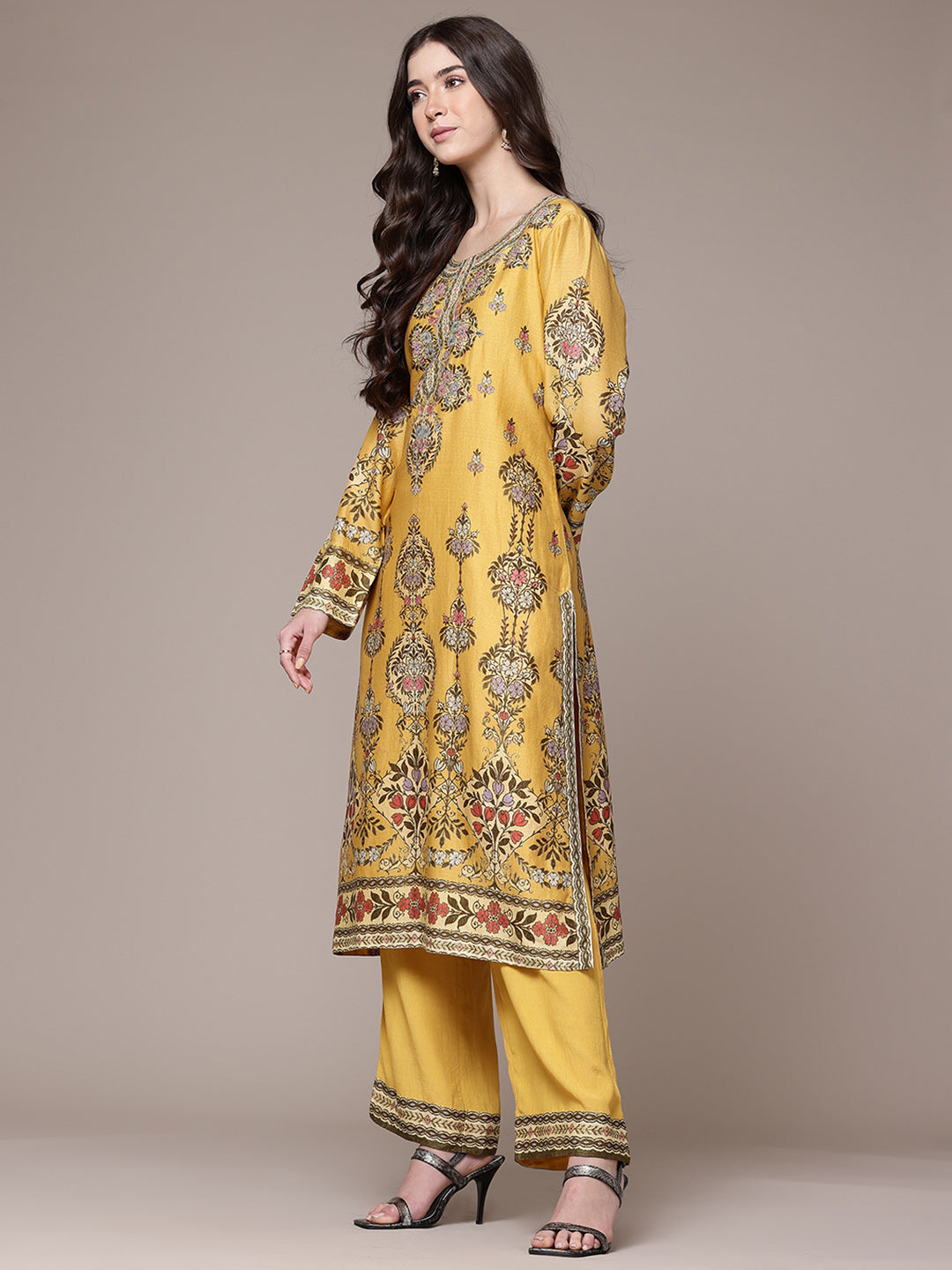 Vibrant and spirited, this yellow botanical print kurta set brings festive freshness to your wardrobe. The straight silhouette and crew neck add refined ease, ideal for day celebrations or casual get-togethers. Pair it with metallic sandals for an elevated yet easy vibe.