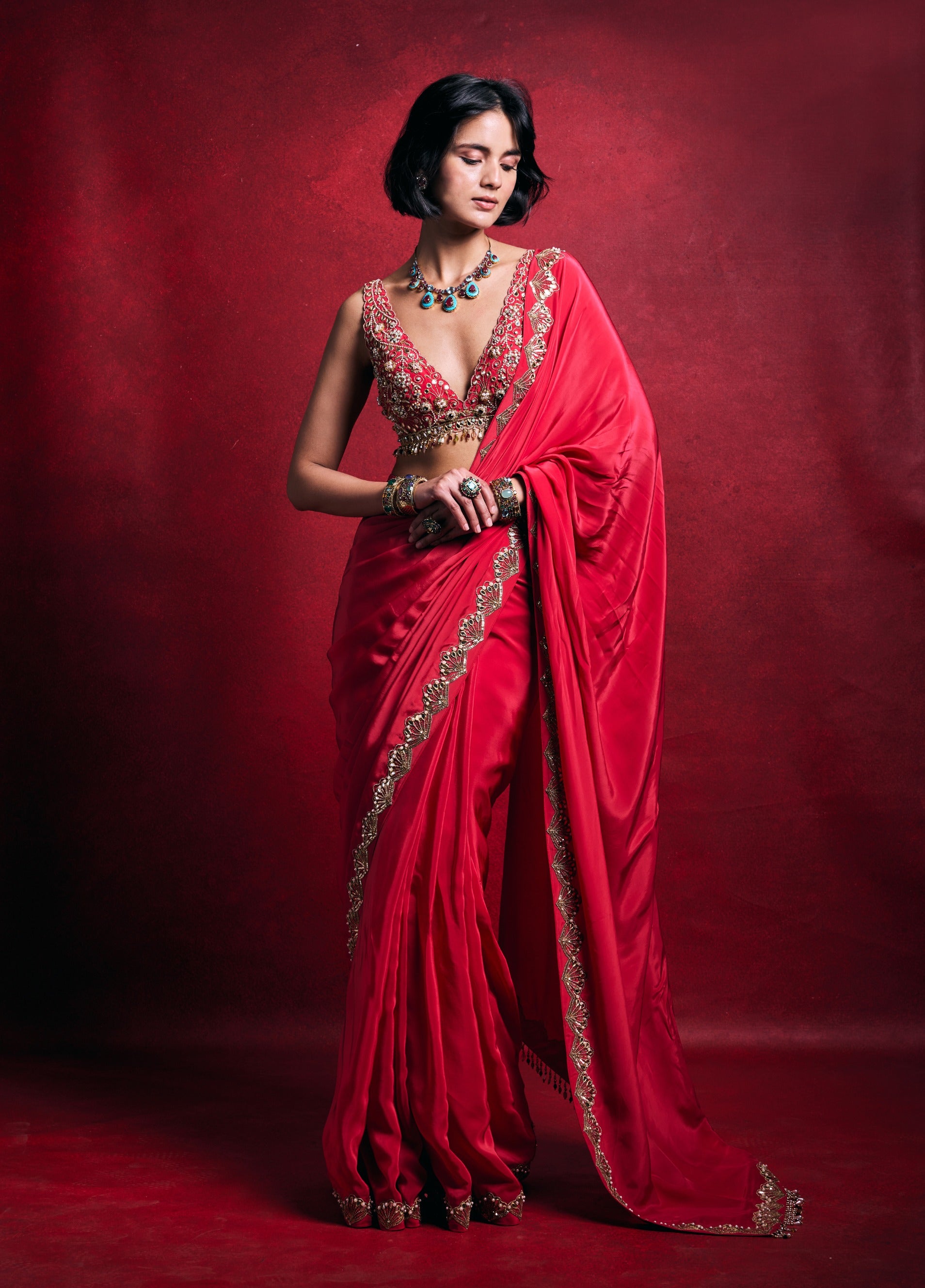 - Components: Sari, blouse, petticoat