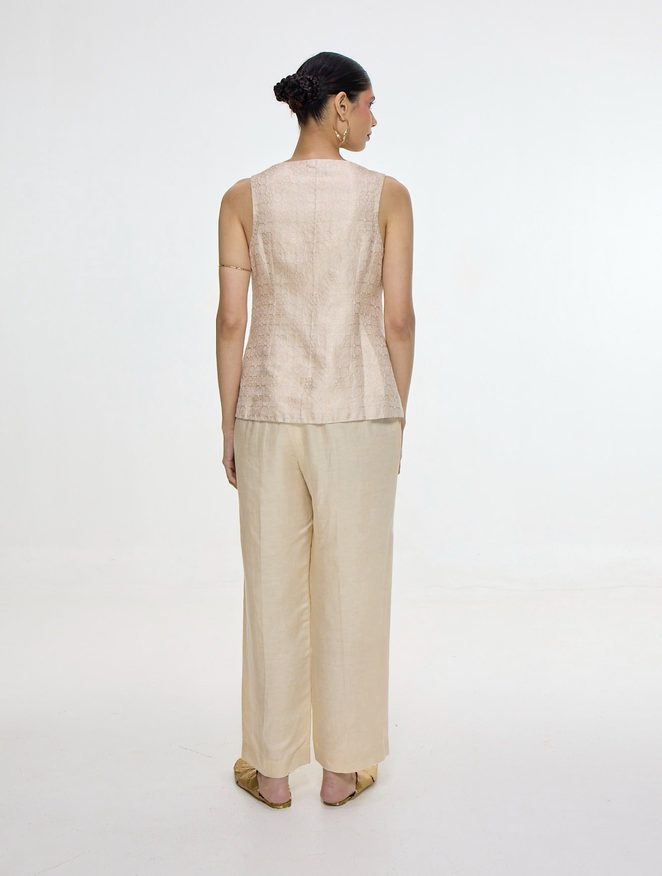 Reimagining banarasi for the modern muse, this ivory waistcoat set embodies understated sophistication. Handwoven in the tanchoi banarasi technique from the finest satin silk, it merges classic craftsmanship with a contemporary silhouette. Versatile and effortlessly elegant, it transitions seamlessly from wedding festivities to evening dinners with refined ease.