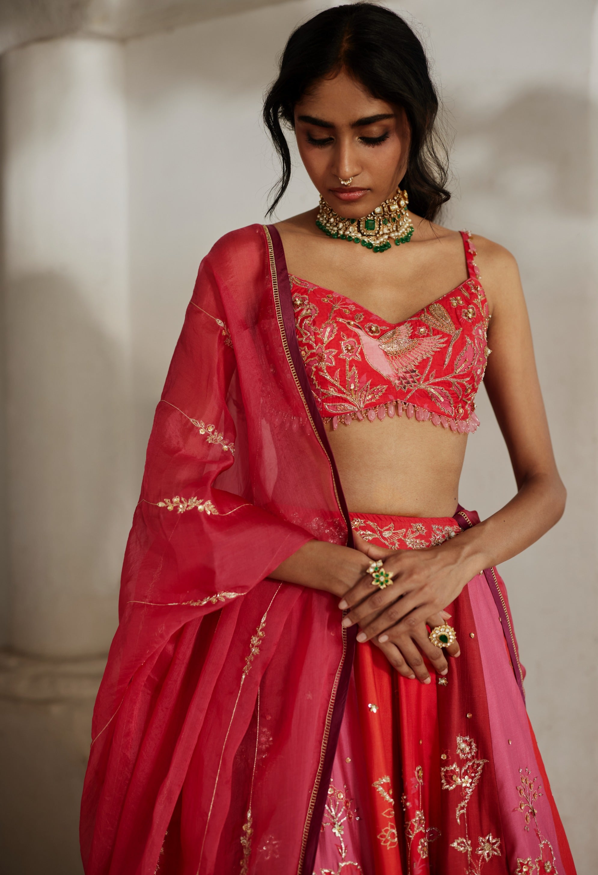 Bursting with festive colour, this lehenga set features bold floral prints and intricate hand embroidery with sequins, cutdana, and zari work.