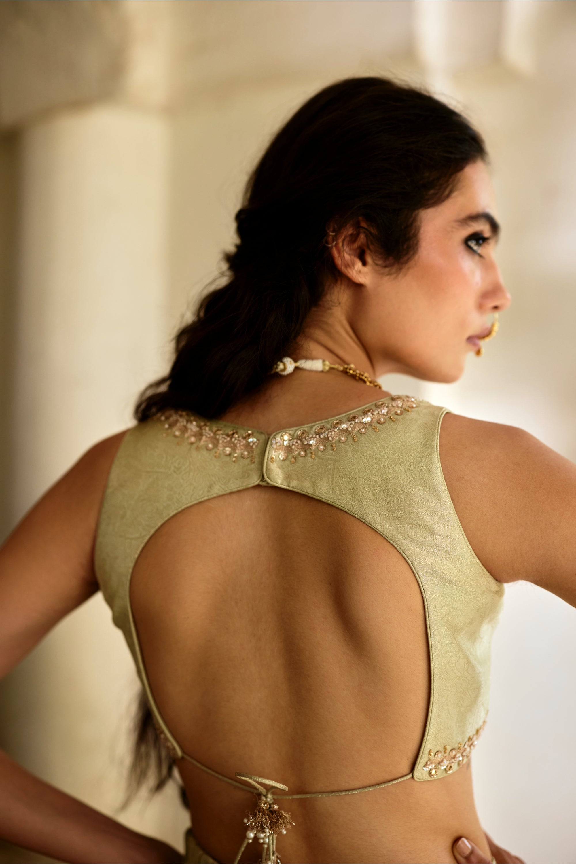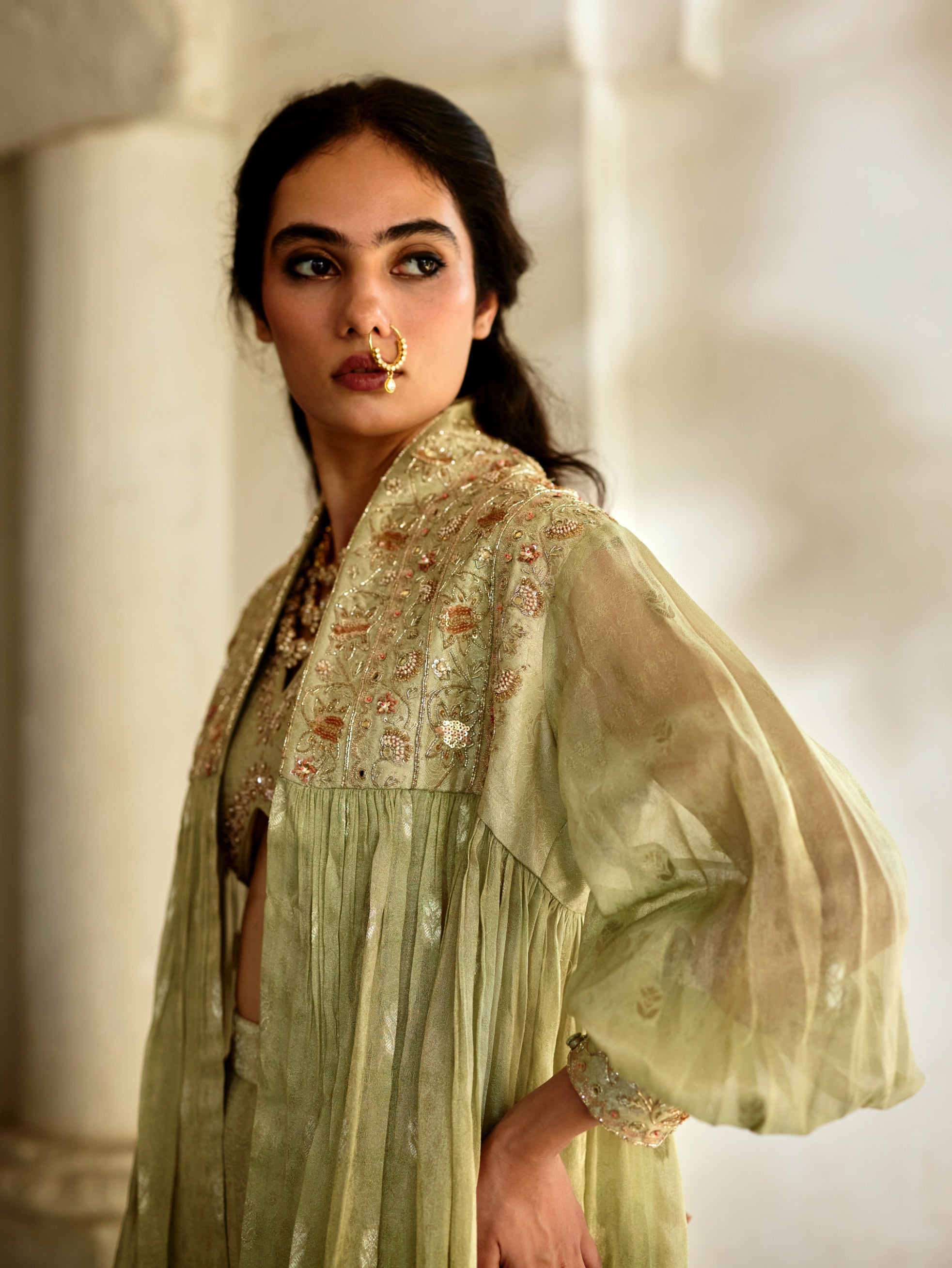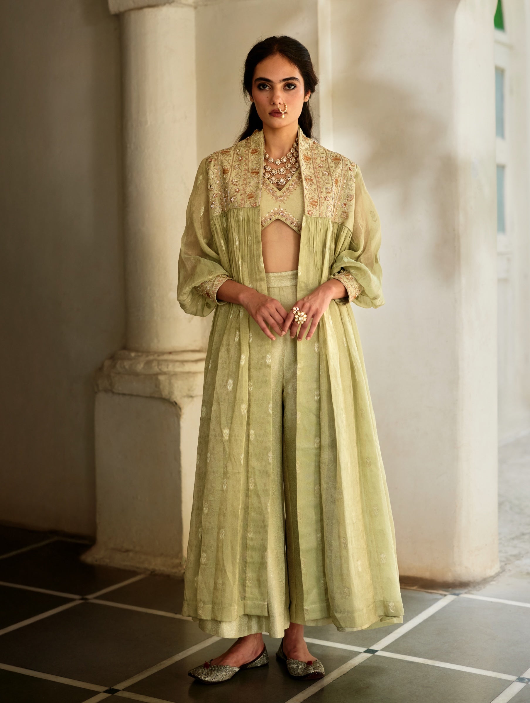 Celebrating heritage textiles, this jamavar co-ord ensemble features a hand-embroidered blouse and palazzo, elevated with a hand-woven tissue buti jacket.