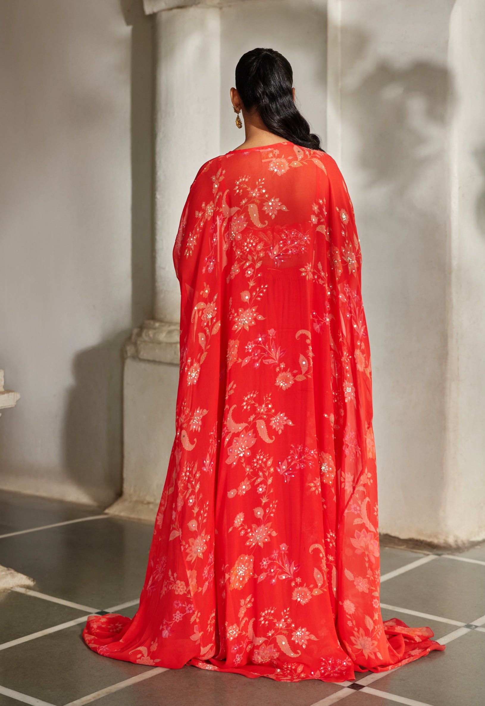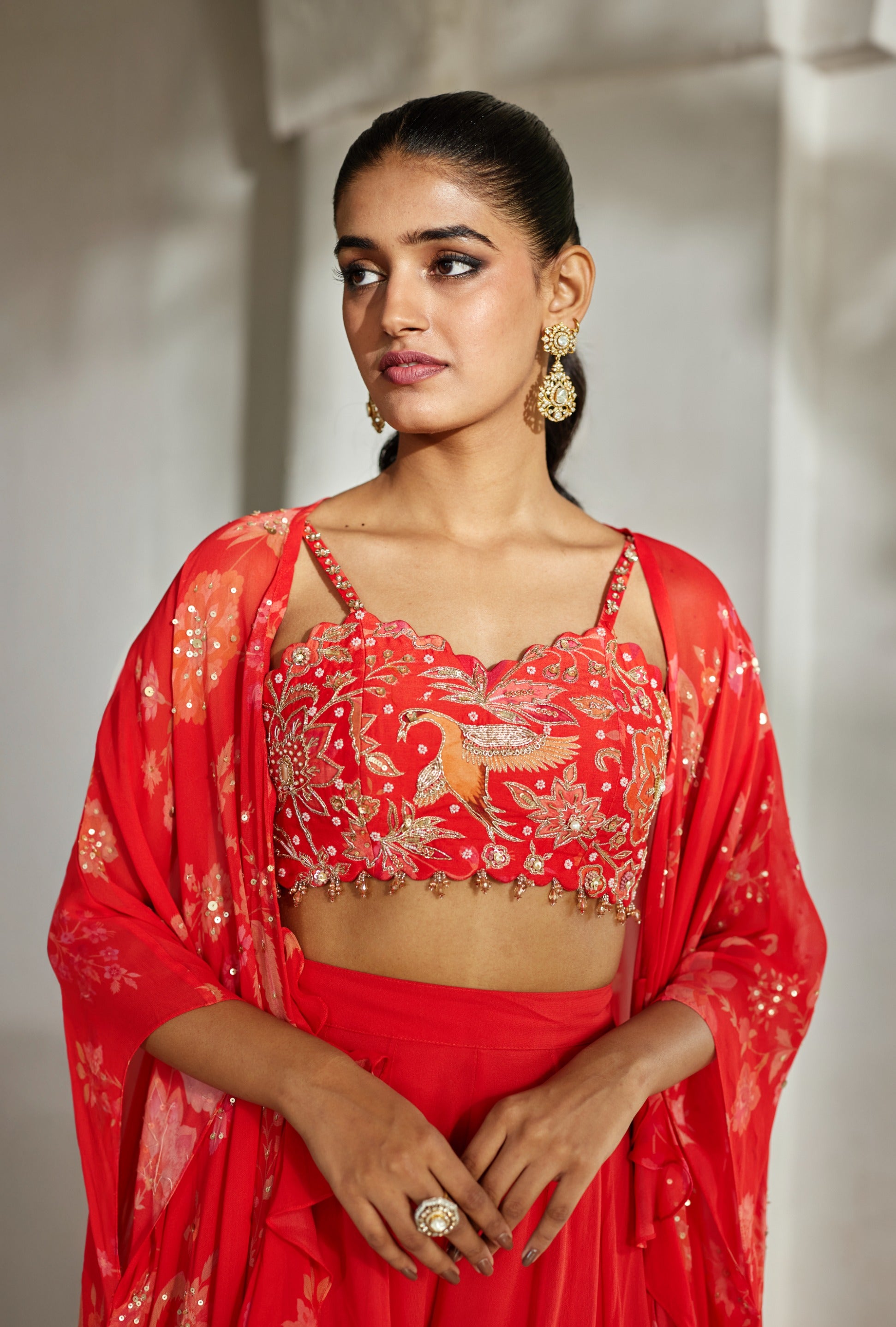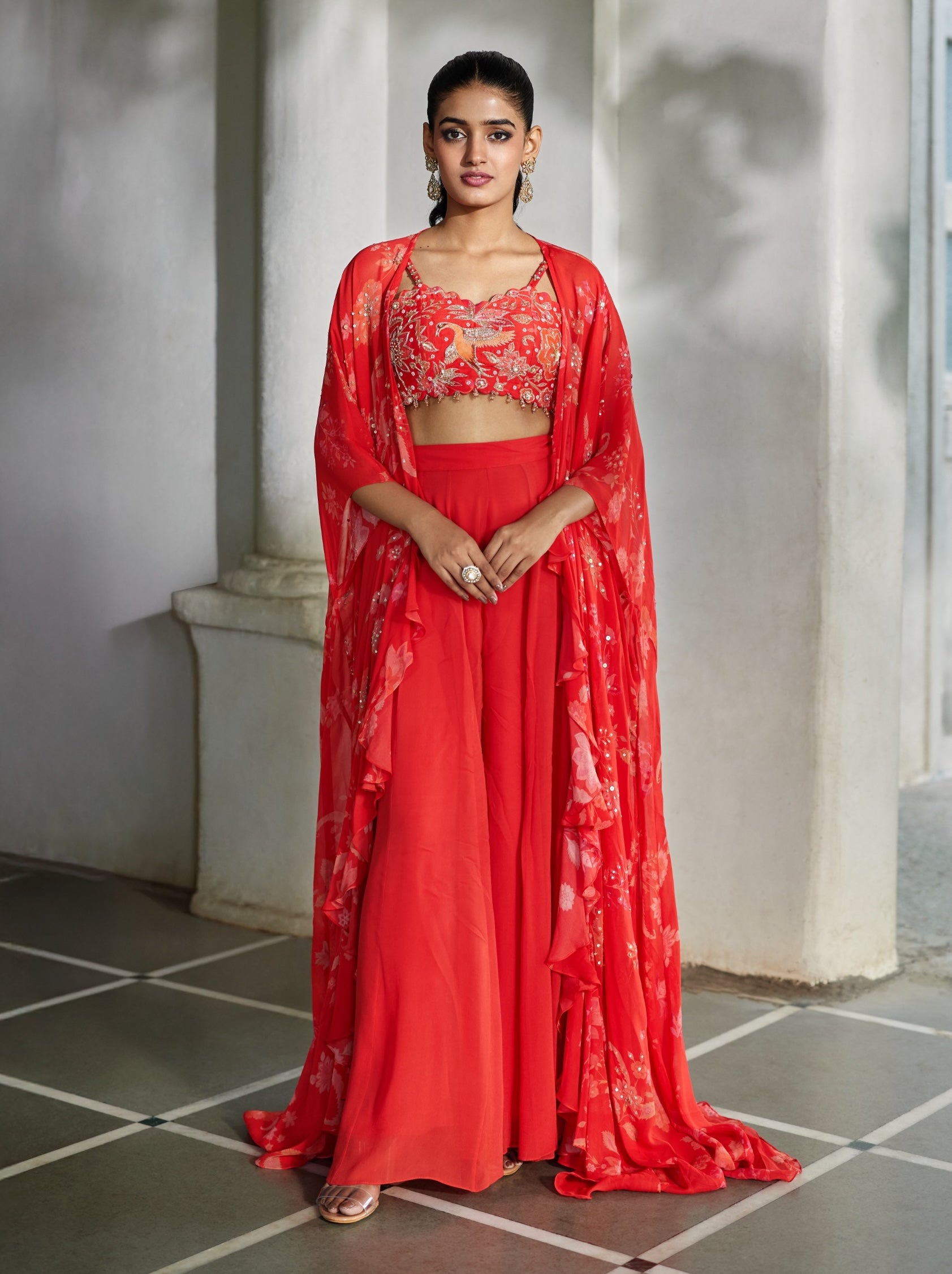 A printed dramatic jacket with sequin highlight detailing, paired with a hand-embroidered crop top featuring hanging accents along the waistline in the same print, and finished with flowing georgette palazzos.