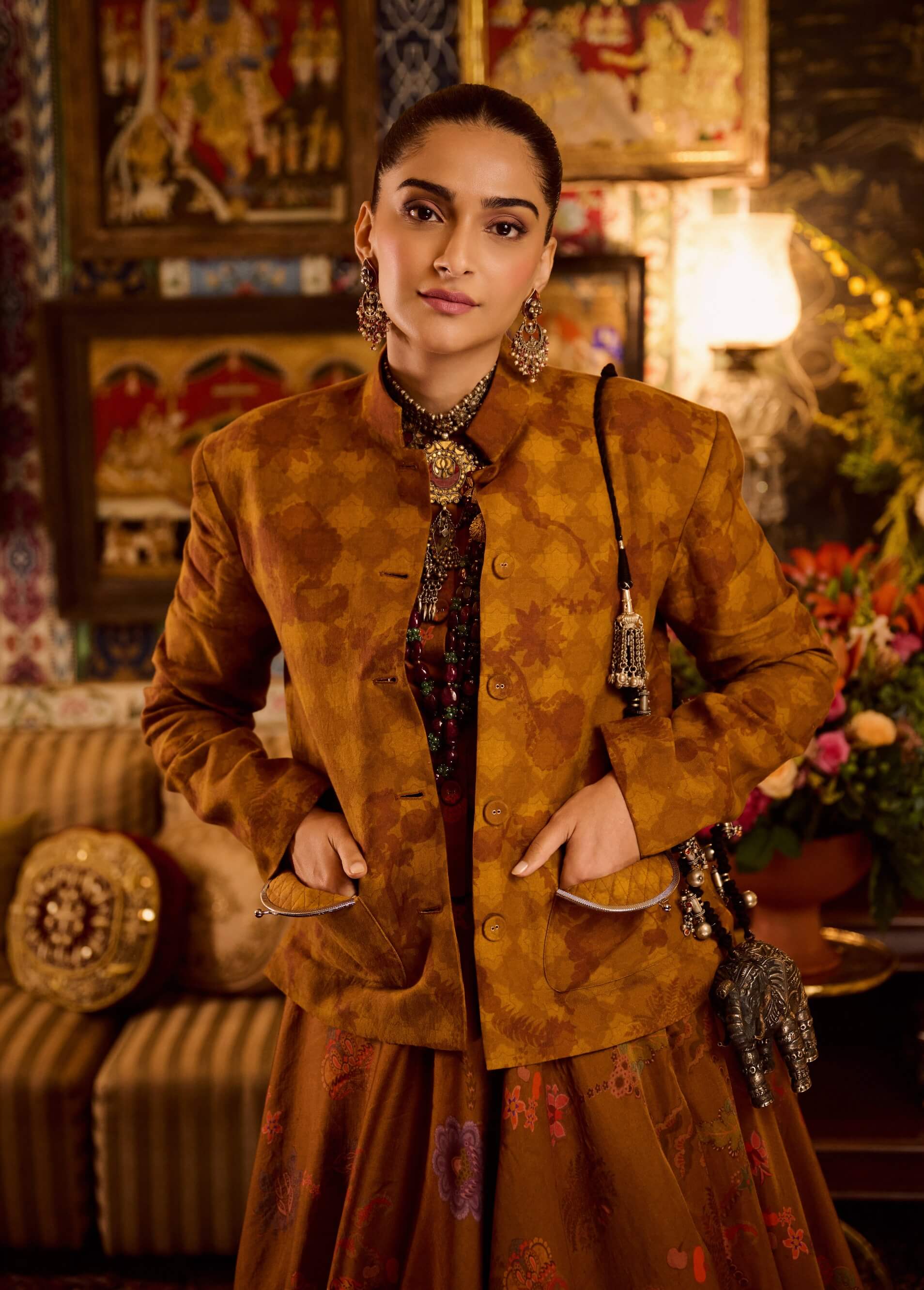 A contemporary take on the classic bandhgala, this jacket is reimagined with metallic batua-inspired pockets, paired with a voluminous kaleidoscopic ankle length bubble skirt, inspired by the way women in rural india tuck their sarees while working. The ensemble was gracefully worn by Sonam Kapoor, embodying its blend of tradition and modern artistry.