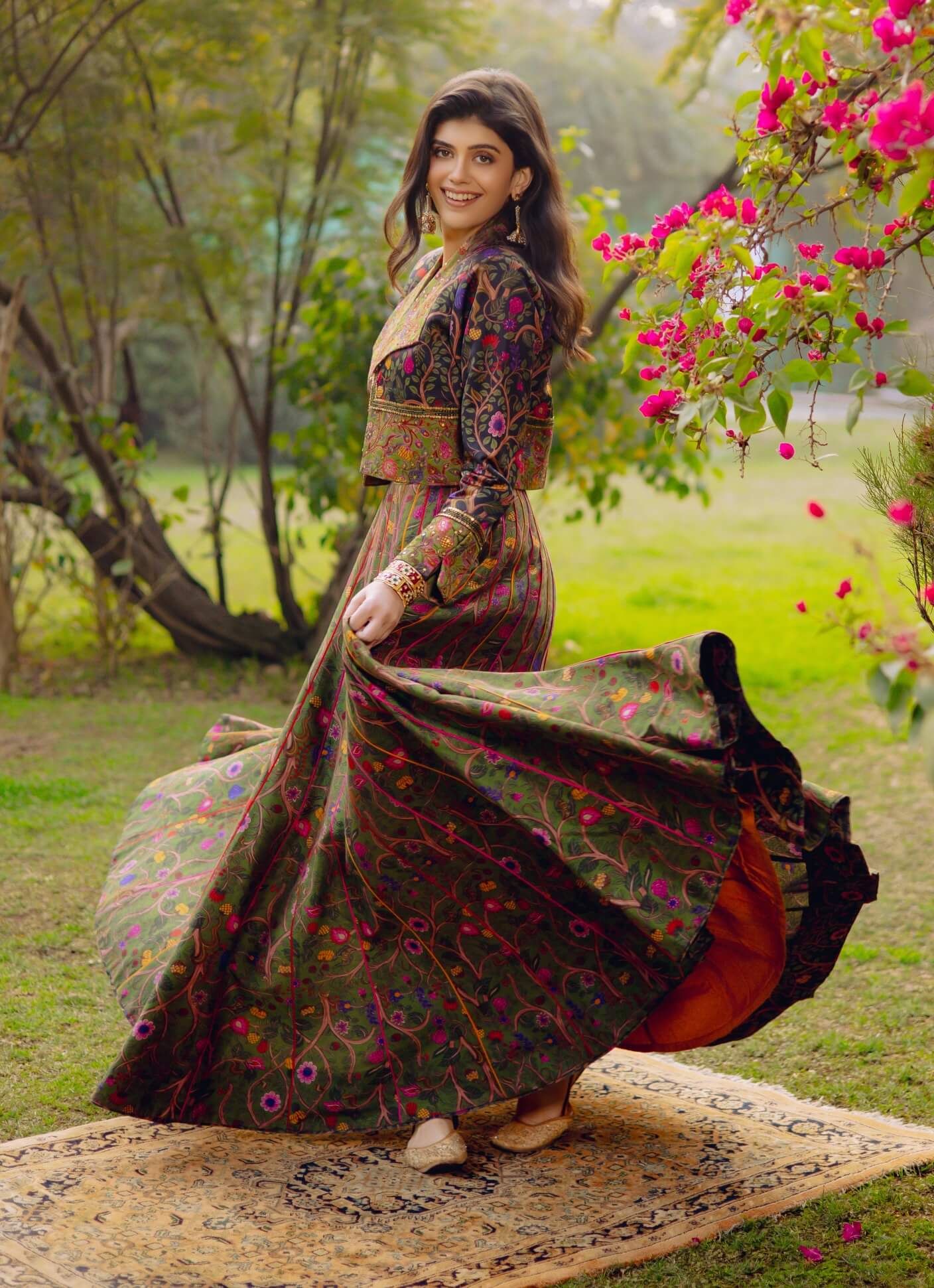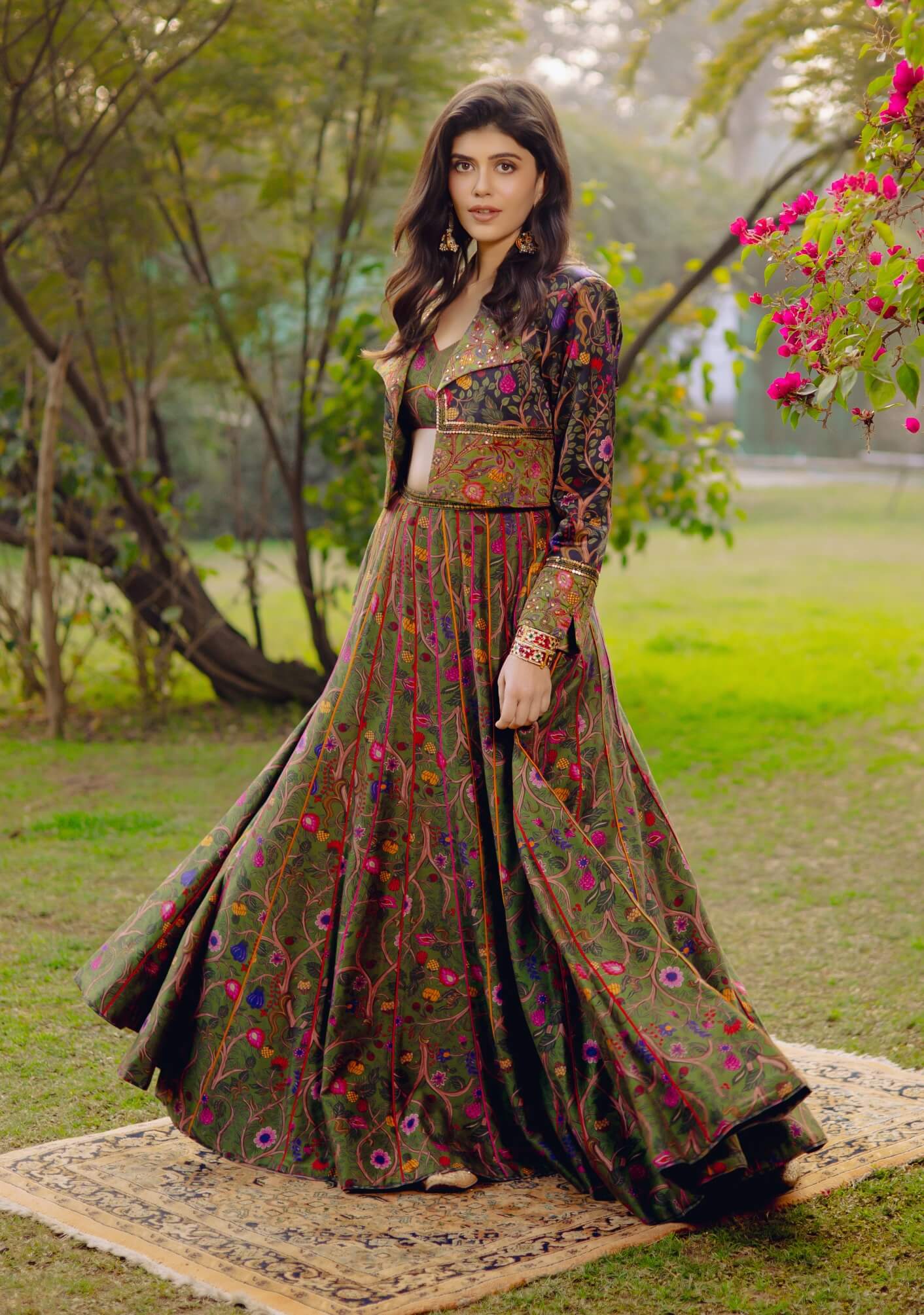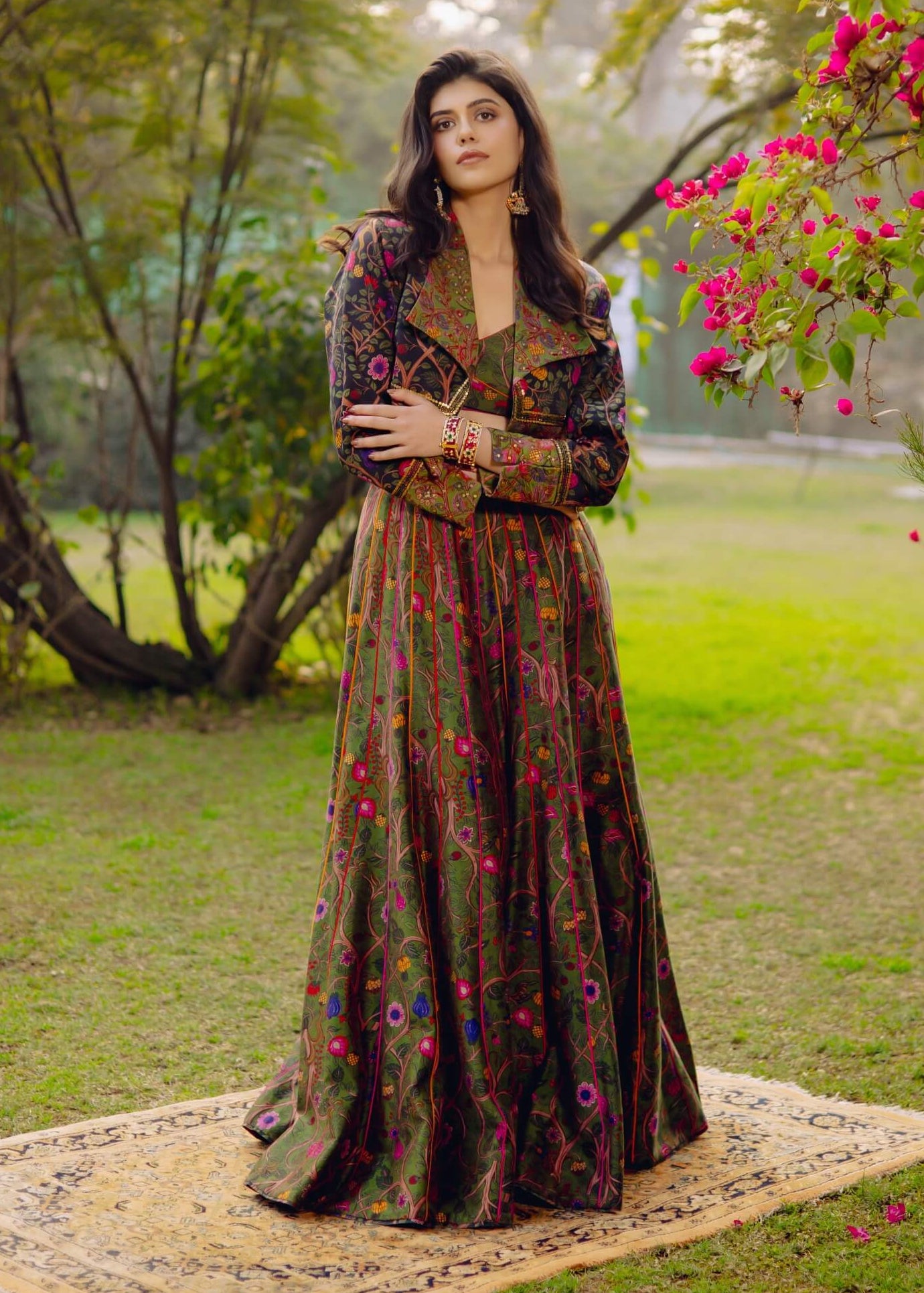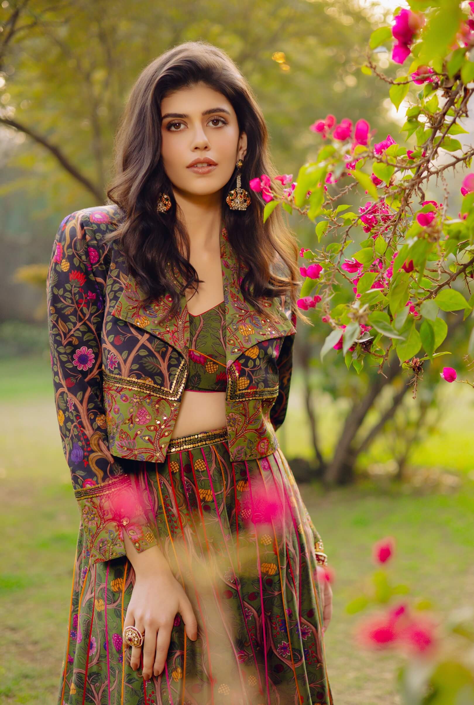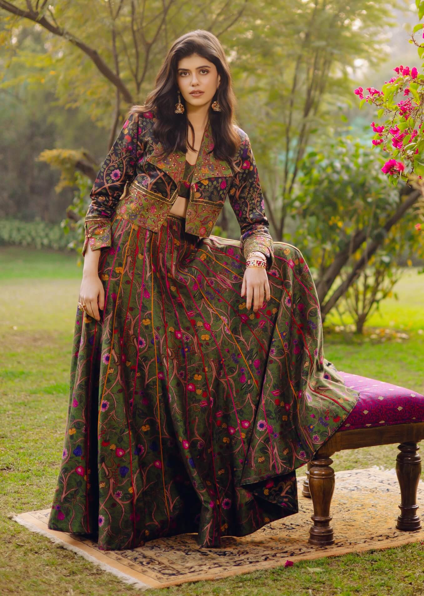 A newly introduced jacket and skirt set, designed with a subtle interplay of dual prints and accentuated with intricate resham and coin detailing.