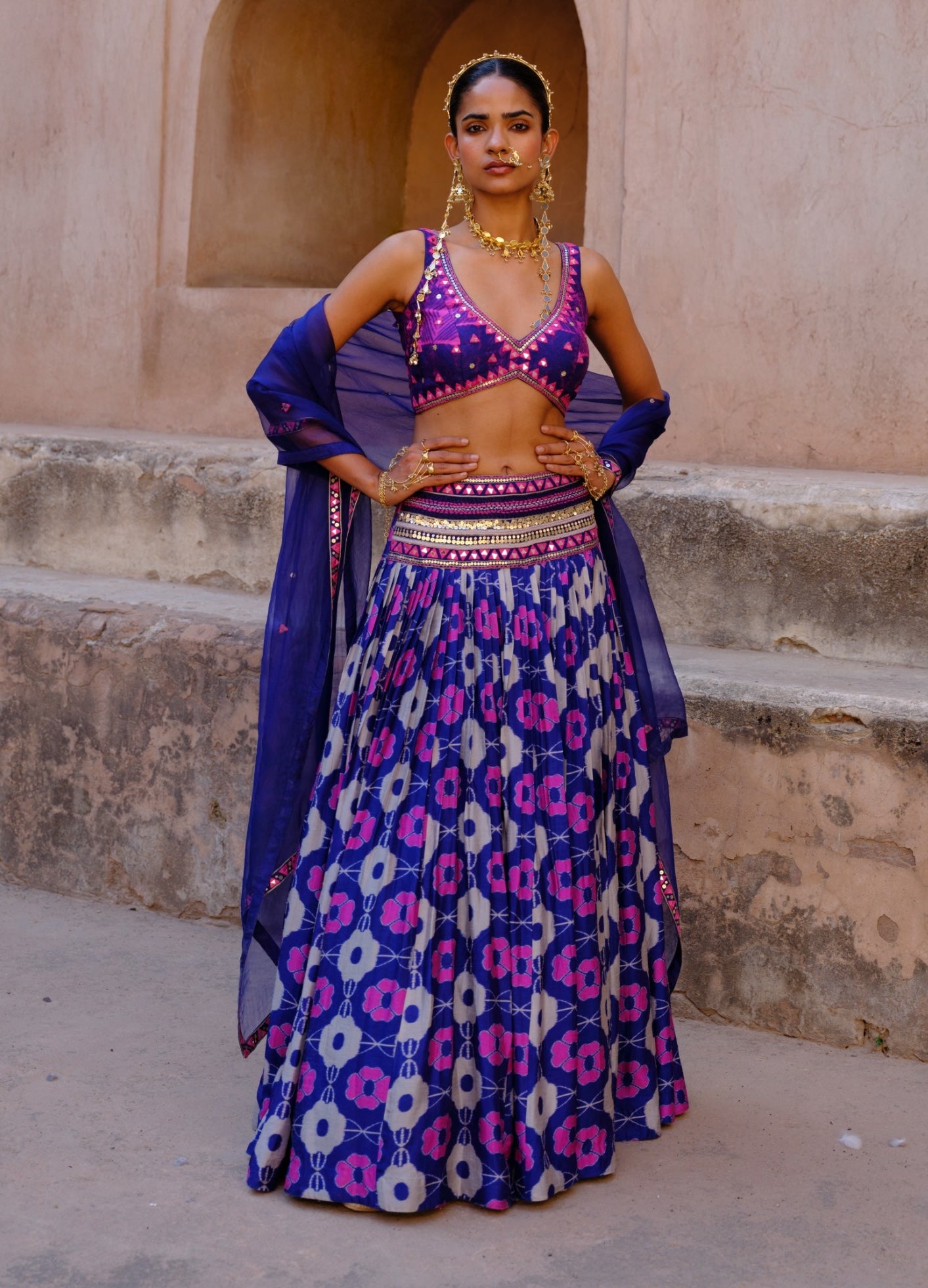 Radiating stylised wedding luxury, the aarya lehenga features an intricately embroidered blouse paired with a printed embroidered skirt and an organza dupatta. The layered textures and embroidery add depth and refined brilliance. The blue palette feels regal yet modern. Perfect for sangeet nights, engagement celebrations, and festive weddings.