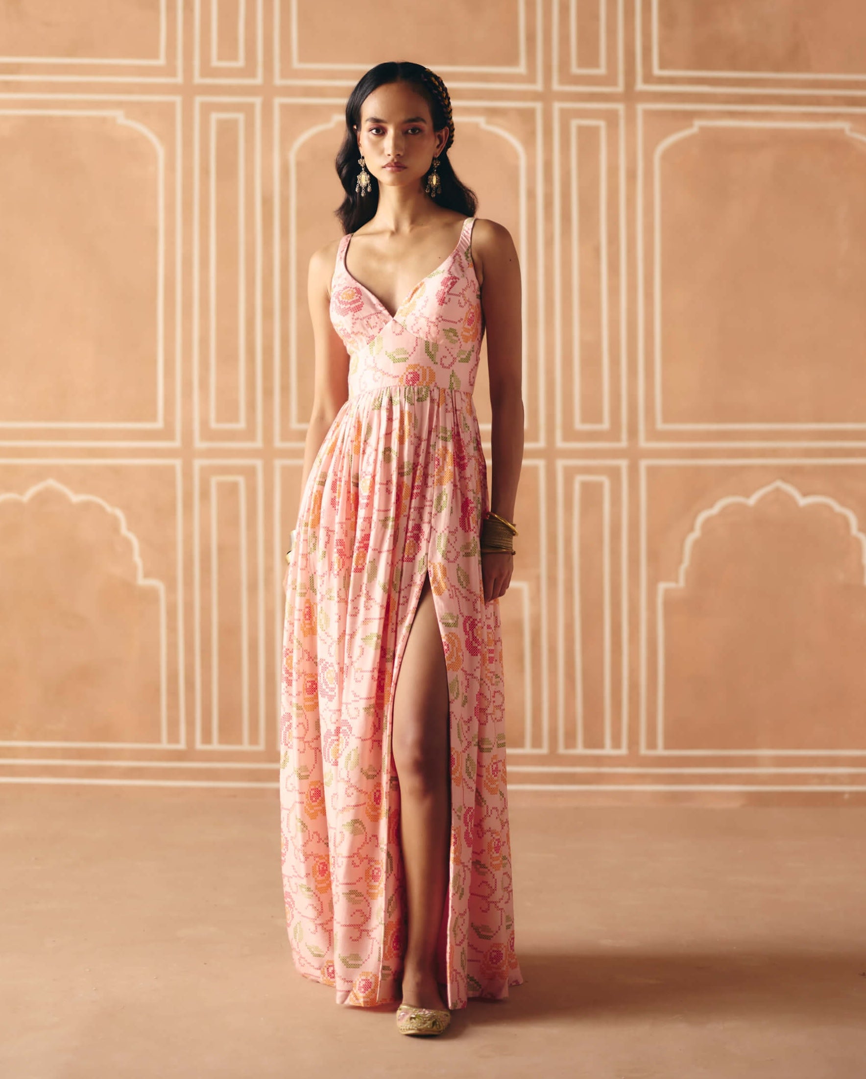 Romantic and refined, this printed gathered maxi dress in blush pink is a versatile choice for destination weddings, cocktail nights, or elegant evening celebrations.