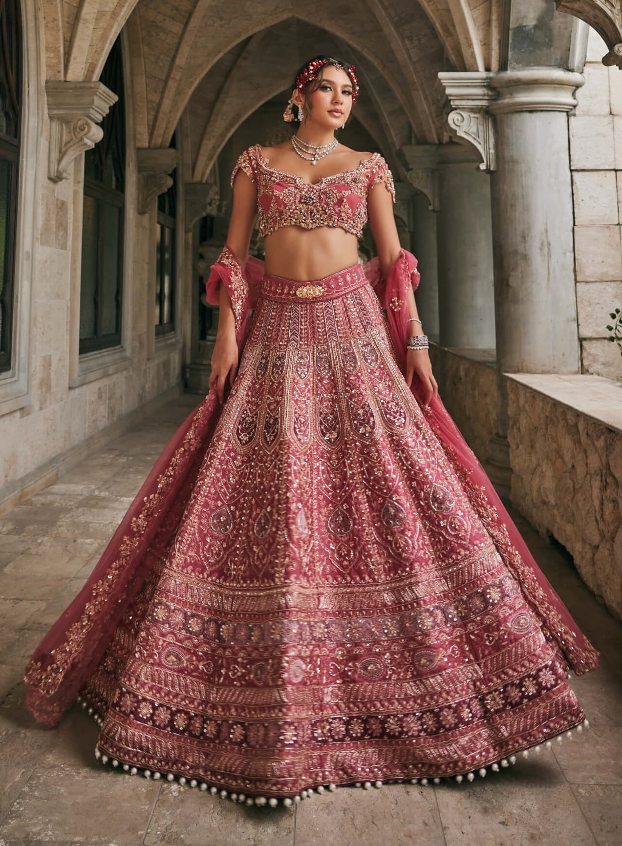 Drenched in a romantic dusky rose hue this raw silk lehenga features intricate threadwork and sequin embroidery in traditional motifs. The structured blouse with crystal embellishments and a sweetheart neckline adds modern charm.