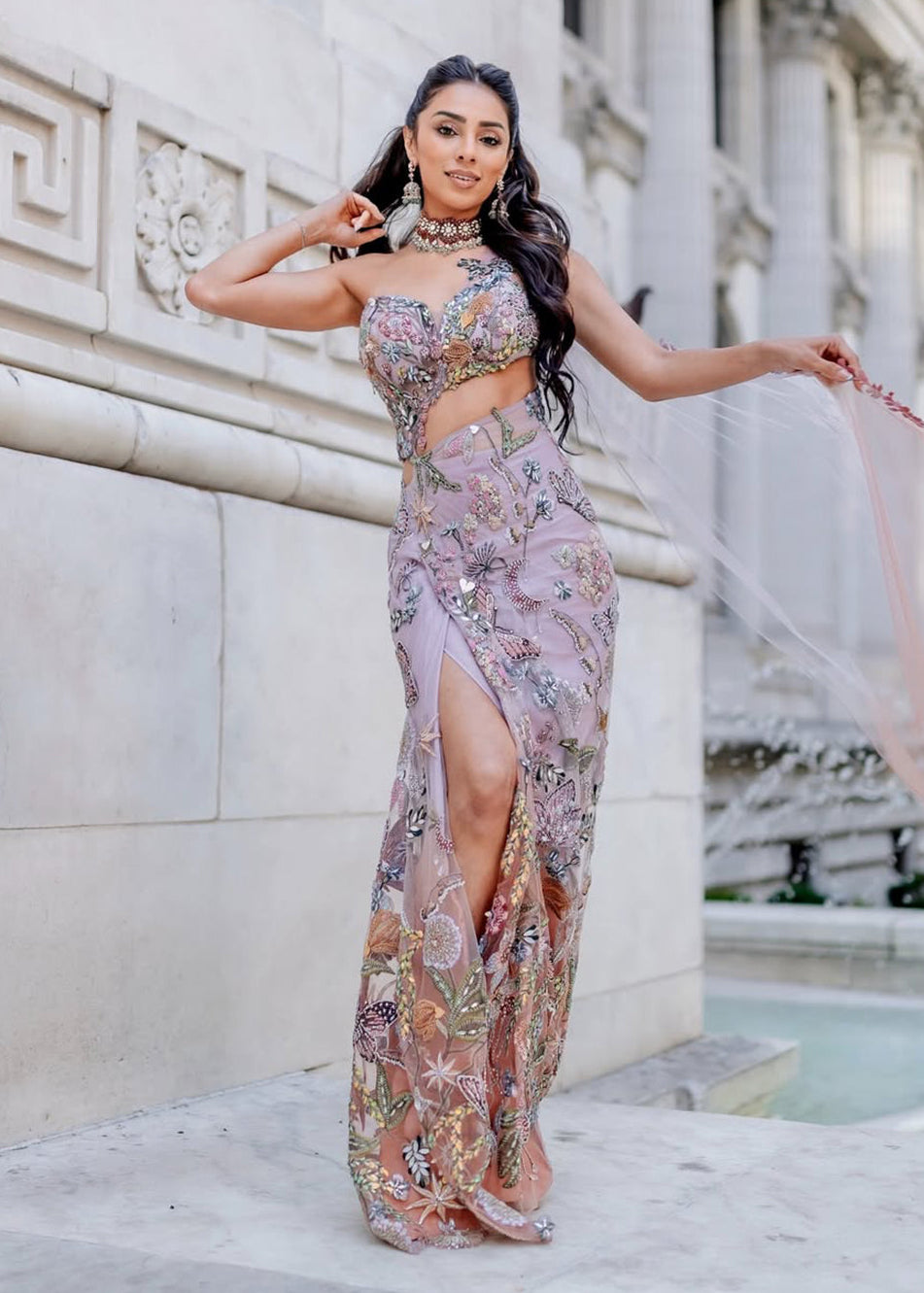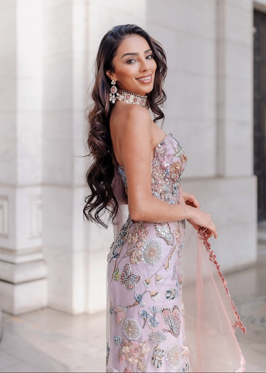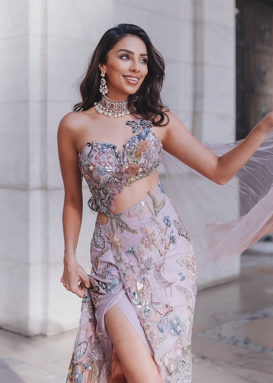 A whimsical expression of modern elegance, the Elysia one-piece pre-draped sari is crafted in a serene blend of taupe and orchid tint. Intricate hand embroidery of wildflowers, celestial moons, and signature butterfly motifs is delicately highlighted with heart-cut mirrors that add a playful shimmer. The ensemble features a floral strap blouse with intricate motifs and a back zip closure, paired with a pre-draped sari skirt finished with a concealed off-centre back zip for ease. Completing the look is a flowy translucent butterfly net ombré dupatta, beautifully edged with floral creepers, lending the silhouette a dreamy, free-spirited charm.
