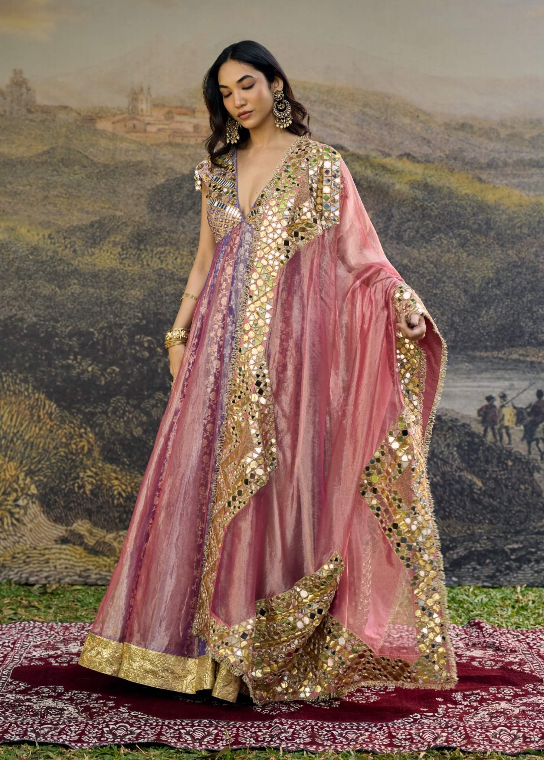 A celebration of colour and craft, the gulrangi pink purple mirror anarkali set embodies festive opulence. This set includes a panelled tissue anarkali adorned with intricate mirror hand embroidery across the bodice and a mirror embroidered tissue dupatta. The flowing silhouette enhances movement and elegance. Perfect for mehendi ceremonies, wedding festivities, and cultural celebrations.