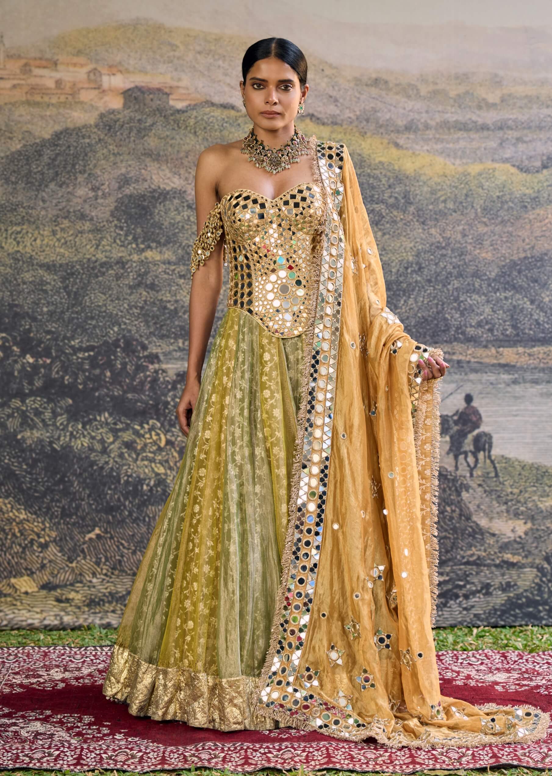 Vibrant and striking, the hiranya yellow green mirror lehenga set captures festive brilliance. The ensemble includes a long mirror-embroidered corset paired with a panelled tissue lehenga and an embroidered dupatta. The shimmering mirror detailing adds movement and dramatic flair. Perfect for mehendi ceremonies, sangeet nights, and celebratory gatherings.