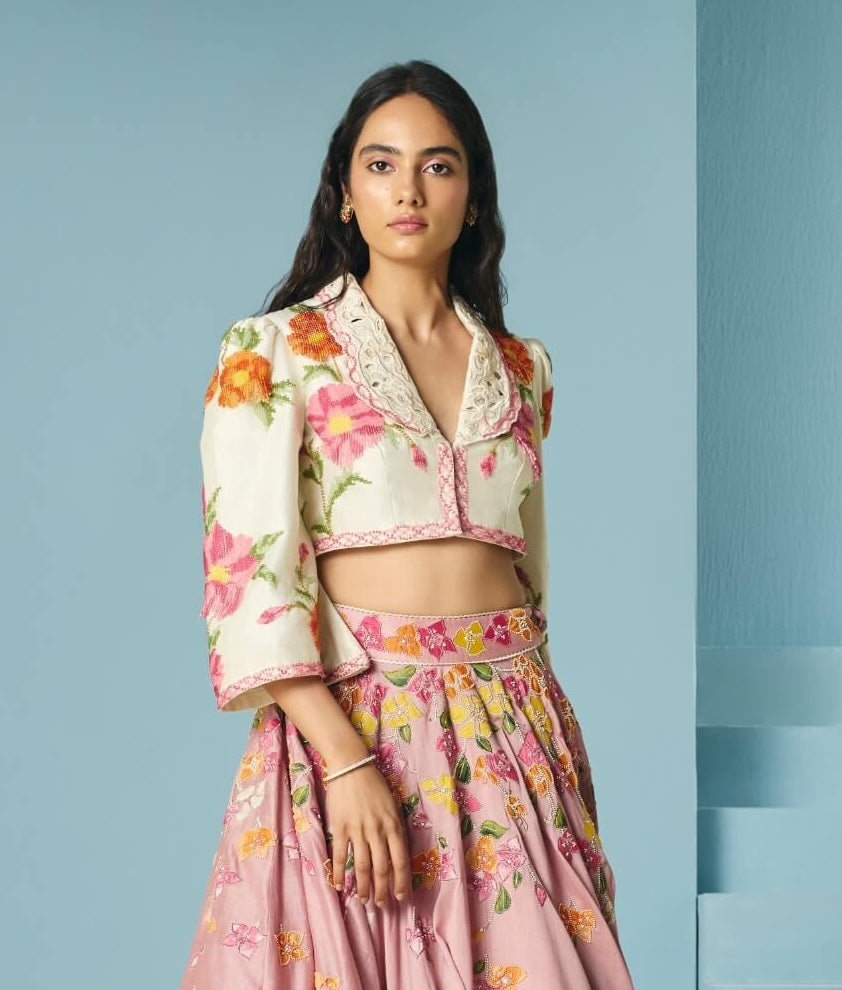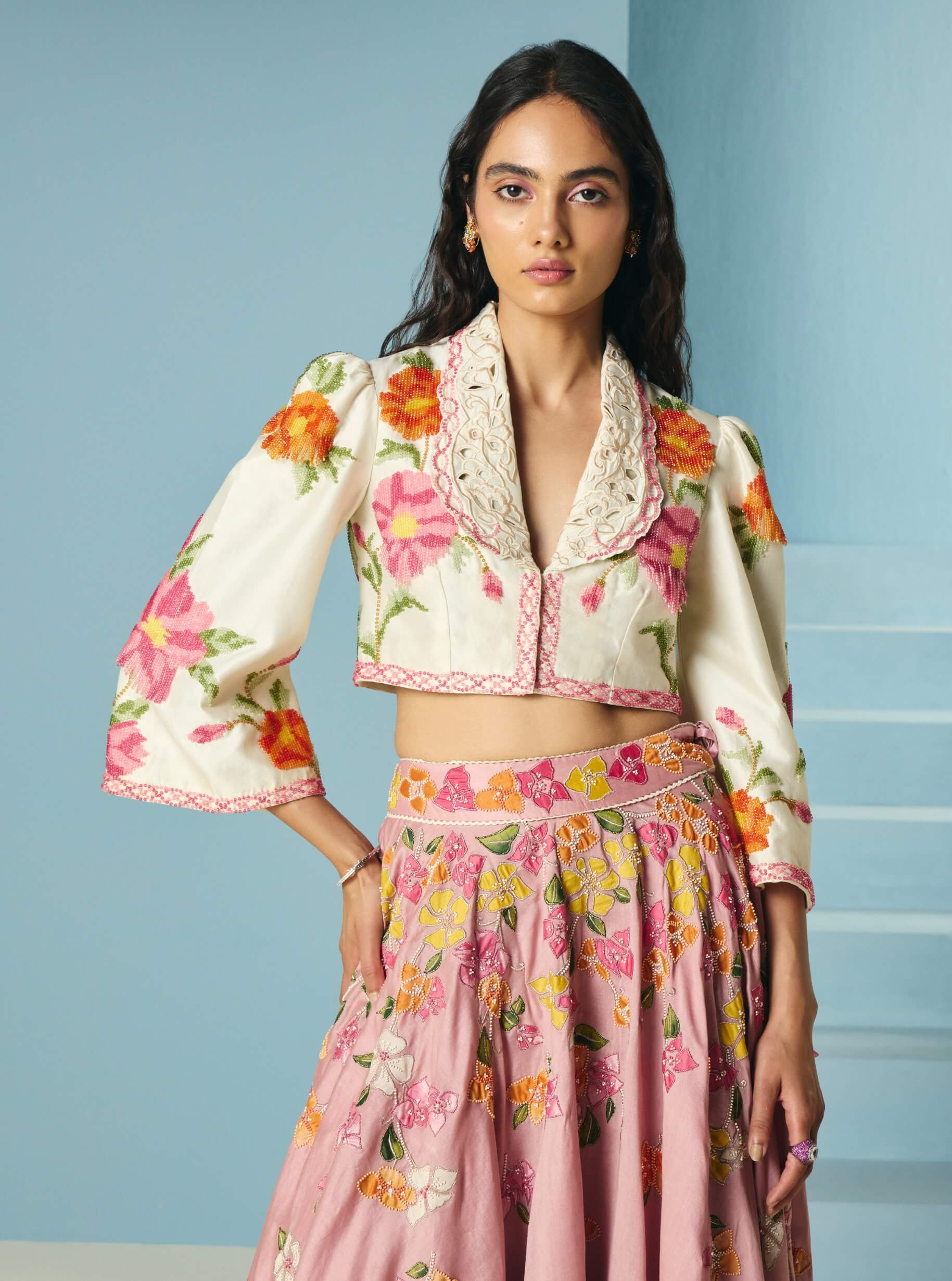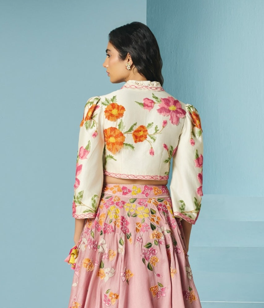 Delicately detailed, this ivory bolero jacket features floral beadwork accented with playful fringe detailing. The cropped silhouette adds texture and charm. Perfect for daytime celebrations, cocktail evenings, and statement styling.