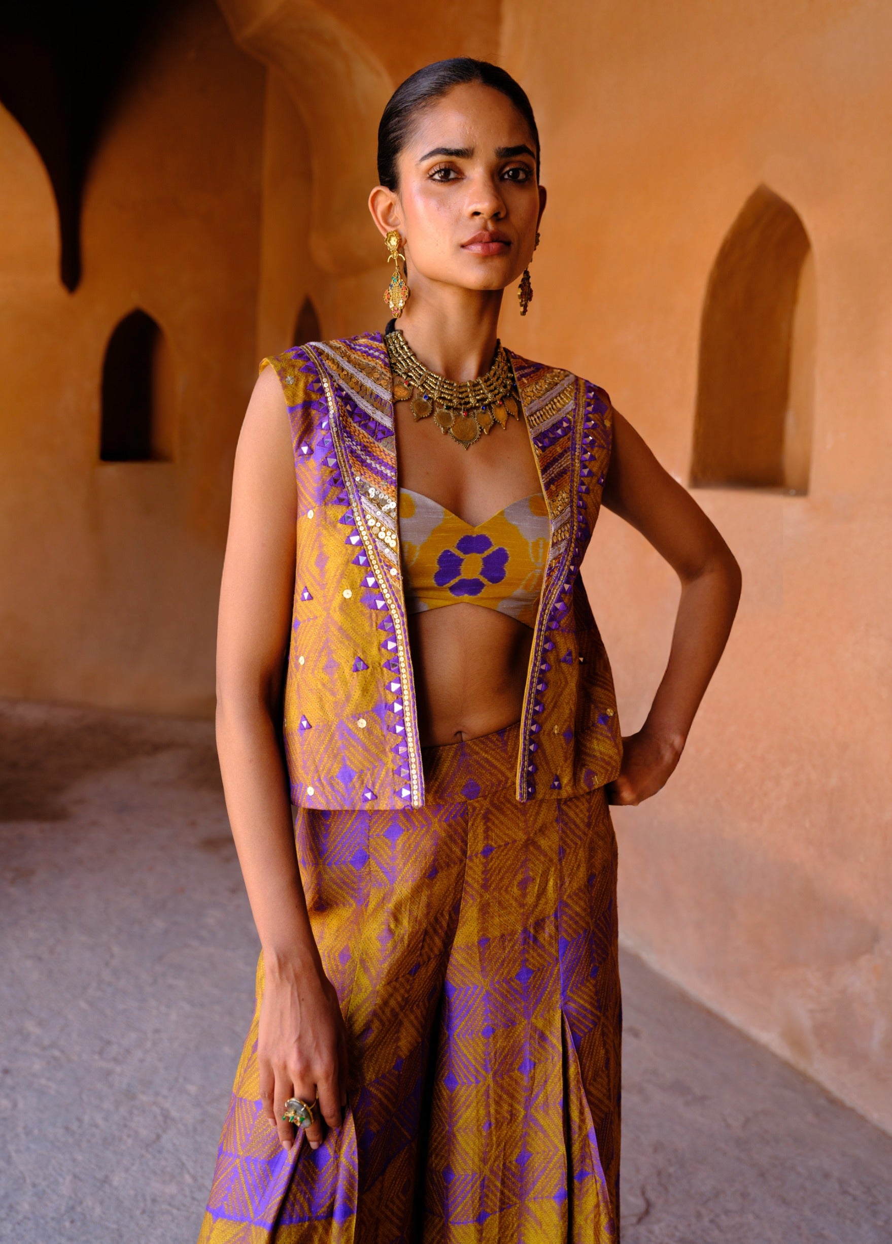 Boldly expressing stylised festive luxury, the navya co-ord features an intricately hand-embroidered jacket layered over a printed crop top with box pleat pants. The structured silhouette blends contemporary style with artisanal detail. Vibrant prints add playful sophistication. Perfect for sangeet nights, festive parties, and celebratory events.