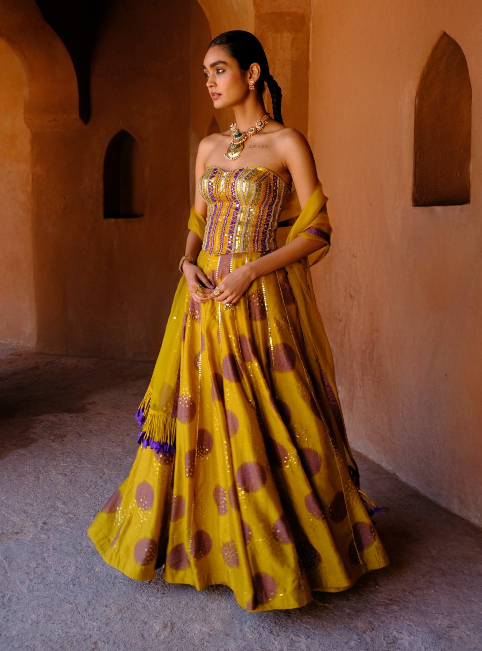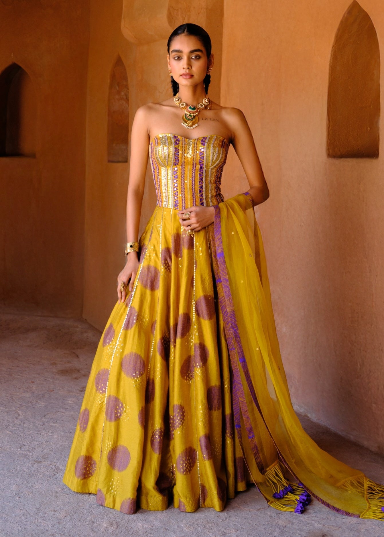 Glowing with stylised festive luxury, the navya lehenga features an intricately hand-embroidered corset paired with an embroidered kali skirt and a tasseled dupatta. The structured bodice contrasts beautifully with the flowing skirt. Rich yellow tones evoke joyful celebration. Perfect for haldi ceremonies, sangeet nights, and vibrant wedding festivities.
