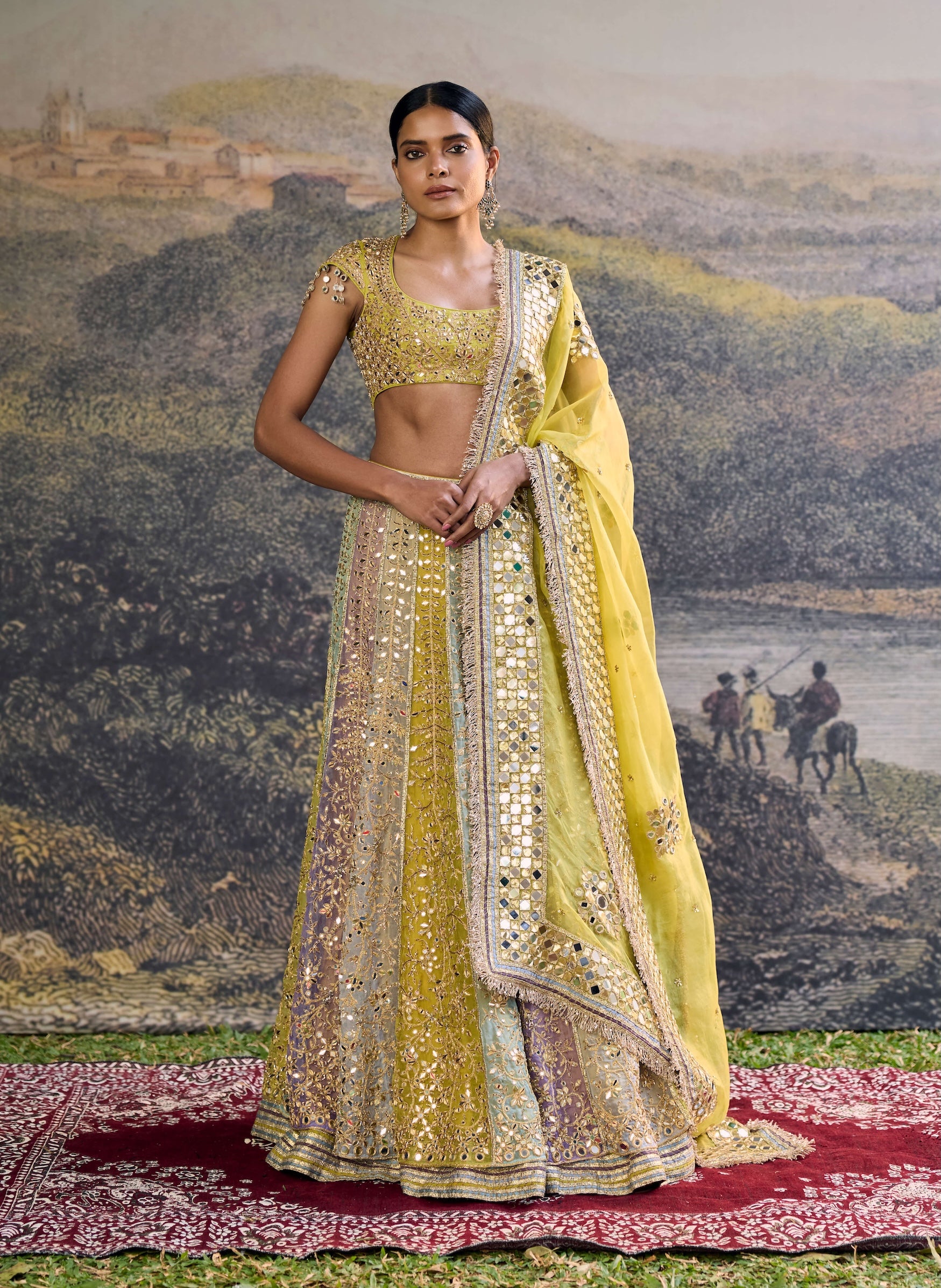Vibrant and celebratory, the rang mahal multicolour mirror lehenga set radiates joyful colour. The ensemble includes a layered multicolour lehenga in hues of purple, blue, yellow, and orange paired with an embroidered blouse and an organza dupatta adorned with mirror and gota work. The design creates lively movement and sparkle. Perfect for sangeet nights, festive weddings, and grand celebrations.