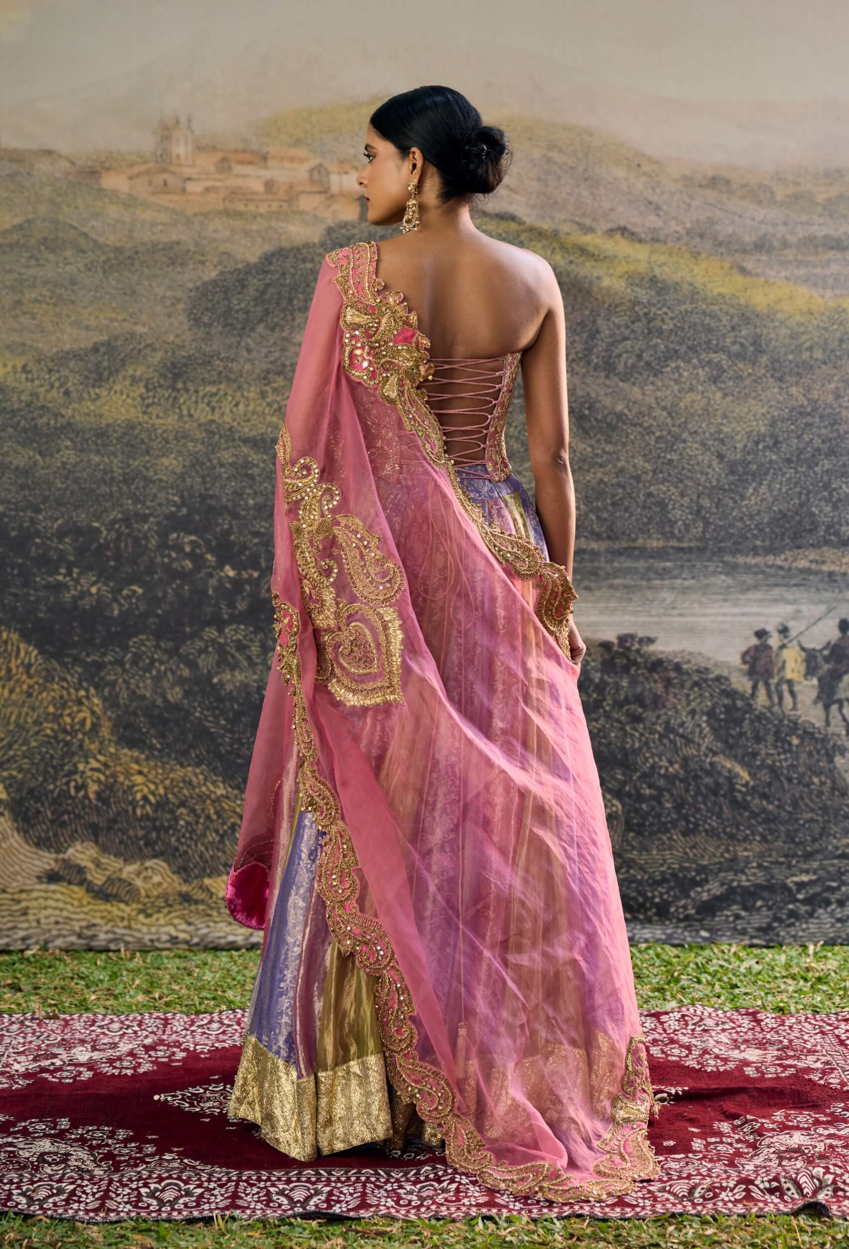 Rich in colour and texture, the rangoli zari pink purple green lehenga set celebrates intricate craftsmanship. This ensemble includes a zari embroidered tissue corset, a ghered panel lehenga crafted in pink and purple tissue, and a heavily embroidered organza dupatta. The silhouette creates graceful drama with every movement. Ideal for wedding festivities, sangeet celebrations, and grand occasions.