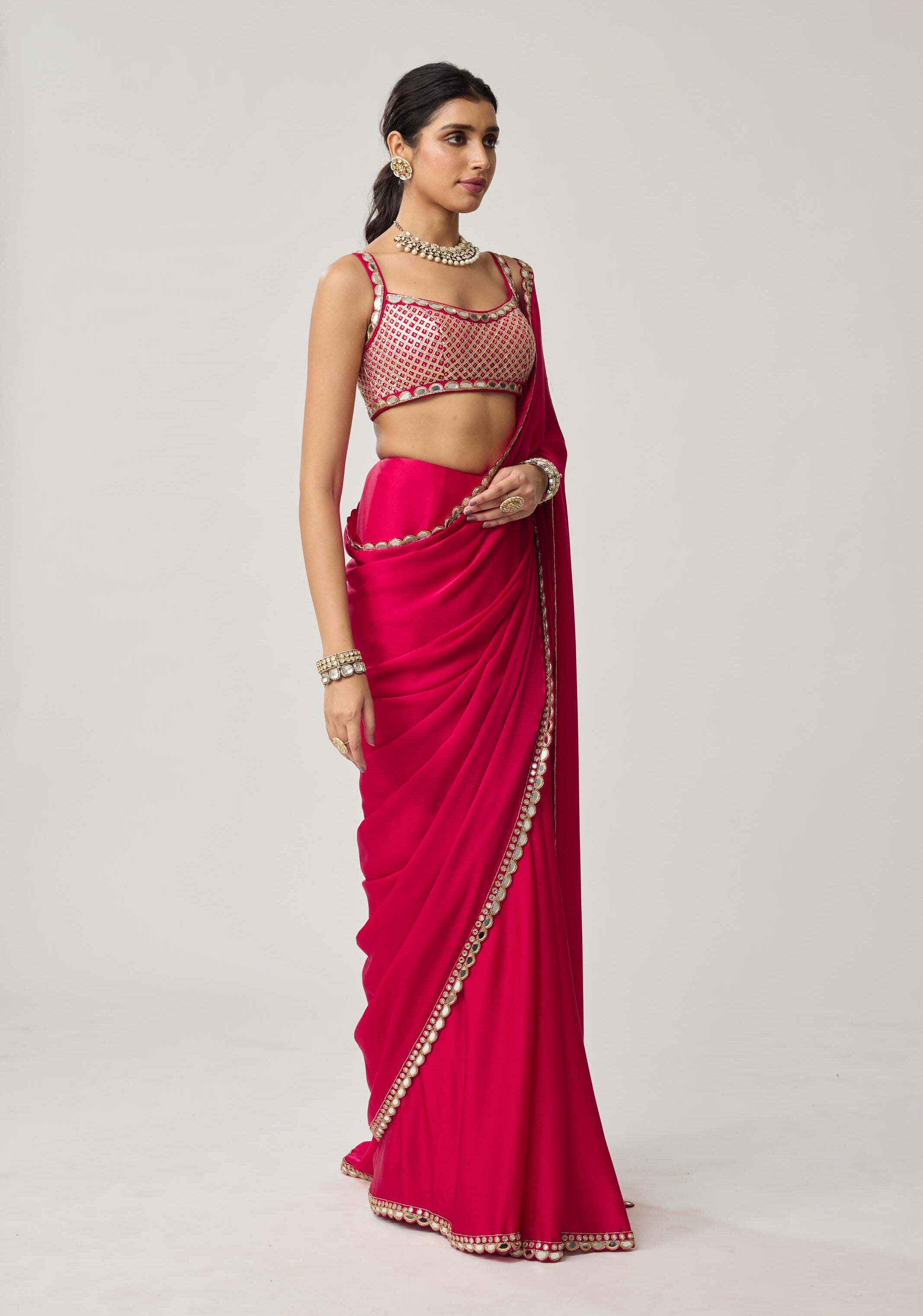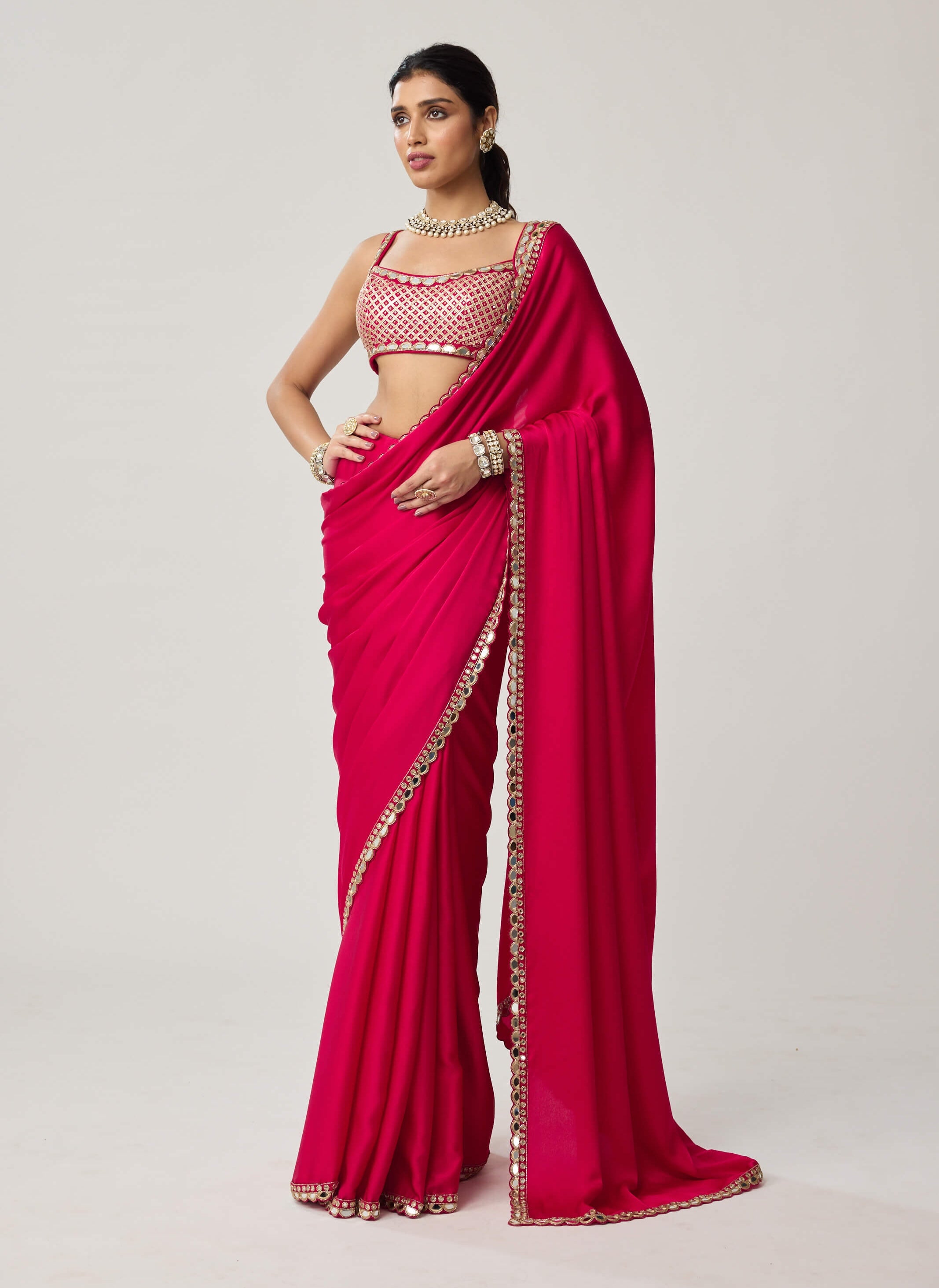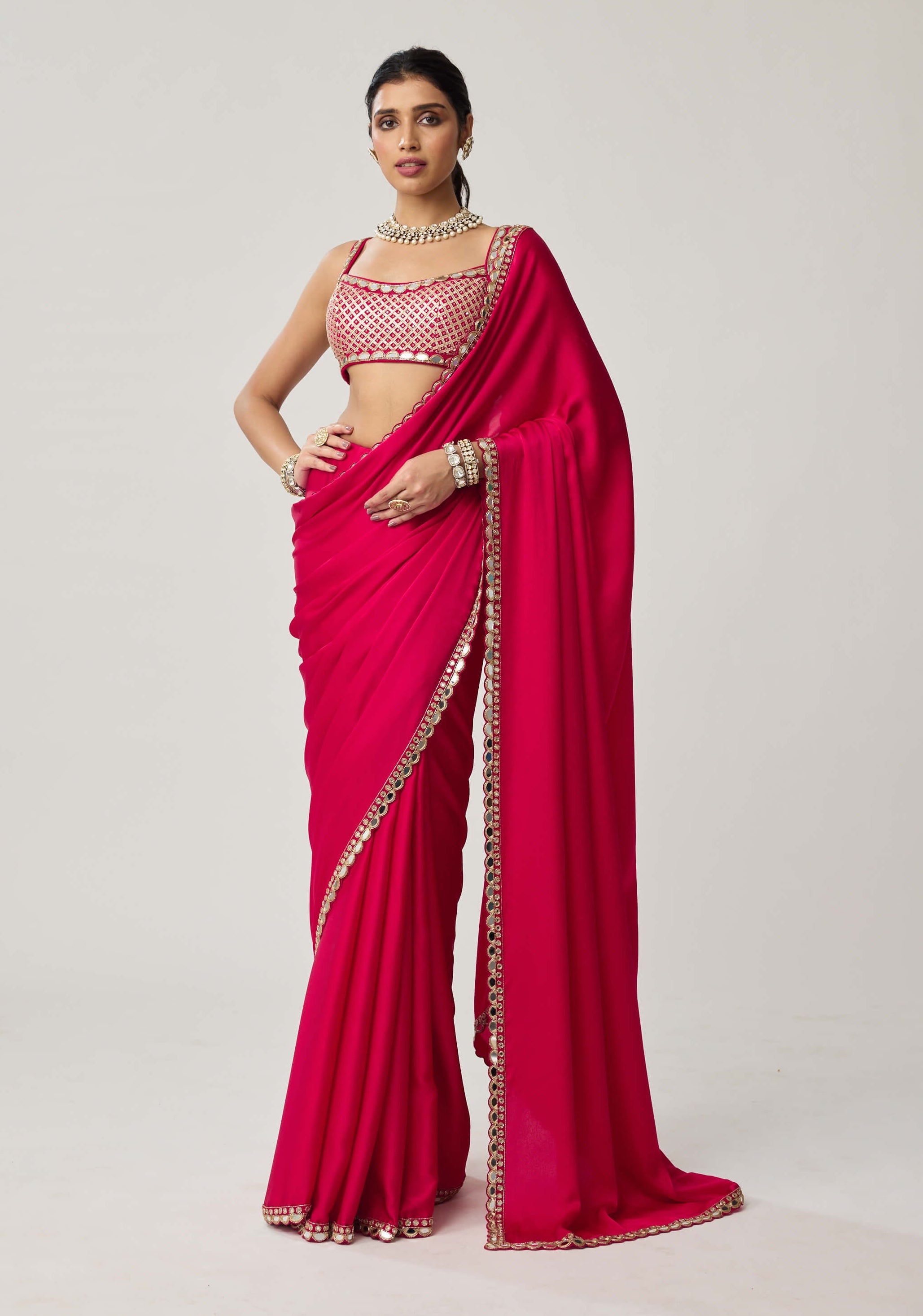 Sleek, luminous, and impeccably detailed, this crimson red satin sari celebrates artisanal craftsmanship. The sleeveless blouse complements the fluidity of the drape, ideal for festive soirées or wedding events that call for contemporary grandeur.