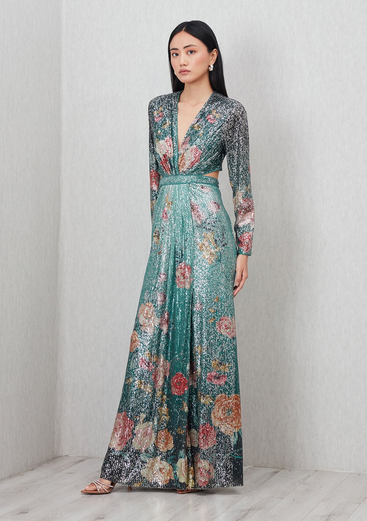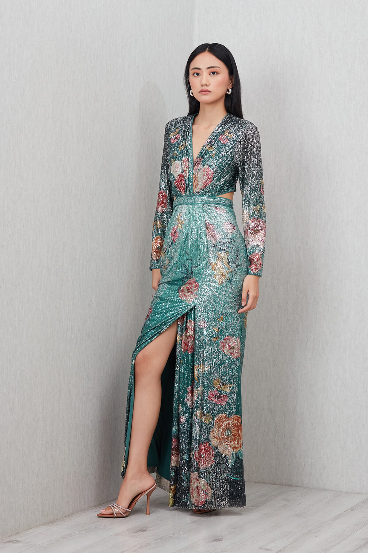 Cut to command attention, nora gown is designed in high-shine sequin fabric with a deep plunge neckline, defined waist, and sharp cut-outs at the back. The print merges scattered florals with a teal to dark ombré base, catching light from every angle. Full sleeves balance the skin-baring cut, while the front slit keeps the silhouette light and sleek. Meant for the nights that start with a toast and end on the dance floor. Perfect for your birthday night out or a destination event where the dress needs no introduction.