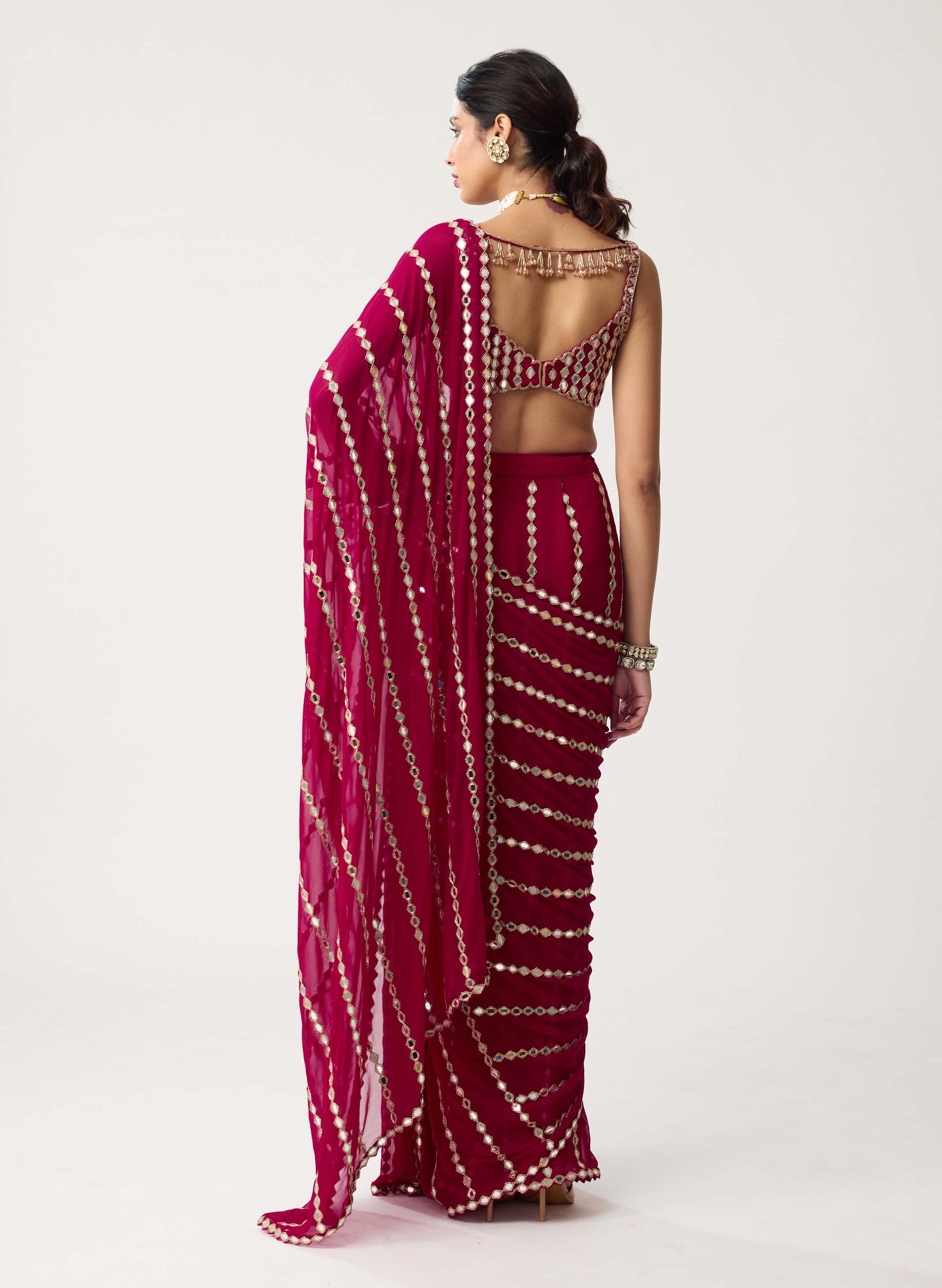 Vibrant and sculptural, this ruby red georgette sari is defined by its linear mirror embroidery. The sleeveless blouse complements the sleek contours of the drape, radiating confidence and allure. Perfect for weddings, sangeet nights, or high-end festive gatherings.
