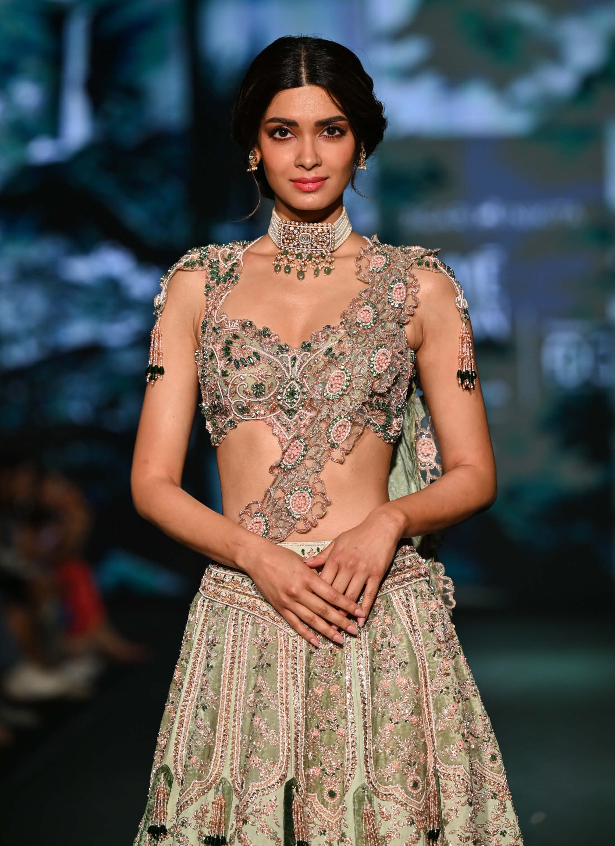 A couture expression in green lily with deep pine green undertones crafted in habutai silk with velvet appliqué and intricate hand embroidery. Accented with playful tassels and a statement belt the net blouse features crystal highlights and tasselled sleeves.