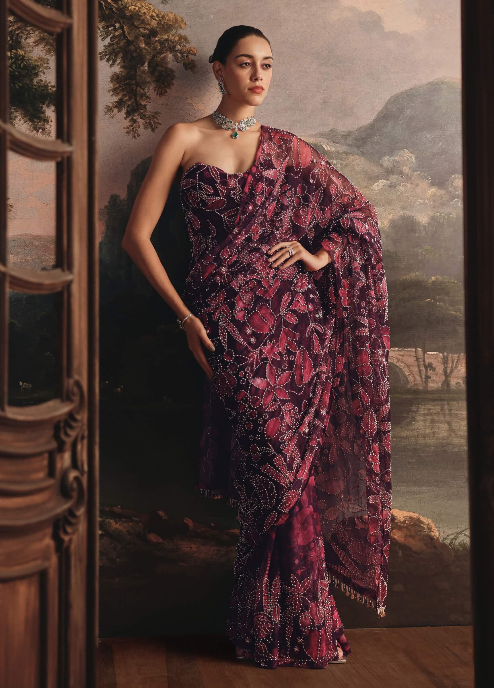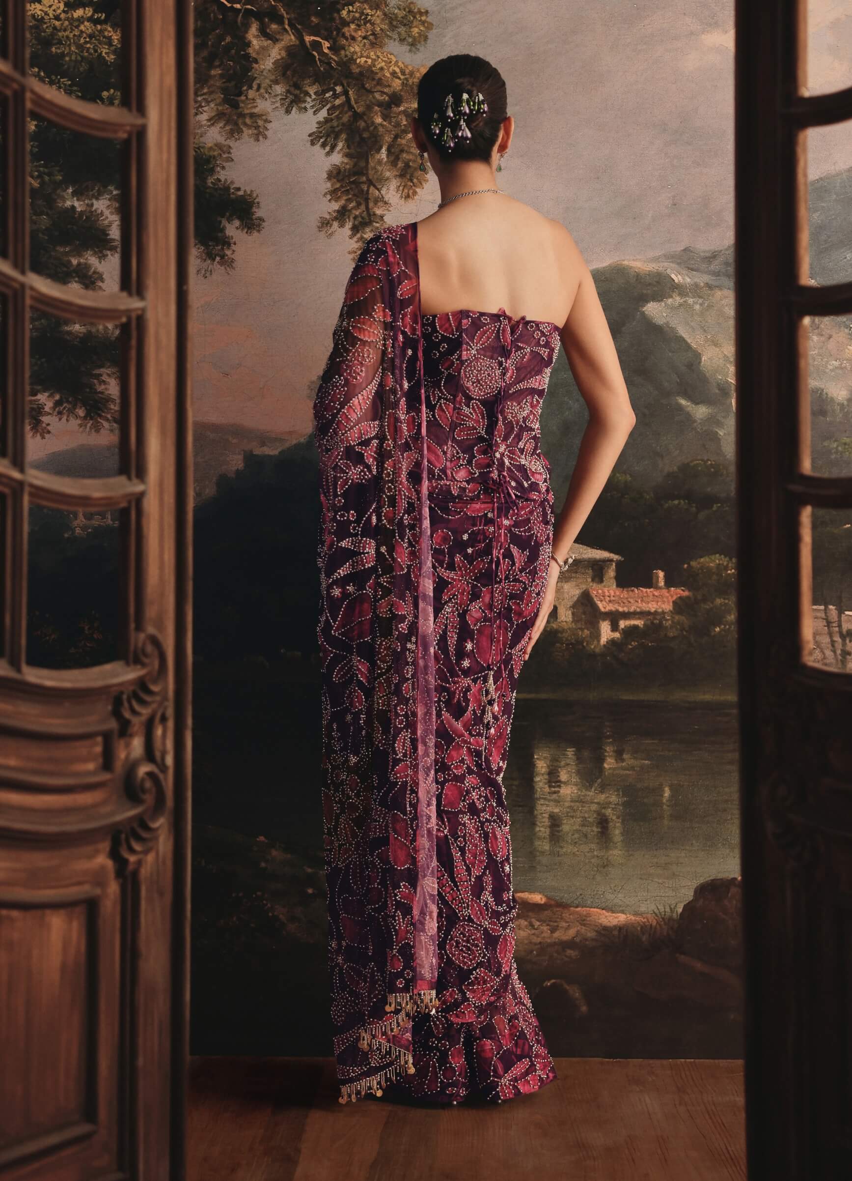 Draped in timeless allure, this printed net sari commands attention with its deep maroon base and blush floral motifs. Golden bead embroidery traces every fold, shimmering with quiet opulence. Paired with a structured corset blouse, it redefines evening elegance — where modern femininity meets classic refinement.
