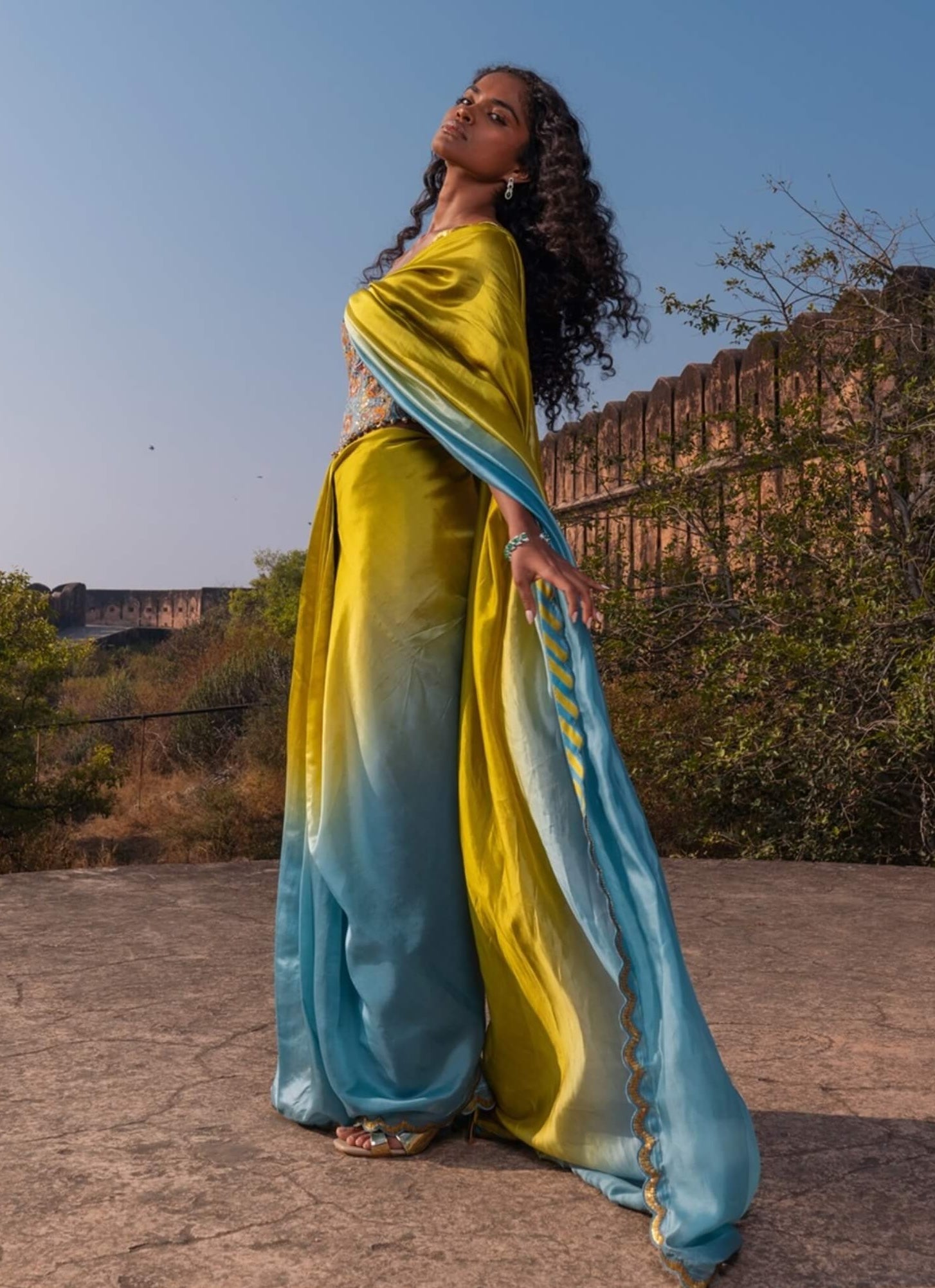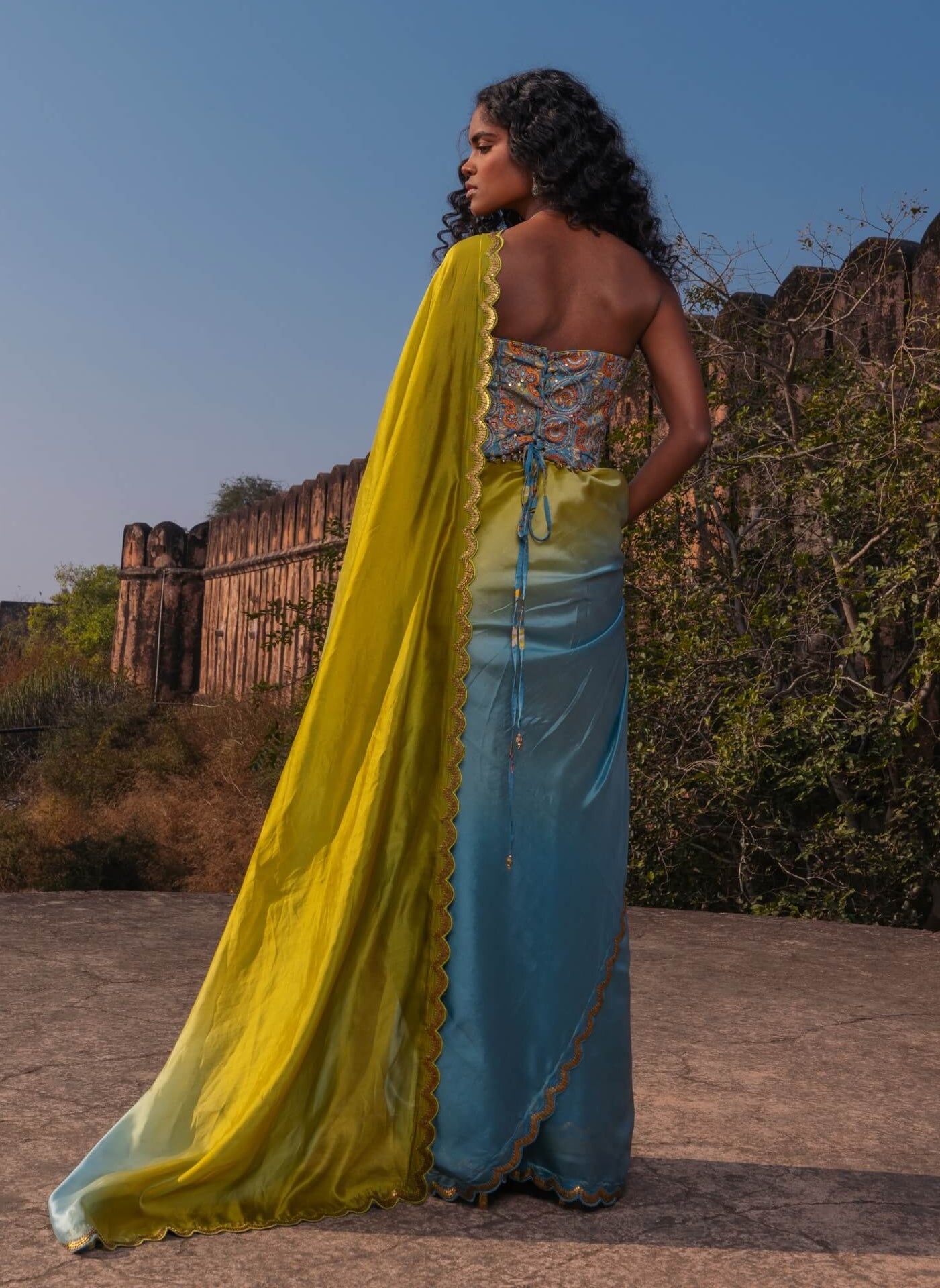 A refined take on modern elegance, this dry henna and mist blue ombre sari is crafted in airy silk organza with delicate coin scallop edging. Paired with a sculpted satin silk corset.