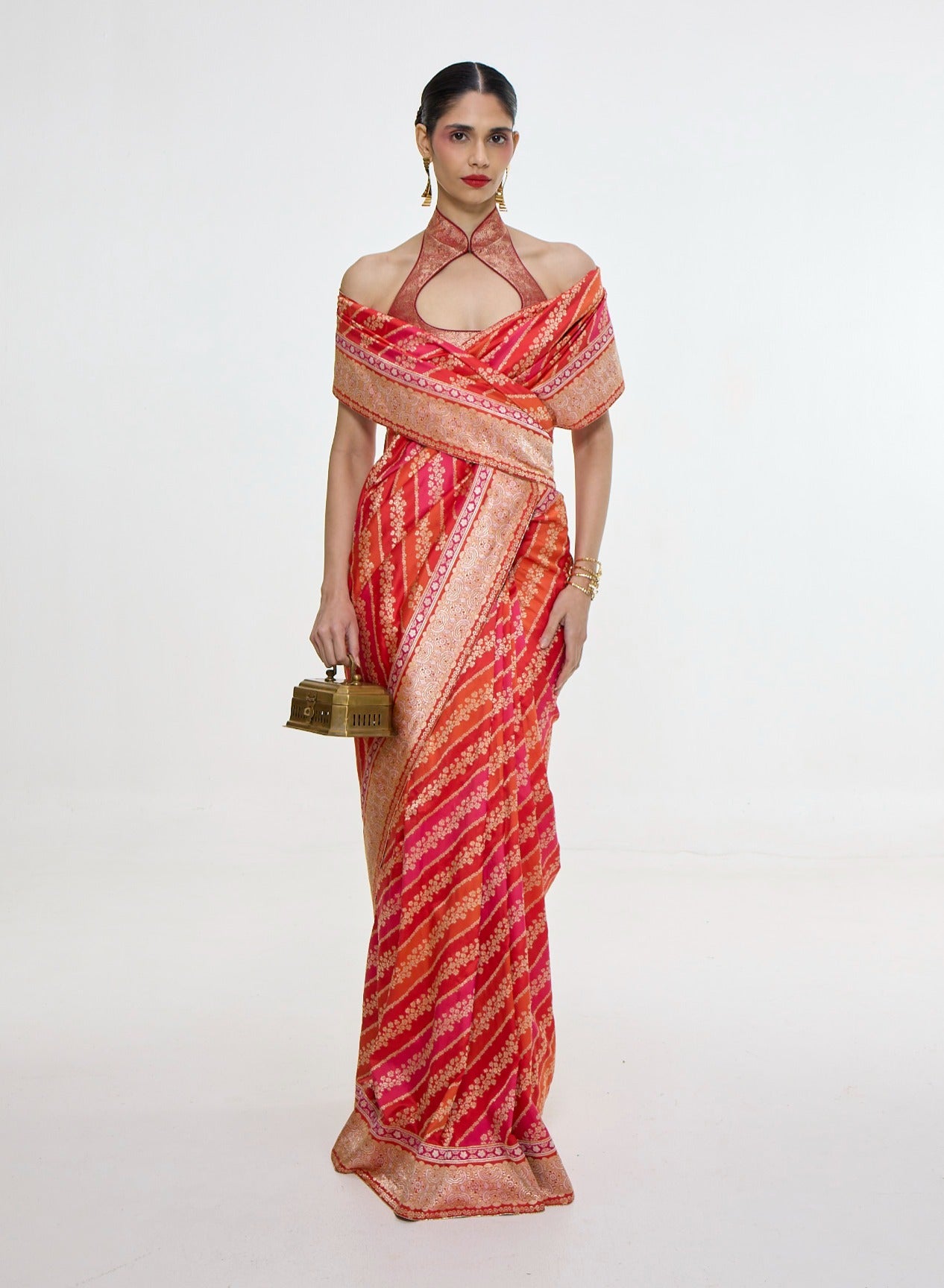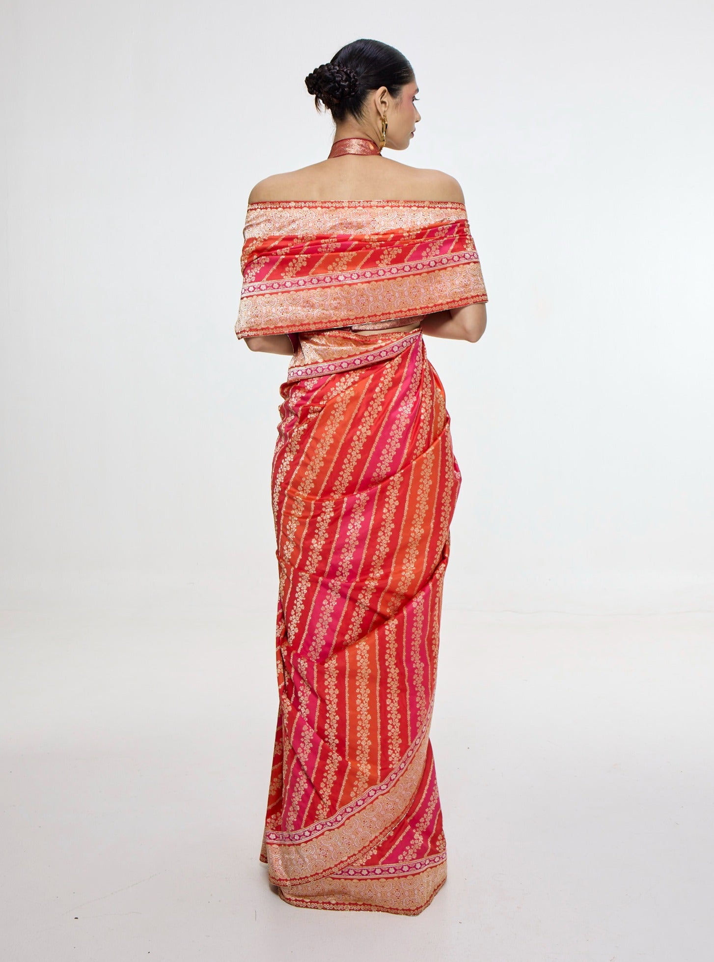 Immerse yourself in radiant elegance with this carmine red mashroo silk sari, handwoven in the kadhwa banarasi technique. Featuring delicate oriental-inspired motifs and a soft, fluid drape, it blends tradition with contemporary flair. Perfect for wedding occasions, diwali celebrations, or grand festive gatherings, it elevates every ensemble. Experiment with a kimono-style drape for a modern twist.