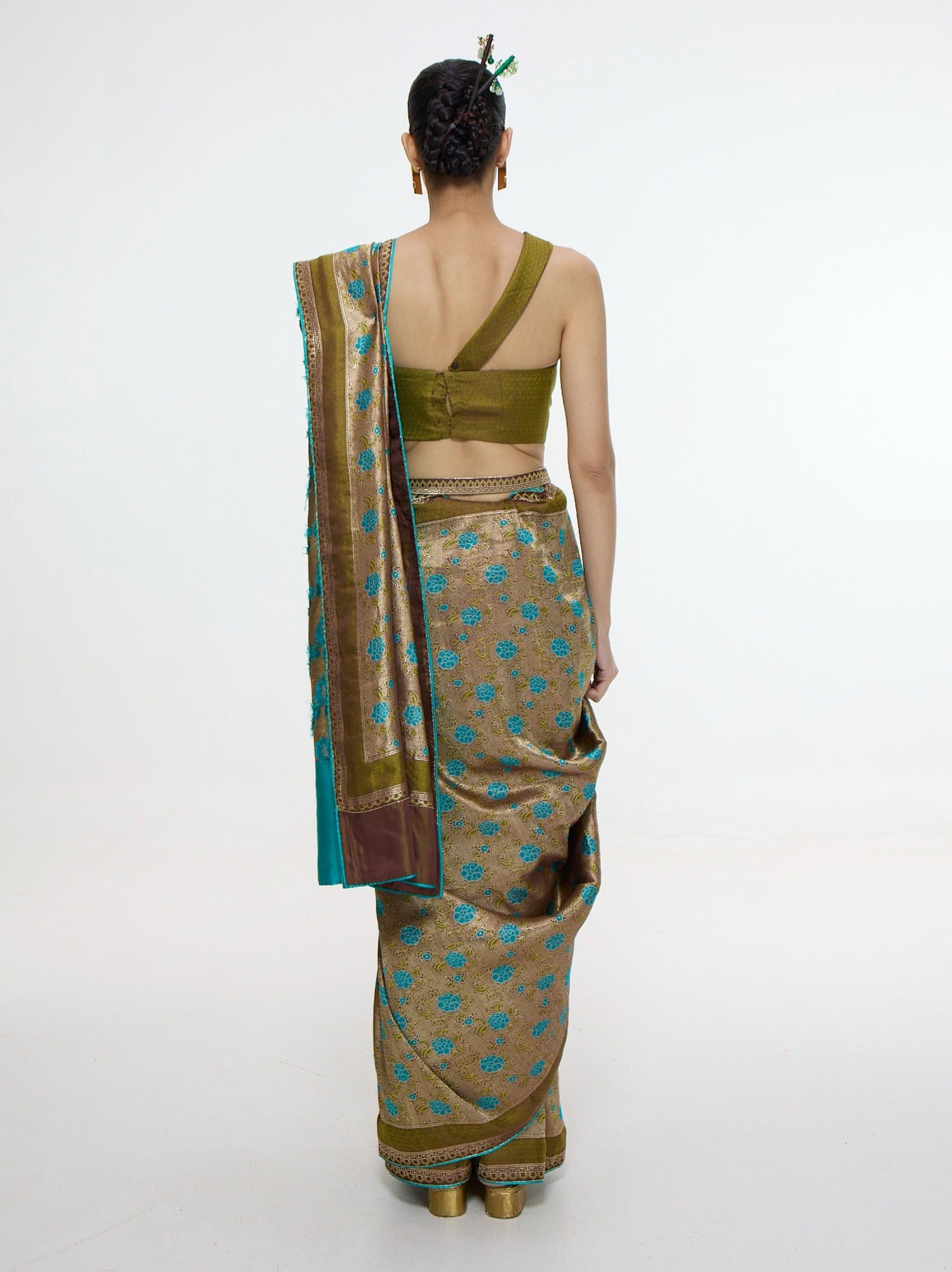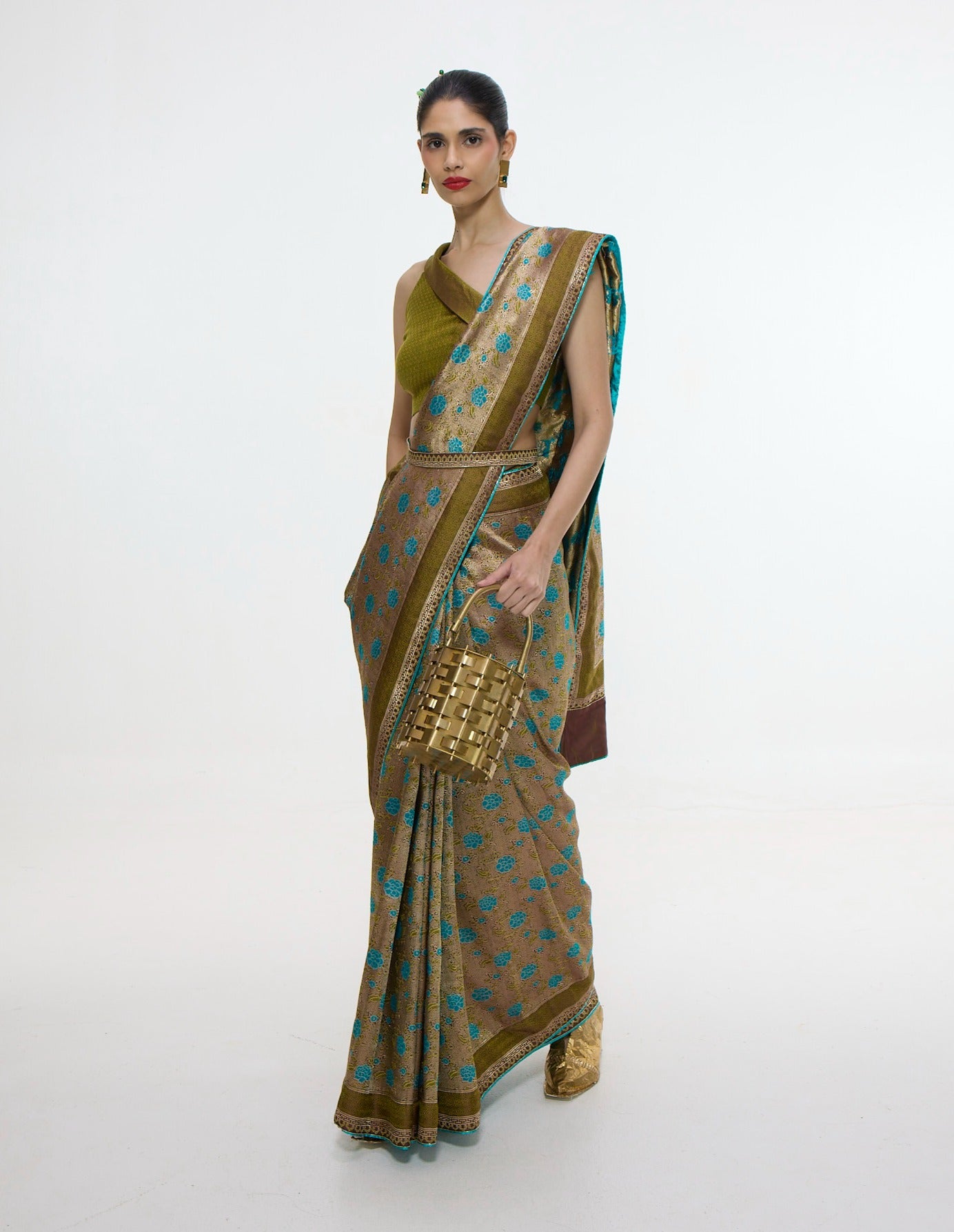 Handwoven in the Banarasi embossed technique, this olive green satin silk sari drapes with exceptional fluidity, offering endless possibilities for styling. Whether paired with a belt, a structured blouse, or even a crisp white shirt, it promises a fresh, modern take on festive wear, perfect for cocktails, Diwali parties, and wedding celebrations.
