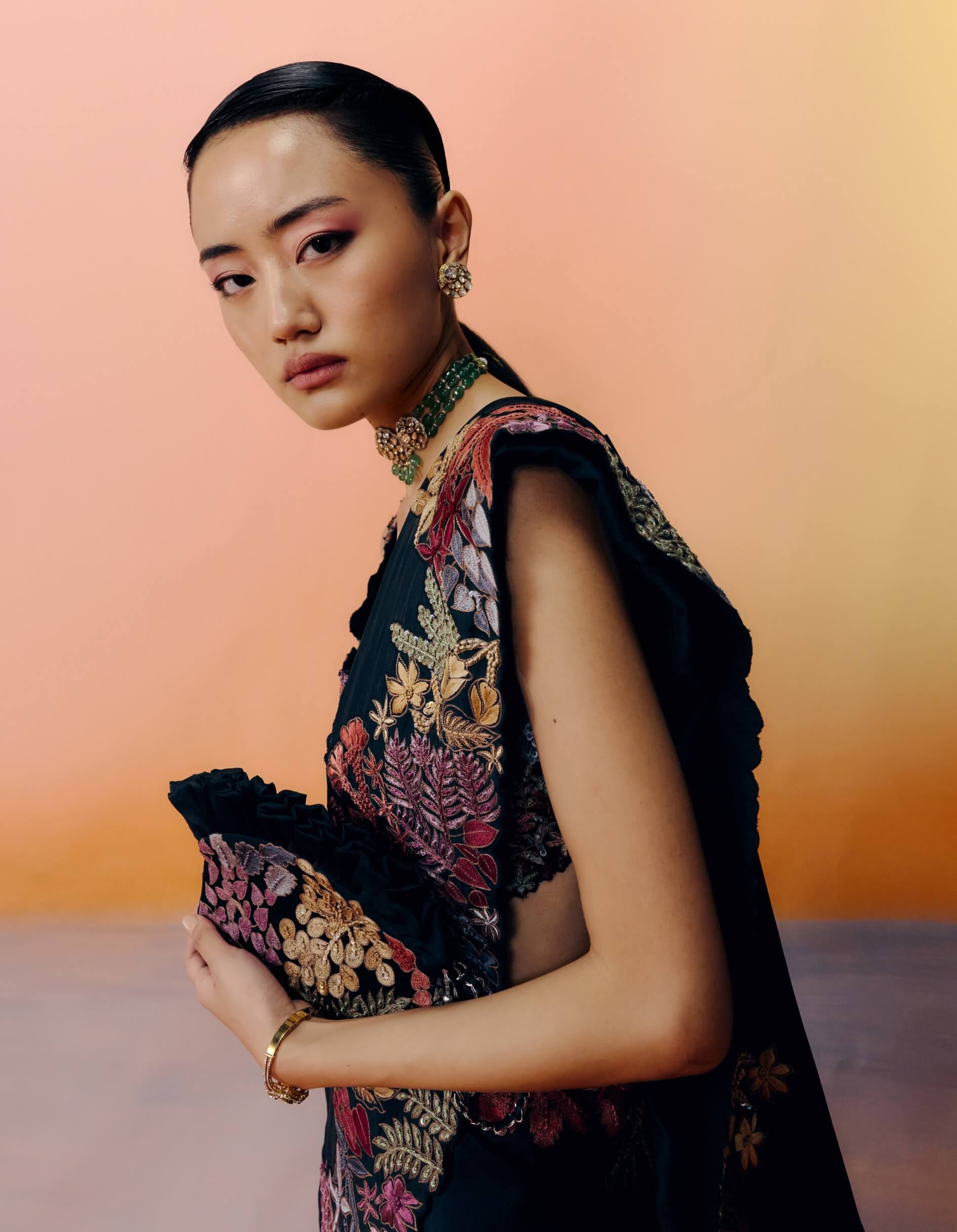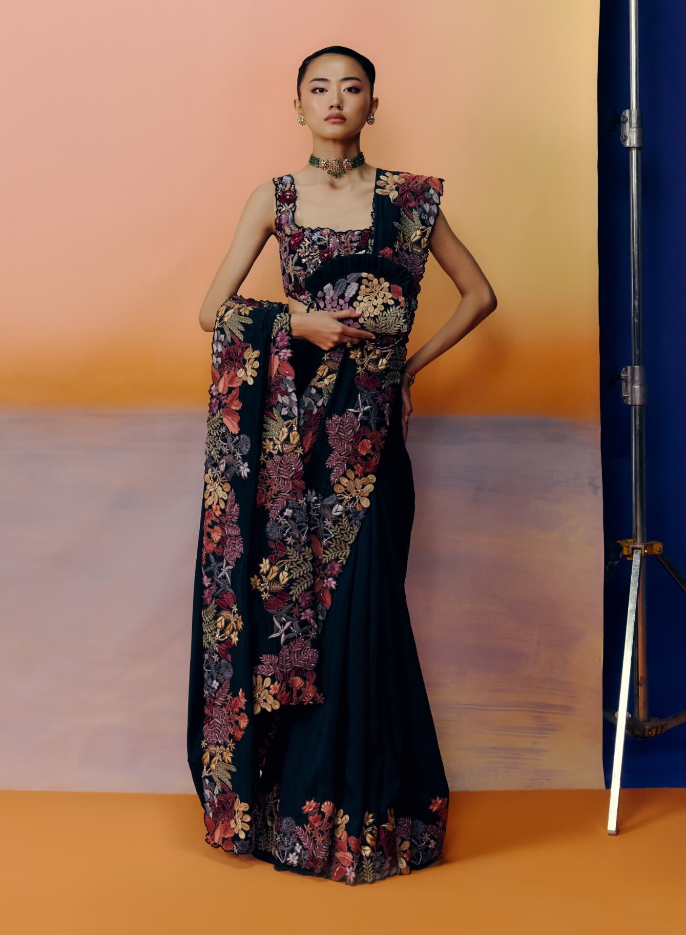 Wrapped in artistry, this black sari blooms with wild abandon. Featuring multicolour assorted leaves and a wildflower mix border, it redefines botanical elegance. Paired with a matching blouse, this ensemble offers structure with softness. The embroidery adds visual rhythm and vibrant charm. A standout choice for receptions, art gallery evenings, or day weddings.