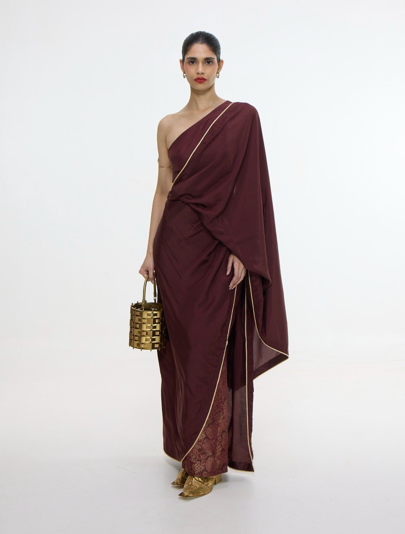 A seamless blend of ease and opulence, this pre-draped mashroo silk sari set features a handwoven silk petticoat that doubles as a sculpted skirt, paired with a fluid silk drape detailed along the borders. Effortlessly transitioning between traditional and contemporary, it is perfect for cocktails, festive dinners, and Diwali parties styled with crisp shirts or modern corsets.