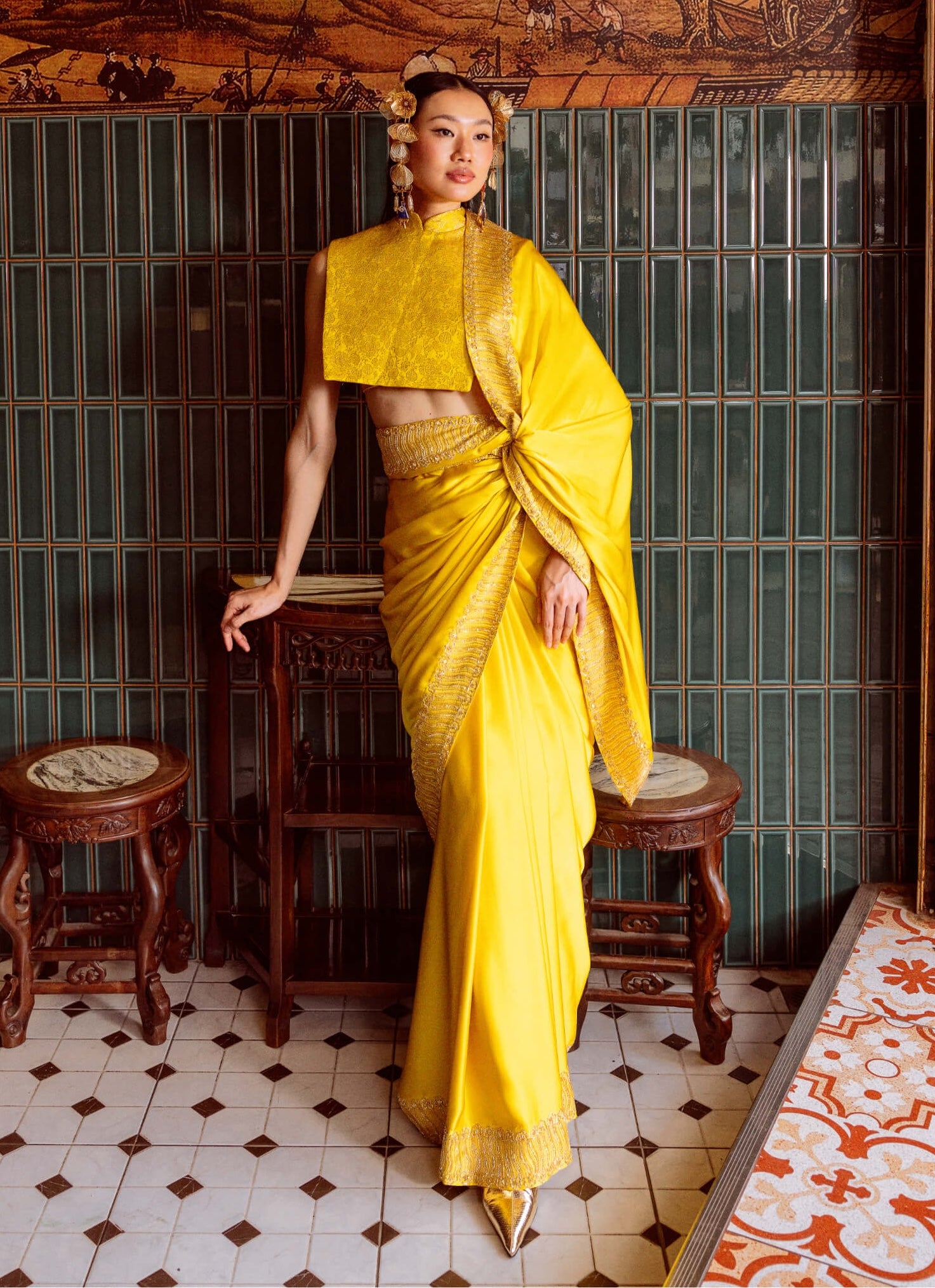 Glowing with warmth and refinement, this yellow ochre mashroo silk sari brings heritage to life. Its embroidered oriental border and fluid drape create an effortless statement of luxury. Perfect for festive celebrations, haldi ceremonies, or daytime weddings, it’s designed for the woman who celebrates color with grace.