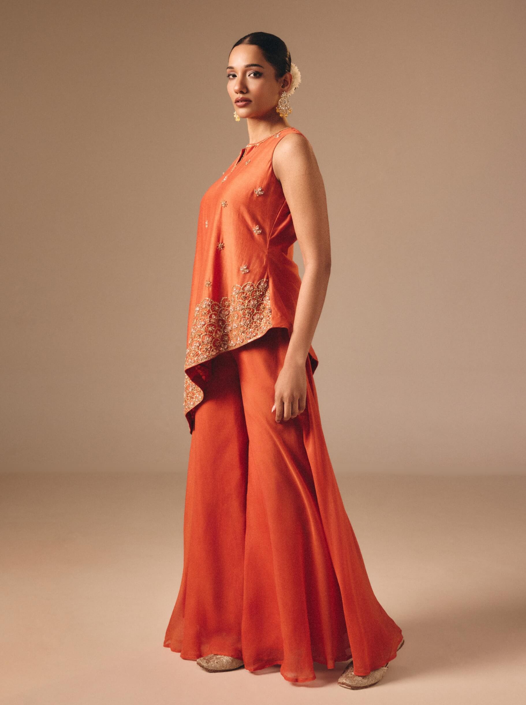Radiating festive warmth, this burnt orange silk ensemble is elevated with crystal, sequin, and cutdana embellishments layered over satin organza. Ideal for festive evenings.